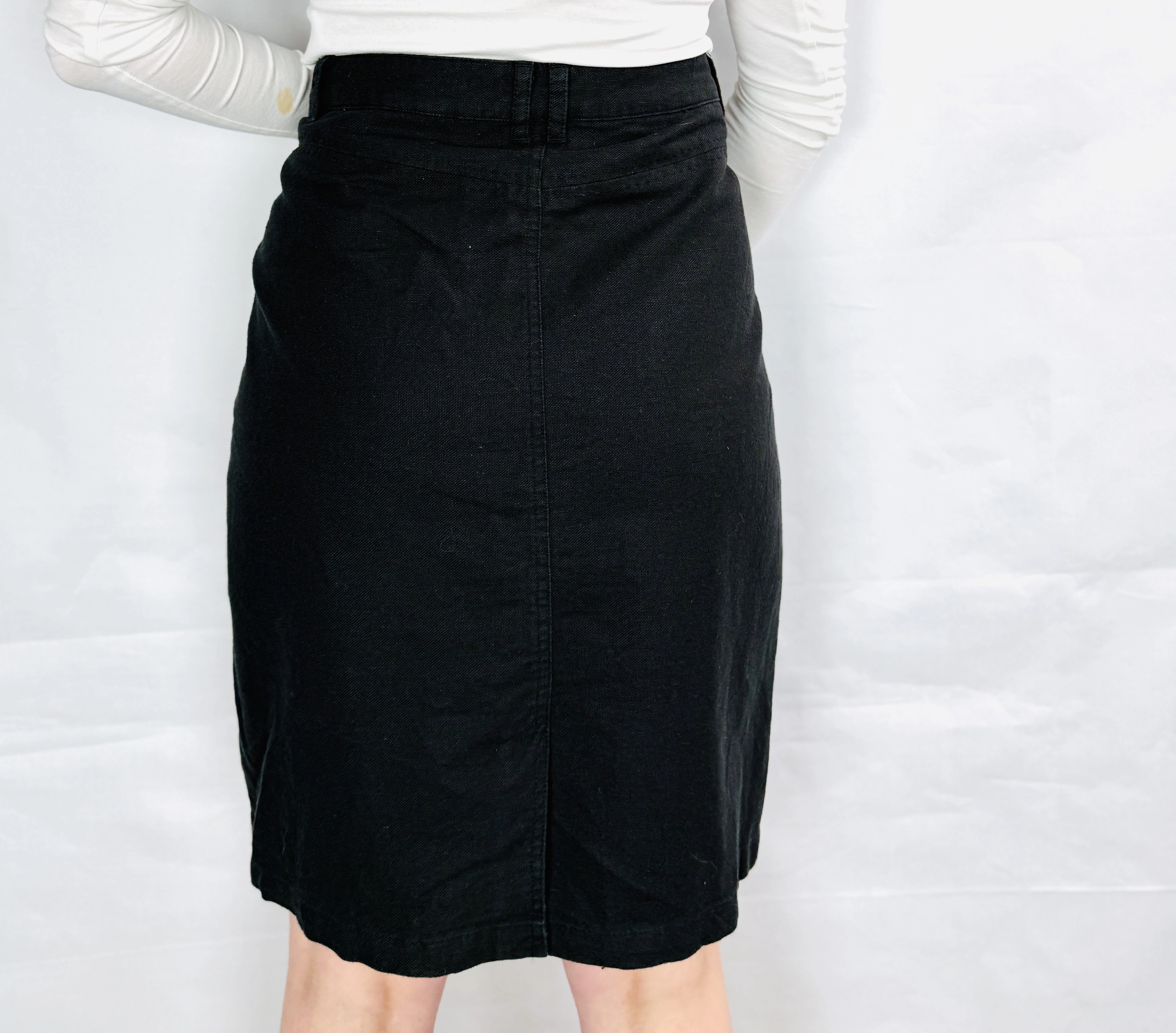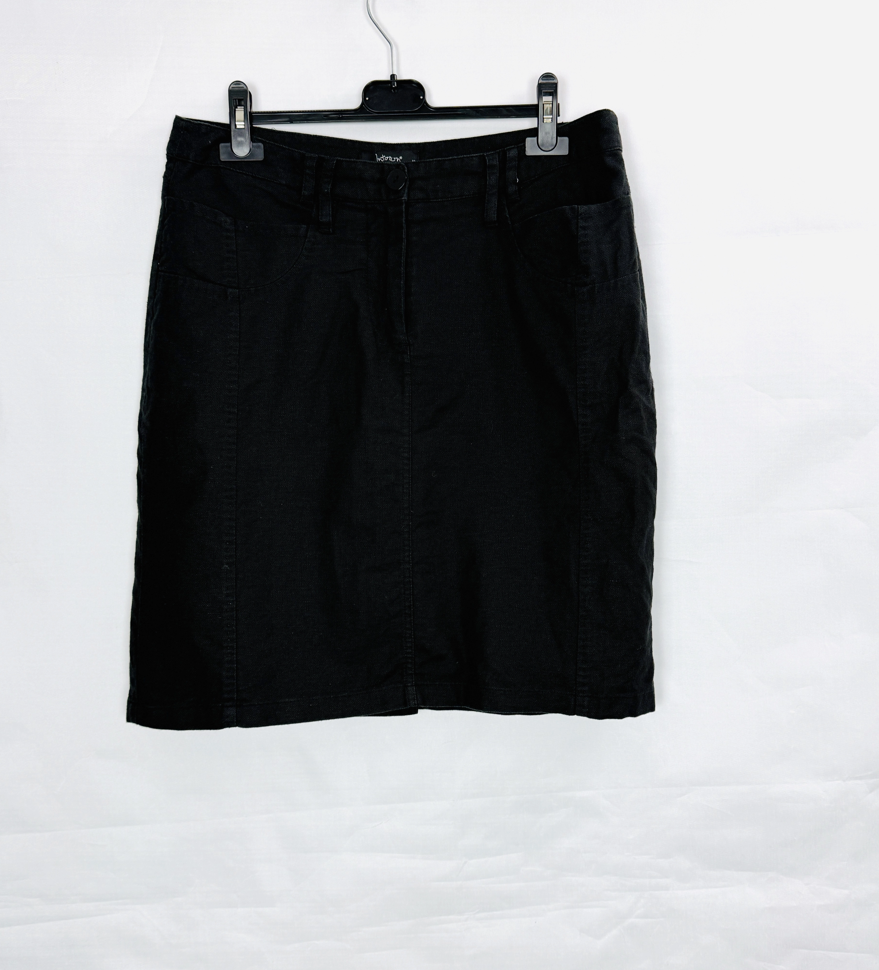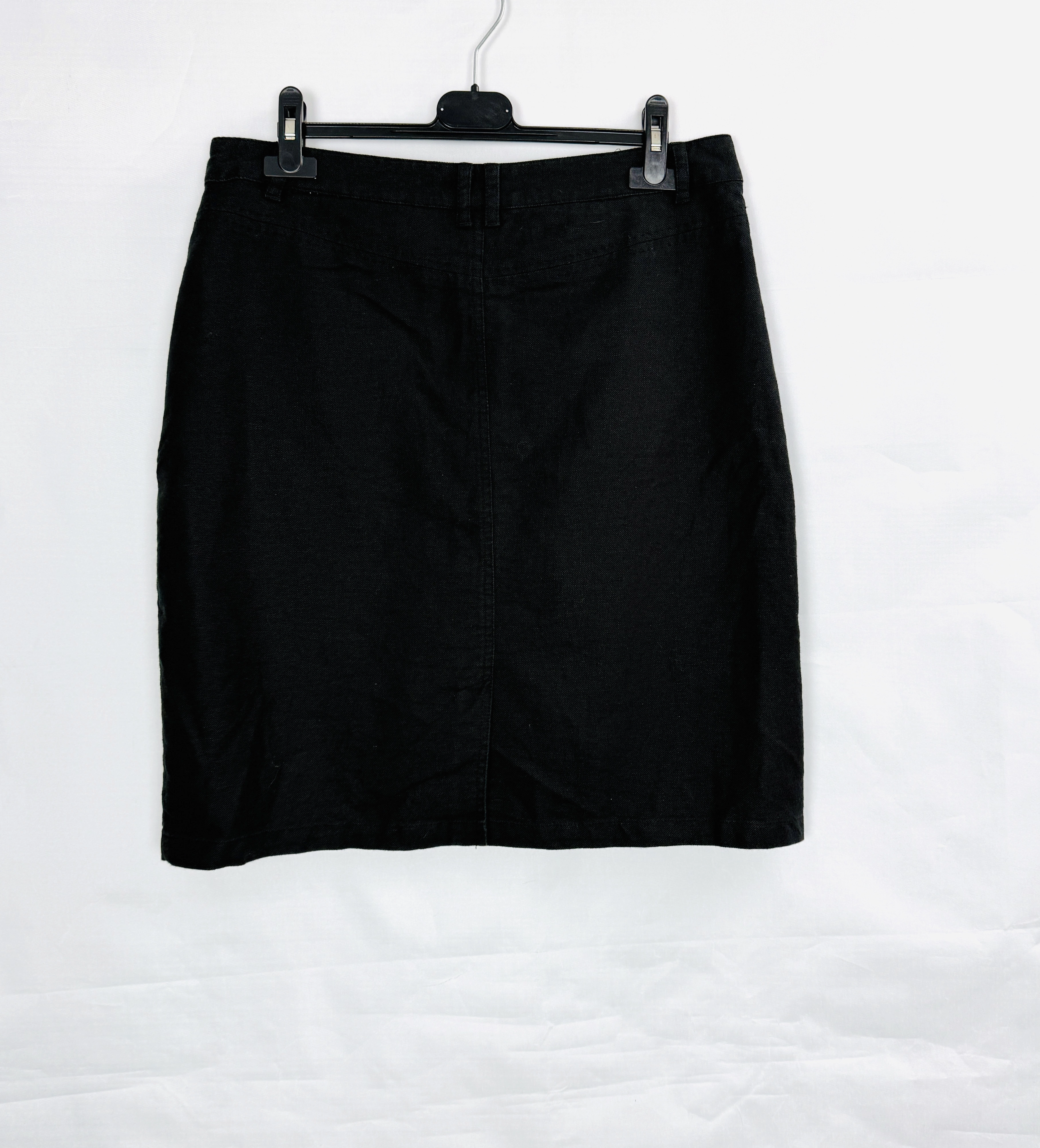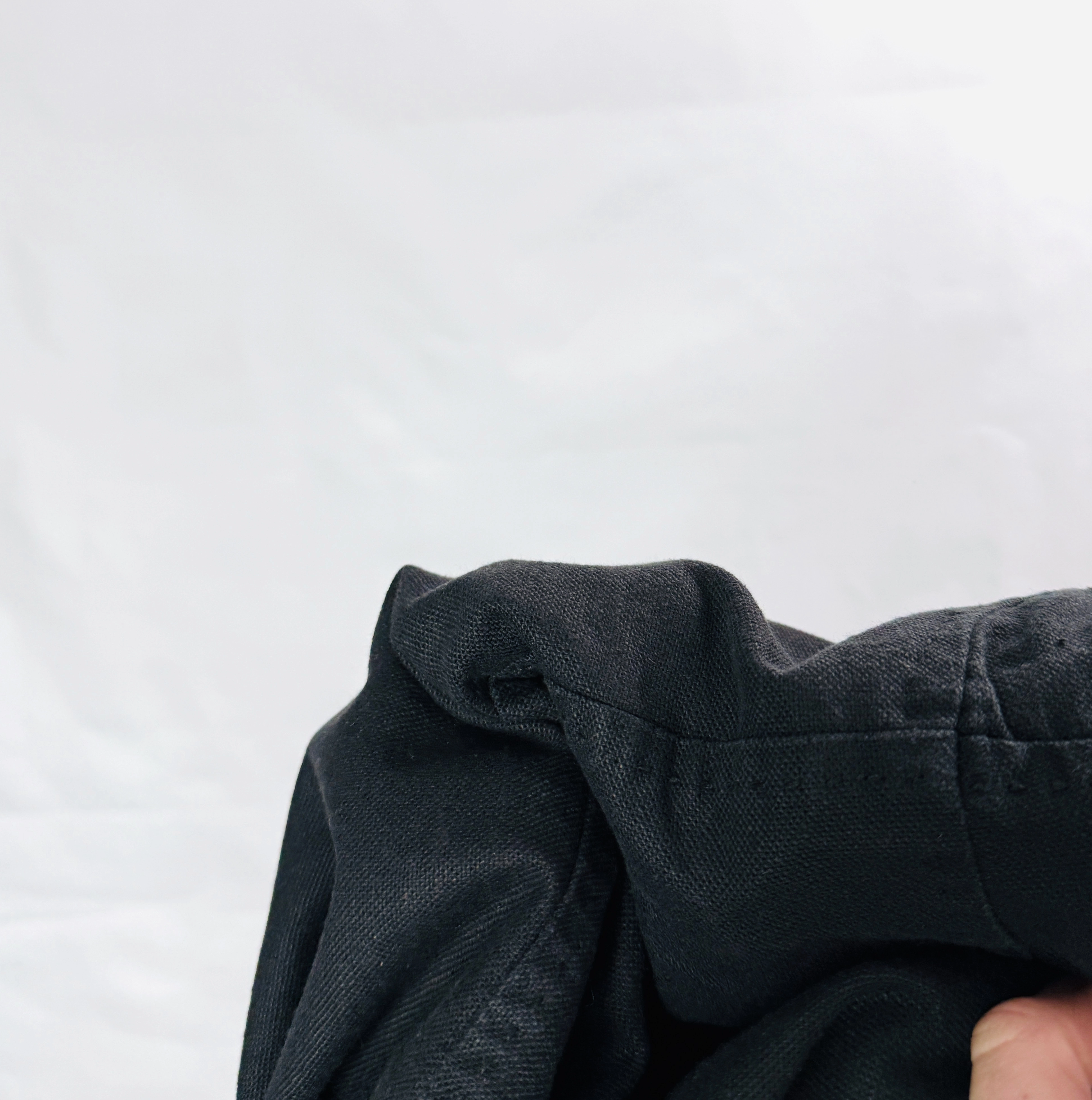 Materiał, z którego wykonano spódnicę, jest lekki i zwiewny, o charakterystycznej dla lnu, delikatnie nieregularnej strukturze, która podkreśla szlachetny rodowód ubrania. Tkanina jest matowa i przyjemnie chłodna w dotyku, co gwarantuje najwyższy komfort noszenia nawet w największe upały. Dzięki swojej strukturze spódnica trzyma formę, a jednocześnie miękko pracuje przy każdym ruchu, tworząc naturalne, estetyczne załamania, które dodają stylizacji autentyczności. Głęboka czerń materiału jest trwała i nasycona, co sprawia, że całość prezentuje się bardzo nowocześnie i z klasą, zachowując przy tym swoją naturalną lekkość.