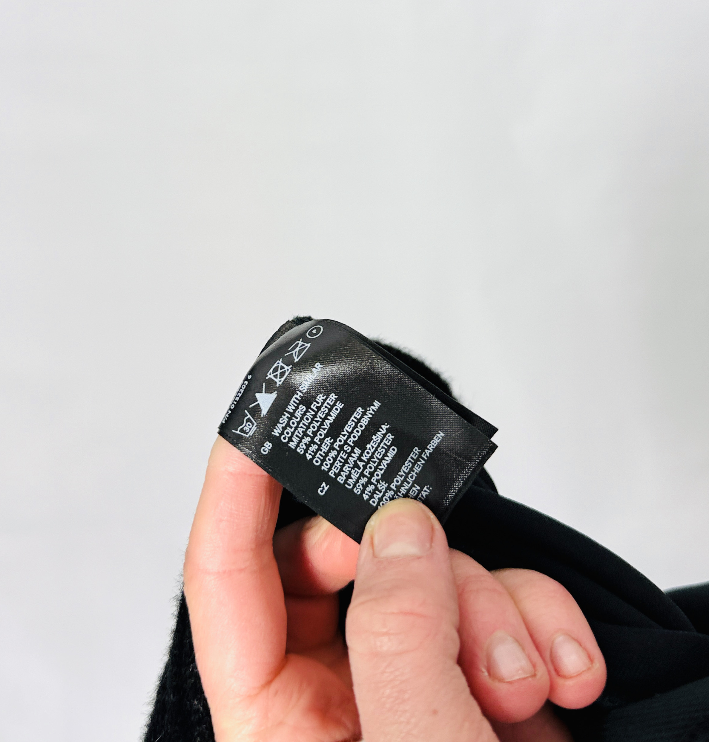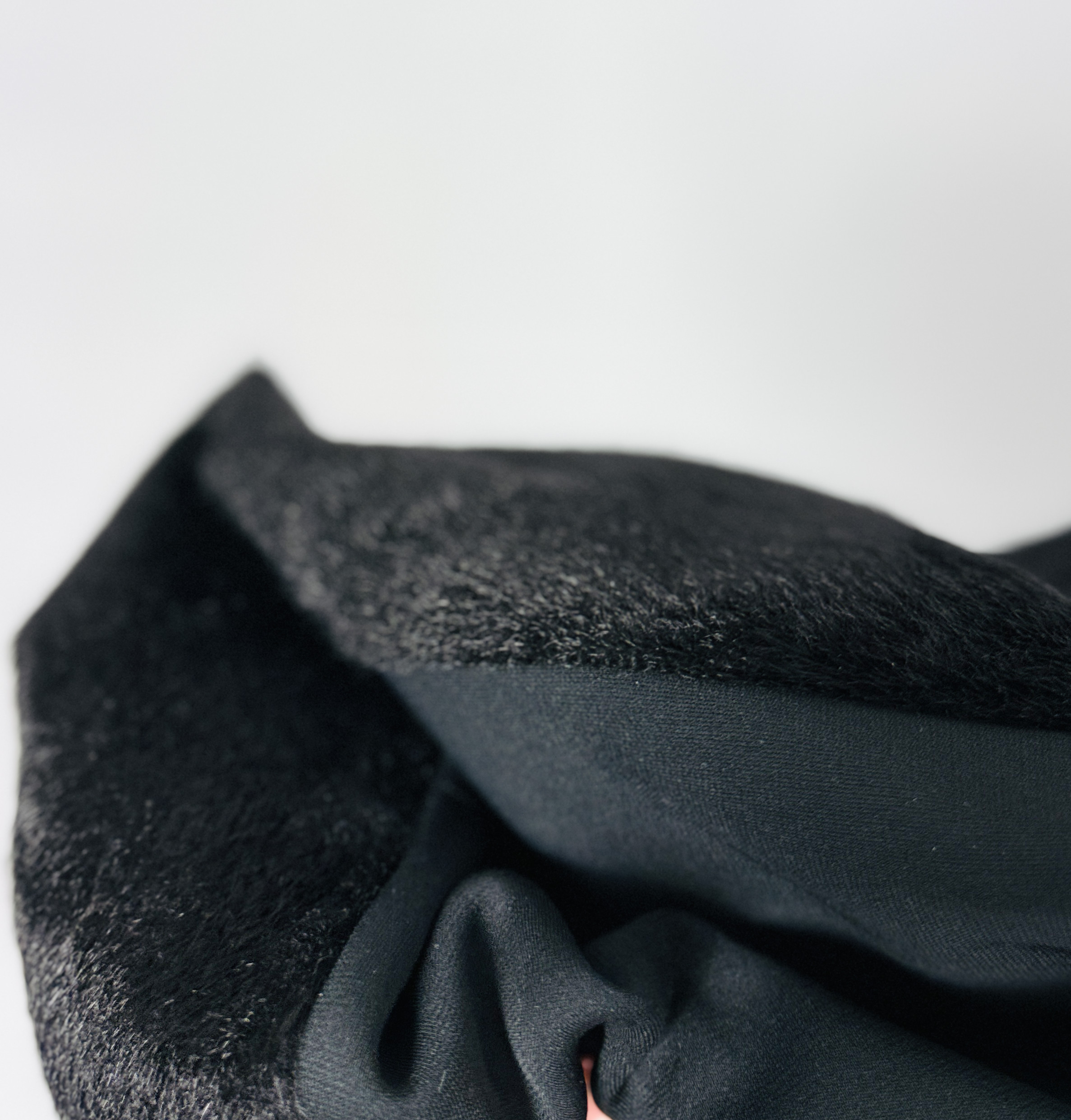 Materiał wygląda na mięsisty, przyjemnie układający się w miejscach zgięć; przód prezentuje lekko puszystą fakturę, która dodaje ciepła i tactile’owego uroku, podczas gdy tył zachowuje gładkość i matowe wykończenie. Taka kombinacja faktur sprawia, że spódnica porusza się z gracją i ma ciekawą dynamikę wizualną — miękkość przodu łagodzi surowość linii, a gładki tył zapewnia uporządkowany, smukły profil. Delikatne zagniecenia przy kolanach świadczą o naturalnej elastyczności i komforcie noszenia.