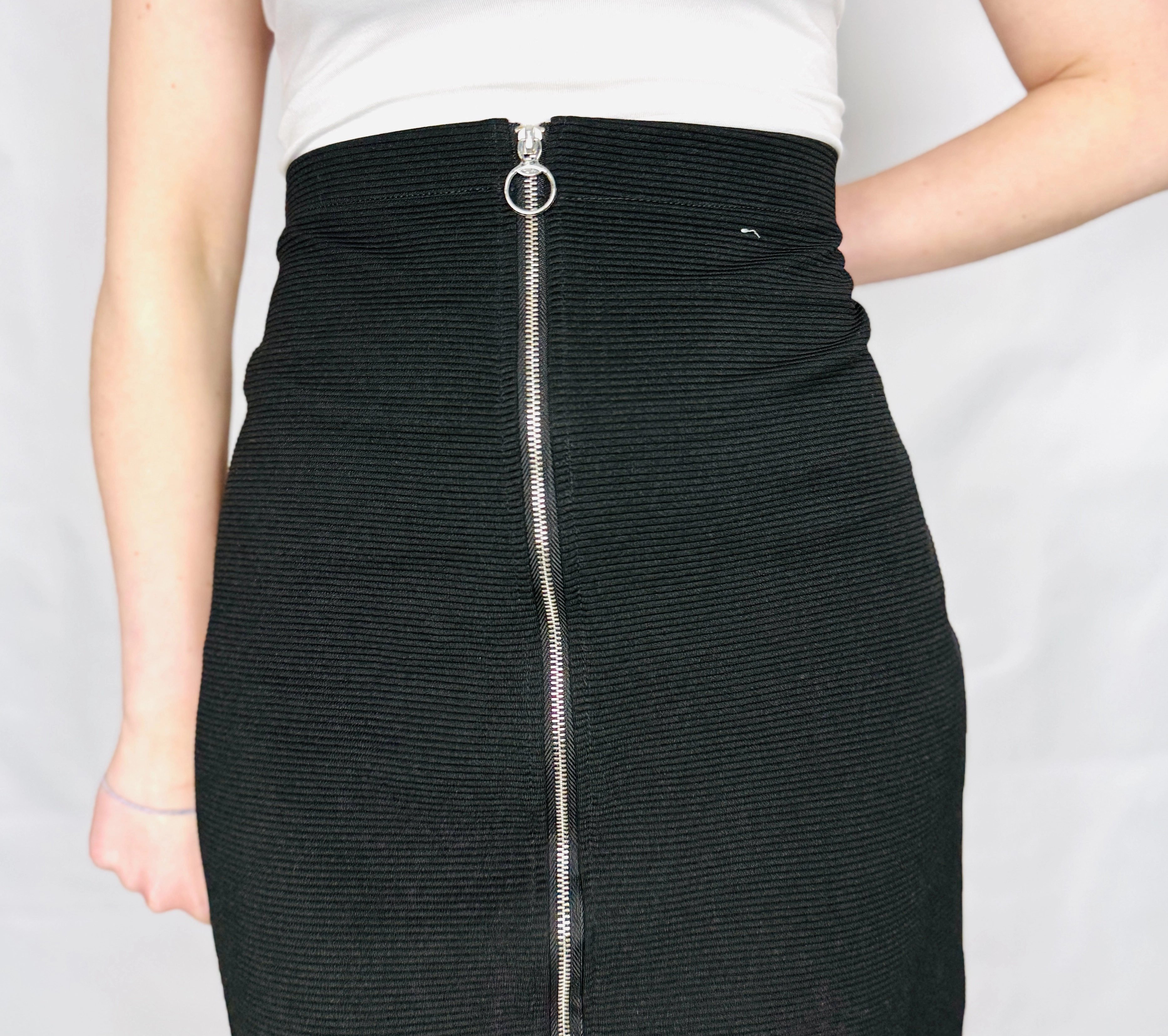 To spódnica o zdecydowanym, kobiecym wyrazie — głęboka, czarna tonacja nadaje jej eleganckiej i jednocześnie nowoczesnej aury, a pionowy zamek z ozdobnym ringiem staje się subtelnym, odważnym akcentem, który nadaje projektowi charakteru. Forma jest stonowana i wyrafinowana; to model, który łączy klasyczną prostotę ołówkowego kroju z lekką nutą współczesnej zmysłowości, oferując zarówno szyk, jak i pewność siebie w codziennych i bardziej formalnych sytuacjach.