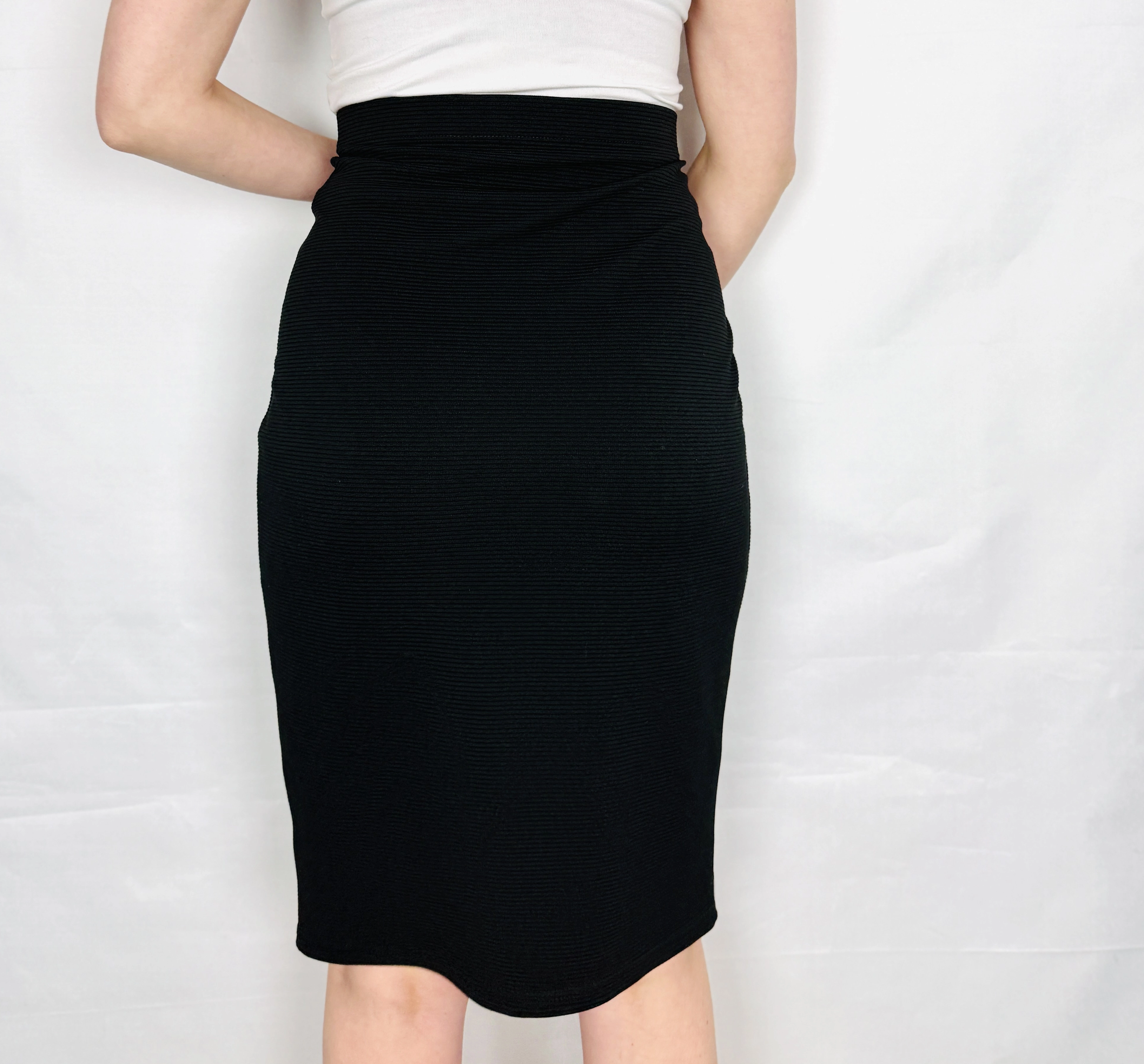 Materiał wydaje się gładszy i delikatnie prążkowany, o subtelnej strukturze, która dodaje tkaninie wyrazu bez przesady. Wykończenie wygląda na elastyczne i miękko układające się, co pozwala na wygodne dopasowanie w talii i swobodne podążanie za ruchem ciała. Tekstura wprowadza dyskretną głębię, a ciemna barwa potęguje efekt schludnej, uporządkowanej powierzchni, co czyni spódnicę idealną bazą do tworzenia zarówno stonowanych, jak i bardziej zdecydowanych stylizacji.