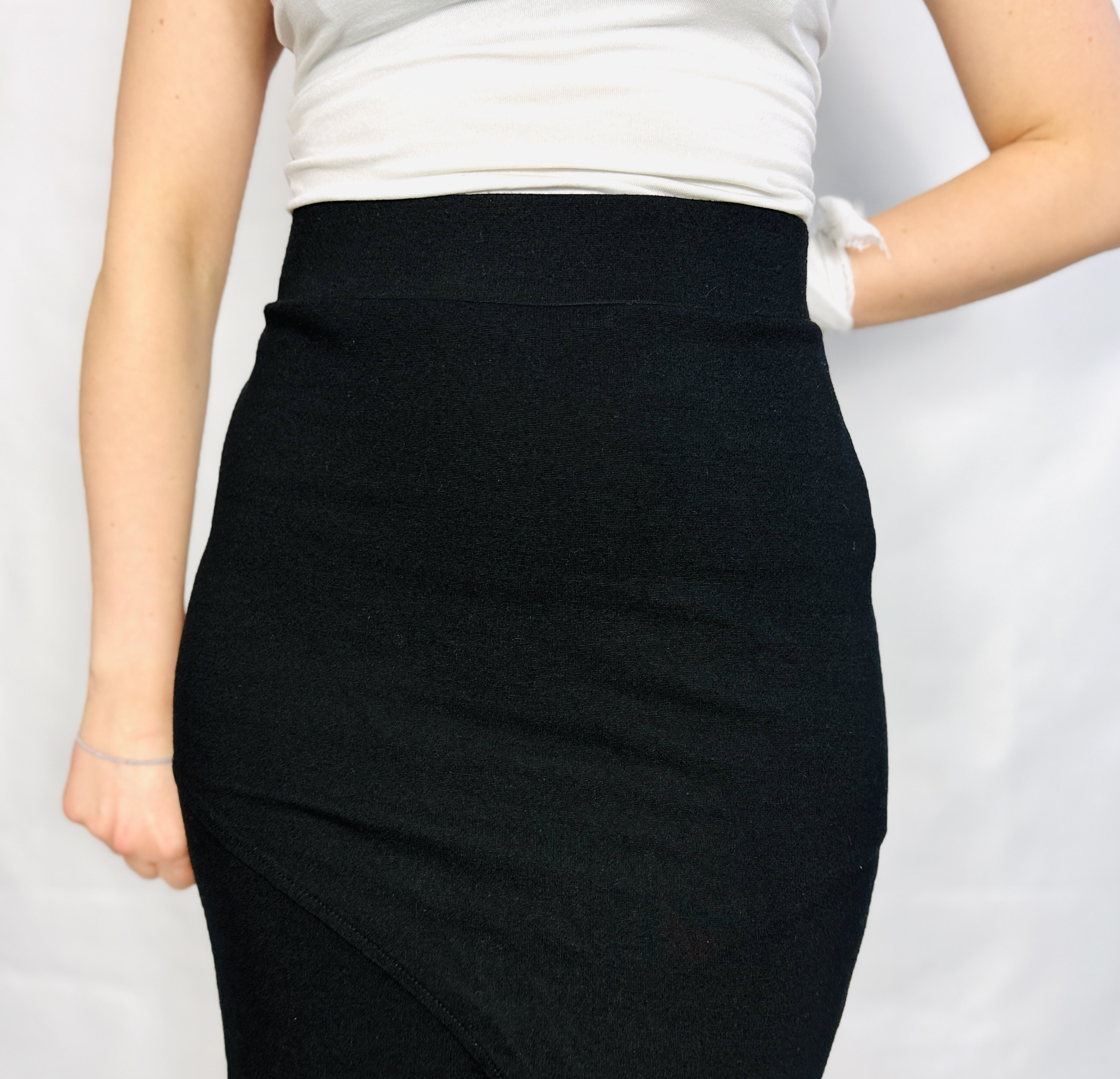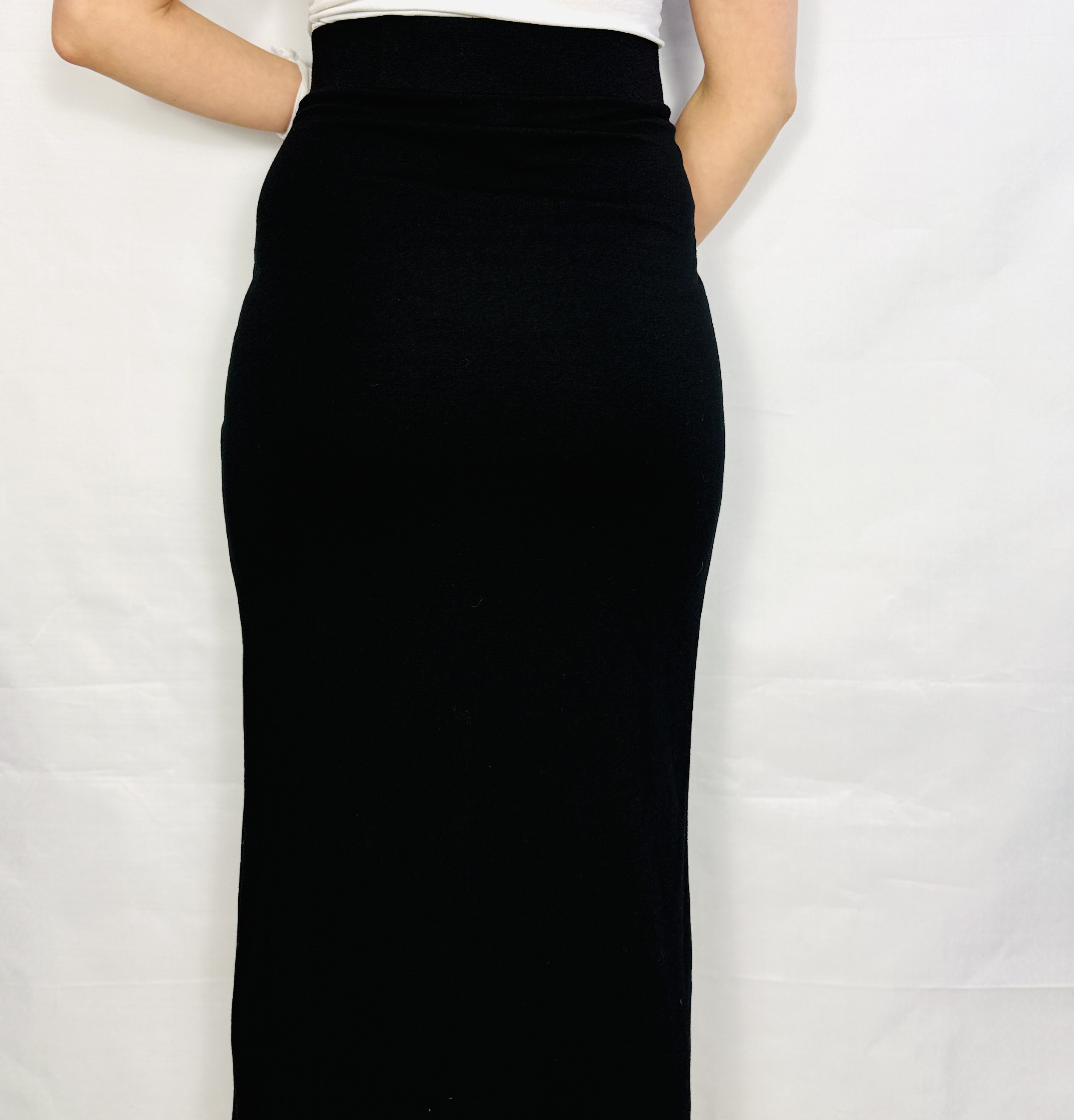 Materiał prezentuje się jako gładki, lekko elastyczny i dobrze układający się, z matowym wykończeniem, które potęguje efekt wysmuklenia. Tkanina równomiernie otula sylwetkę, modelując ją bez nadmiernego opinania, co zapewnia komfort noszenia oraz schludny rys konstrukcji. Dzięki umiarkowanej elastyczności spódnica podąża za ruchem, a jednocześnie zachowuje porządek formy — pas pozostaje płaski i elegancki, natomiast rozcięcie otwiera się dyskretnie podczas kroku, wprowadzając subtelny rytm.