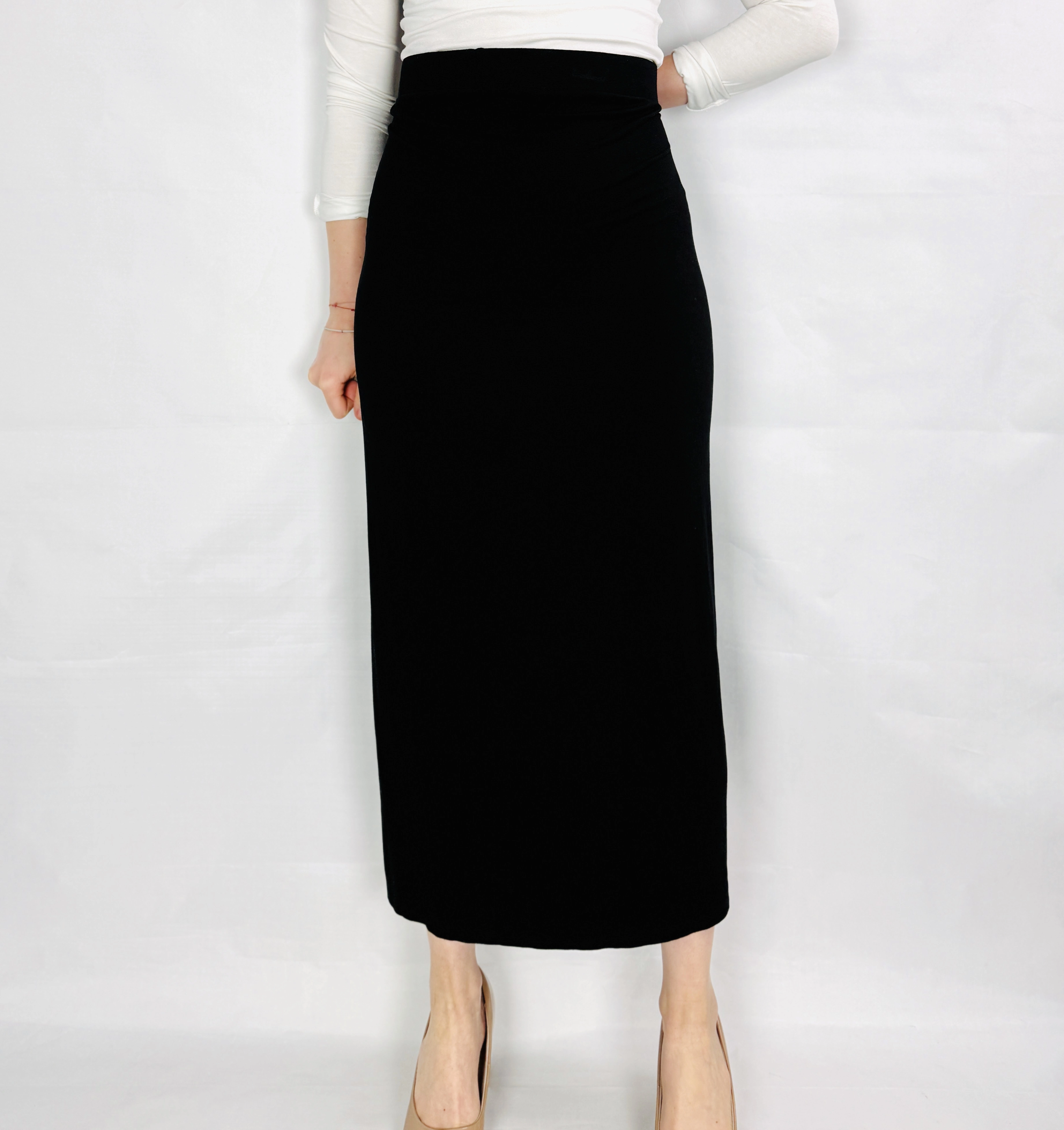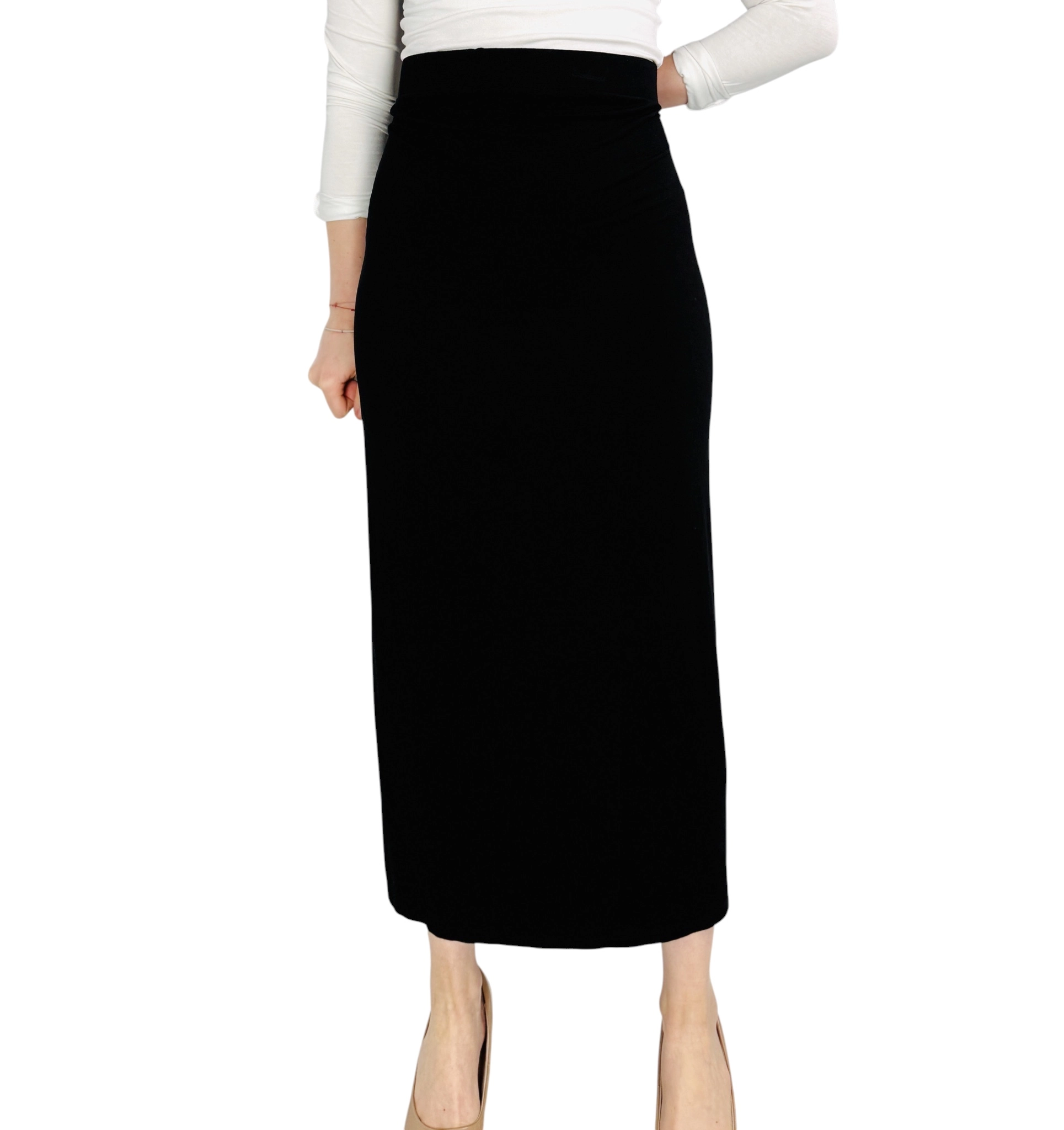 Fason spódnicy jest dopasowany, ołówkowy, co pięknie podkreśla linię bioder i talii, wysmuklając sylwetkę i nadając jej harmonijnych proporcji. Materiał prezentuje się jako gładki, lekko elastyczny, co zapewnia komfort noszenia i swobodę ruchów, a jednocześnie zachowuje elegancki, schludny wygląd. Długość maxi sięgająca do kostek dodaje całości wyrafinowania i sprawia, że spódnica świetnie sprawdzi się w wielu okazjach.