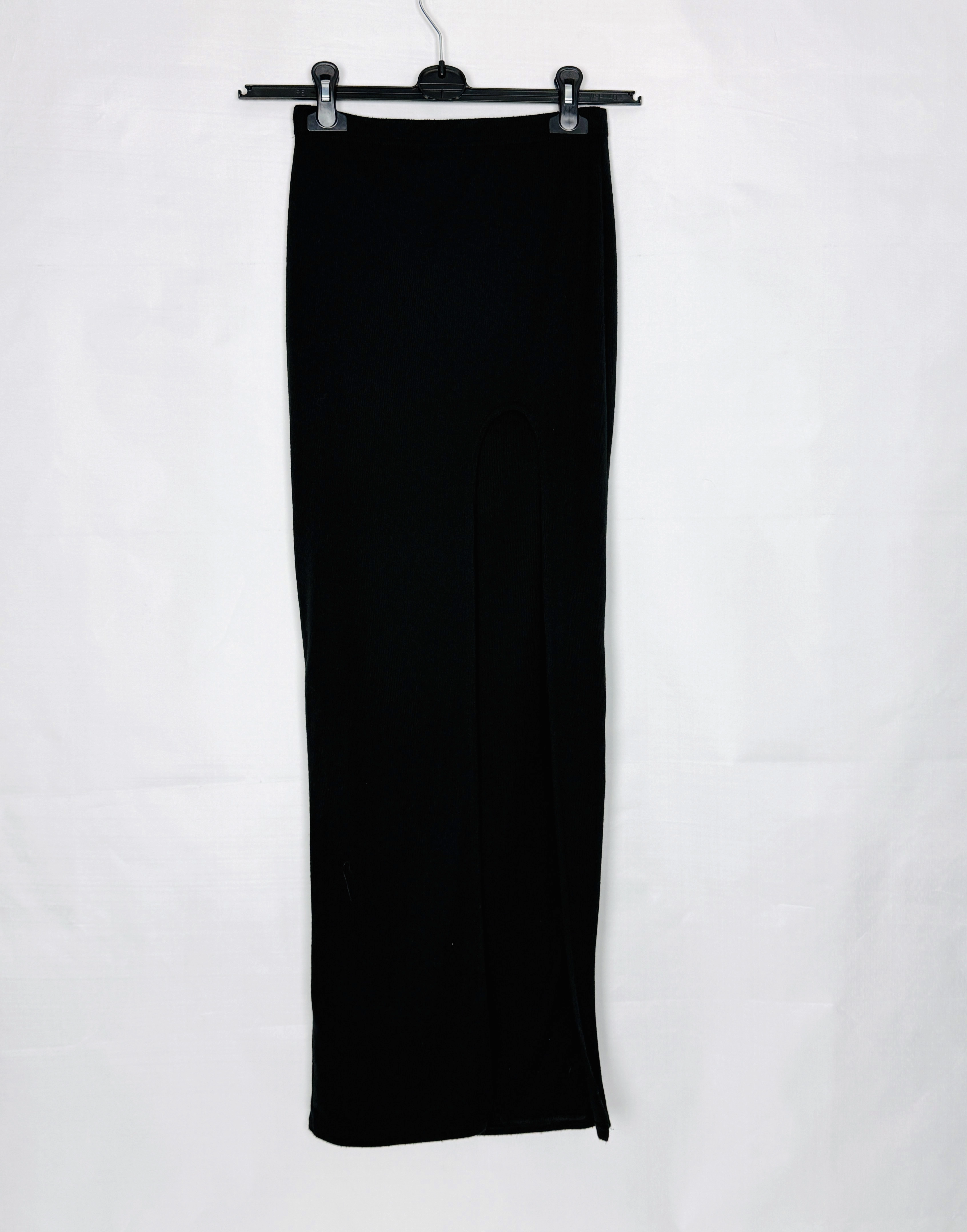 Fason jest dopasowany w górnej części, dzięki czemu pięknie podkreśla talię i biodra, a następnie miękko opada w dół, tworząc wydłużoną, smukłą linię sylwetki. Wysoki stan dodatkowo modeluje proporcje i optycznie wydłuża nogi. Charakterystycznym elementem jest wysokie rozcięcie z przodu, które nadaje całości lekkości i wprowadza subtelną nutę zmysłowości, jednocześnie zapewniając swobodę ruchu.