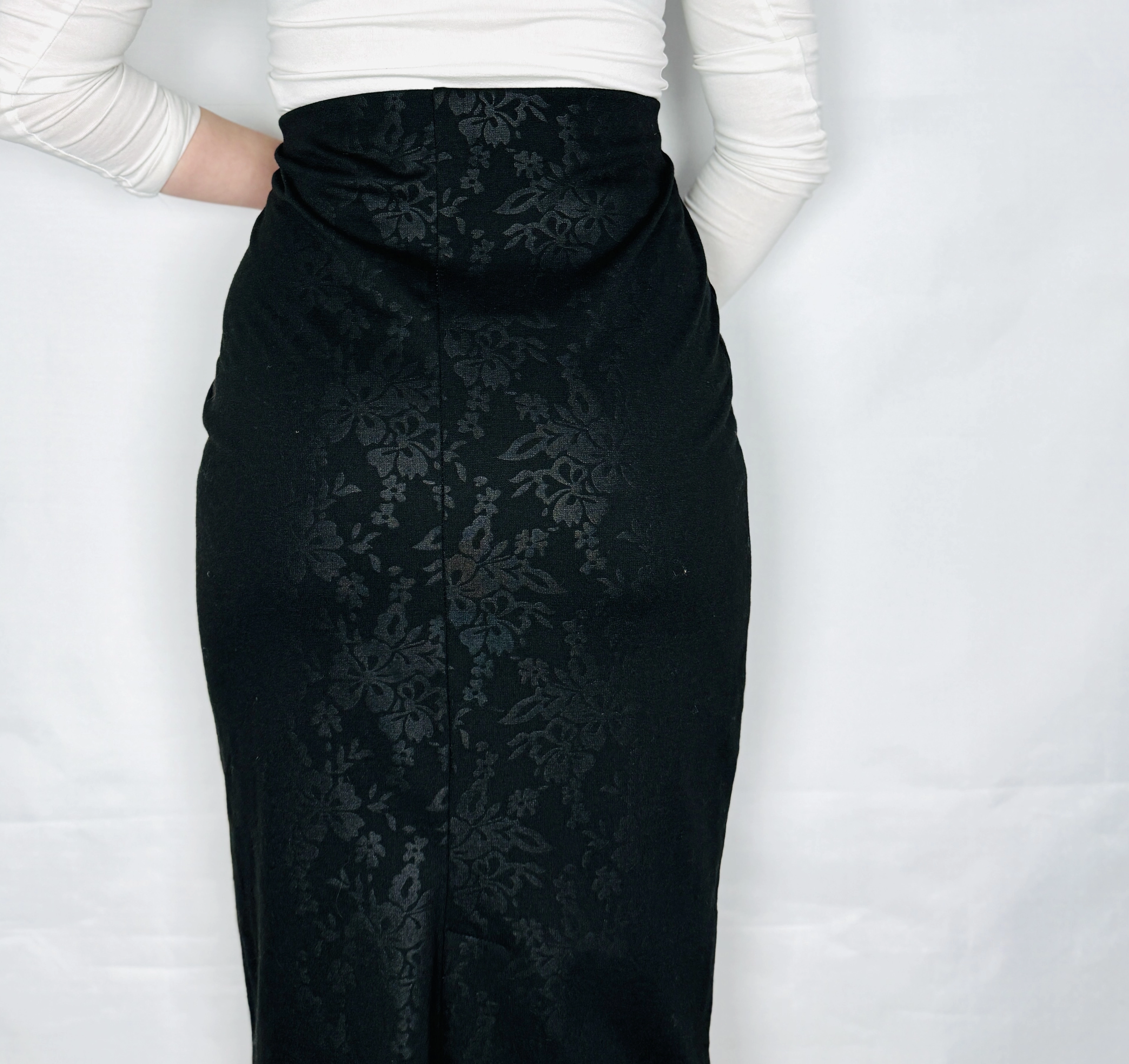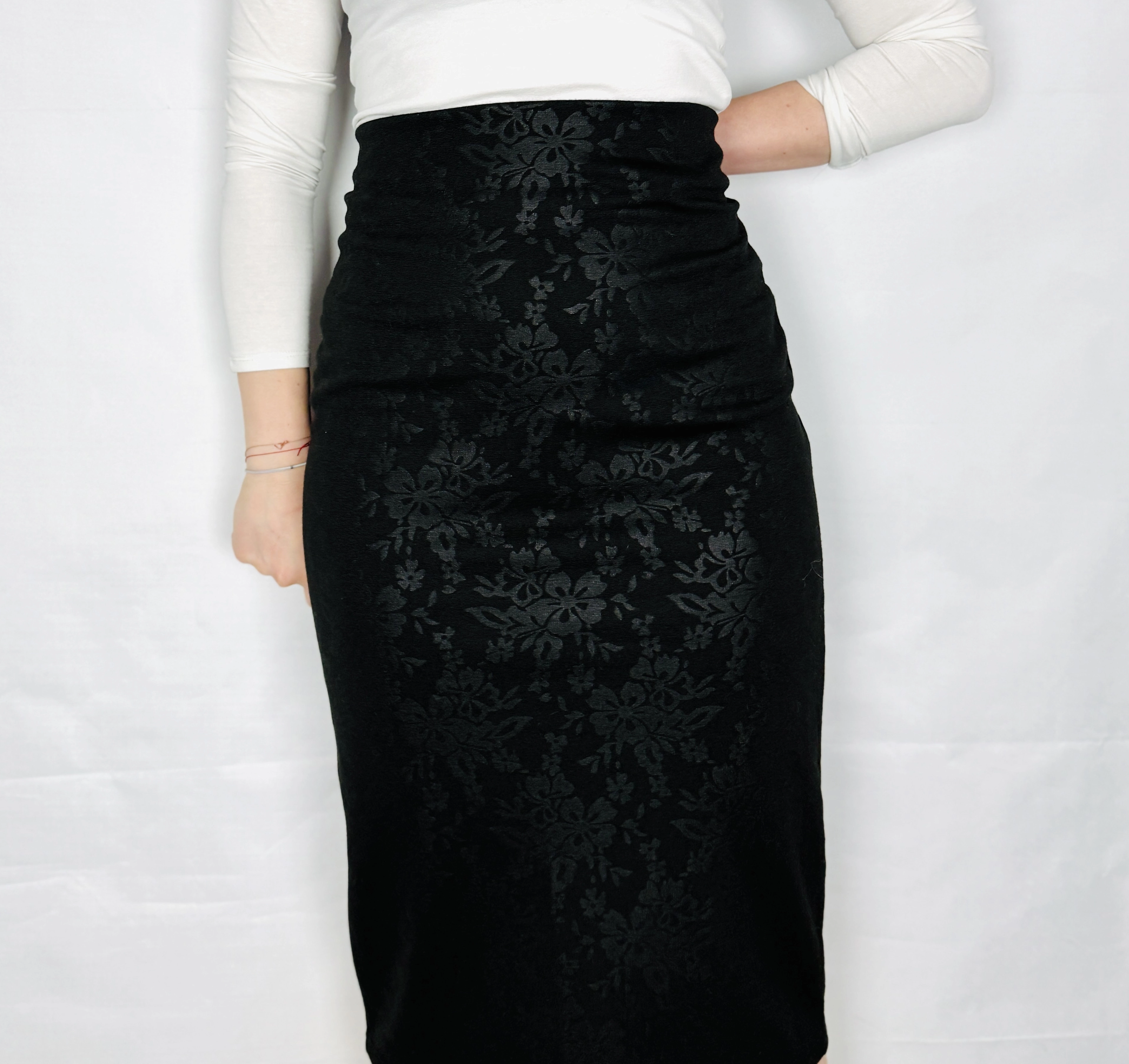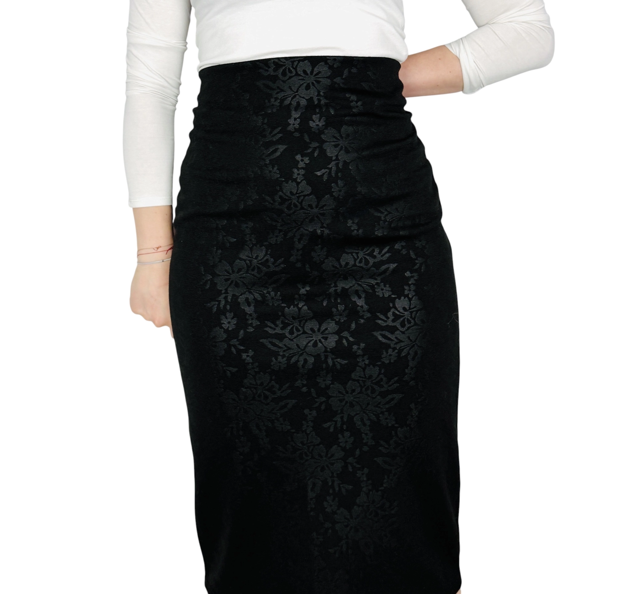 Ta spódnica zachwyca subtelną grą światła i elegancją ukrytą w detalach. Głęboka czerń w połączeniu z delikatnie połyskującym, kwiatowym wzorem tworzy efekt wyrafinowanej, wieczorowej klasyki, która przyciąga spojrzenia, ale pozostaje niezwykle stylowa i nienachalna. To model, który łączy w sobie zmysłowość i elegancję, idealnie wpisując się w garderobę kobiety ceniącej ponadczasowe rozwiązania z nutą nowoczesności.