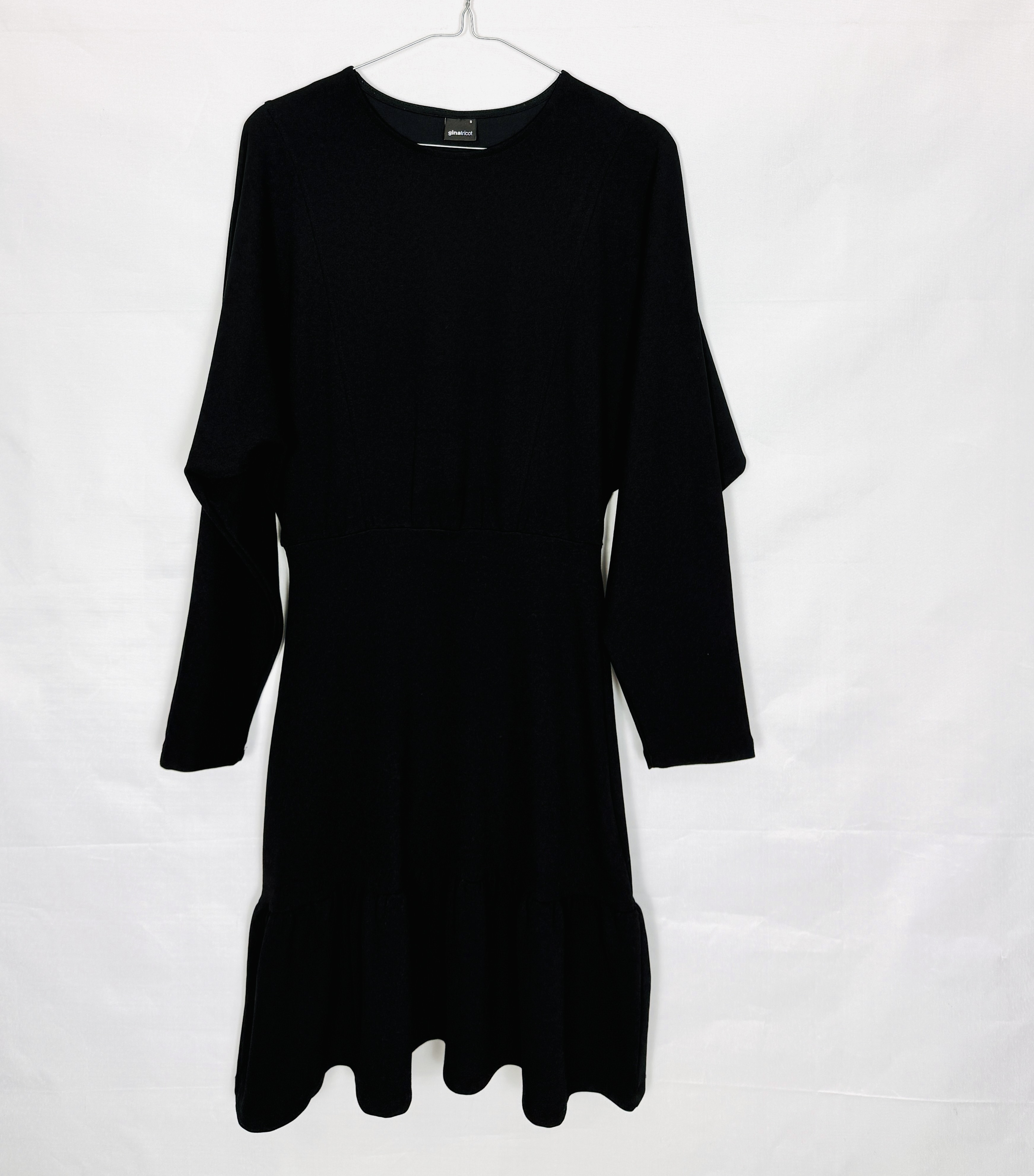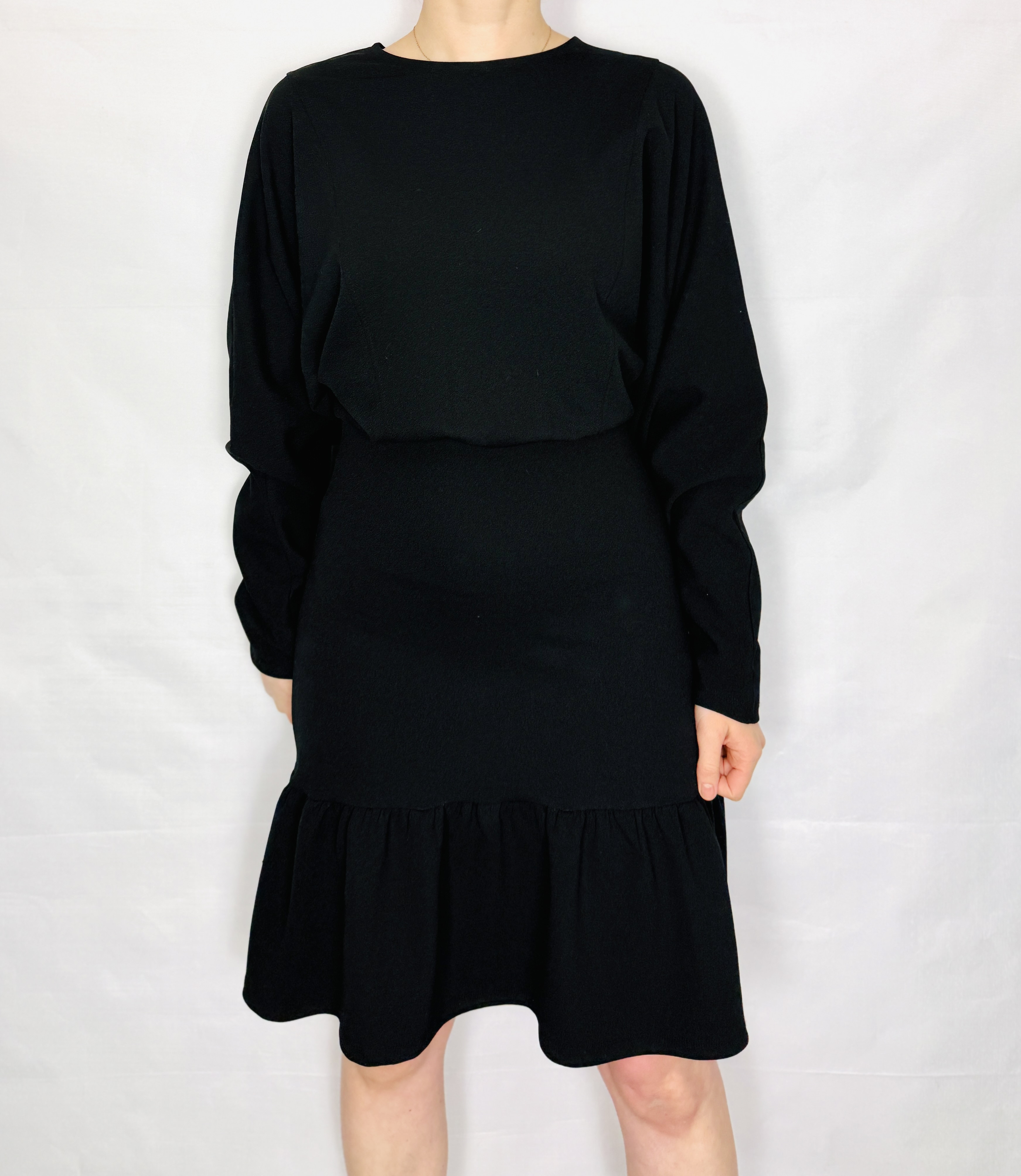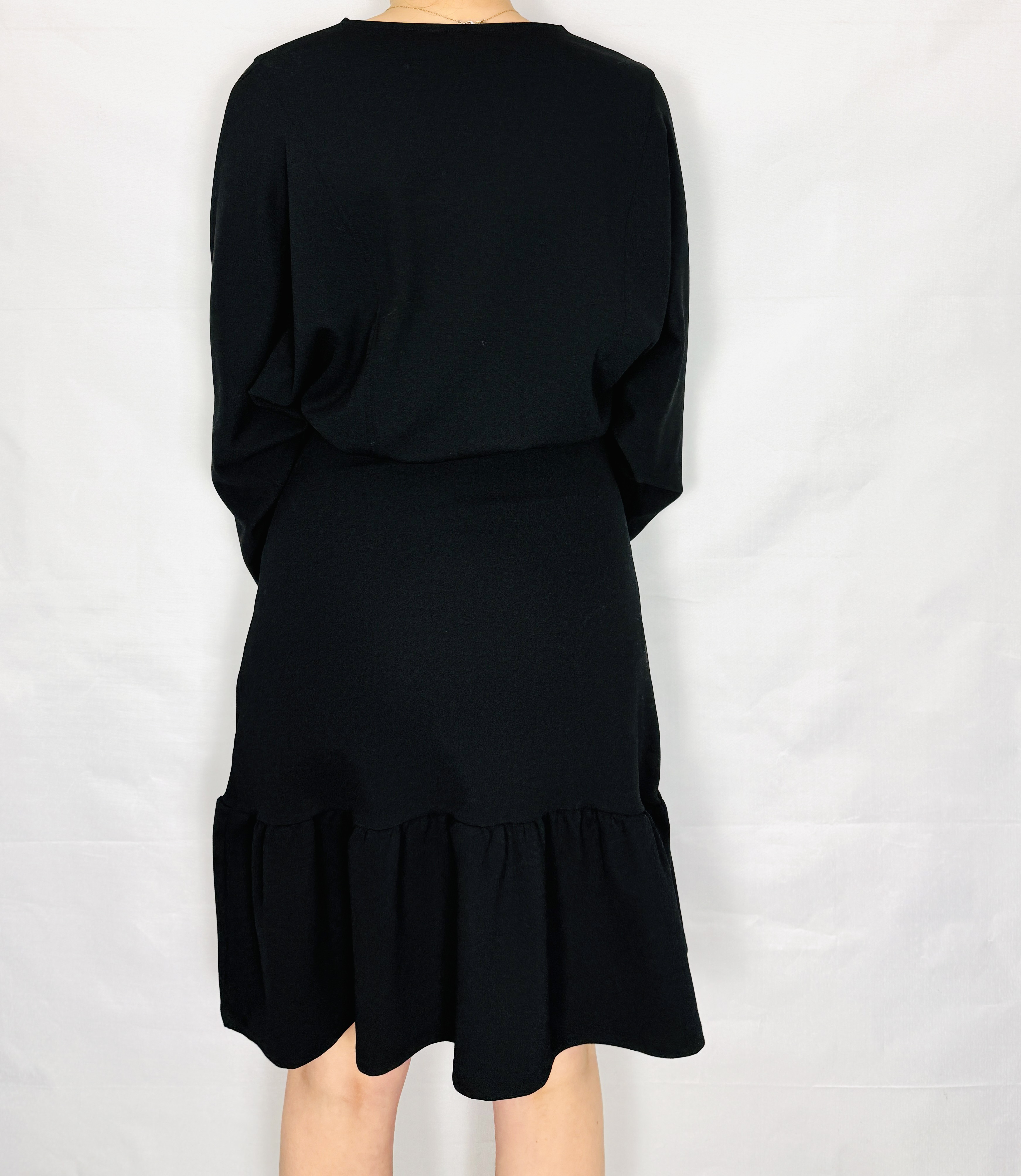 Ta sukienka to subtelne połączenie klasycznej prostoty i kobiecej lekkości — głęboka czerń daje jej uniwersalny, elegancki charakter, a jednocześnie projekt ma w sobie przyjemną nonszalancję dzięki lekko bluzowanemu topowi i delikatnej falbanie u dołu. Całość wypada dostojnie i jednocześnie świeżo; to propozycja dla osób, które cenią uporządkowaną formę z niewymuszoną, kobiecą nutą. Nastrój sukienki jest stonowany, ale pełen subtelnego uroku — łatwo odnaleźć ją w garderobie zarówno na bardziej formalne wyjścia, jak i do codziennych stylizacji.