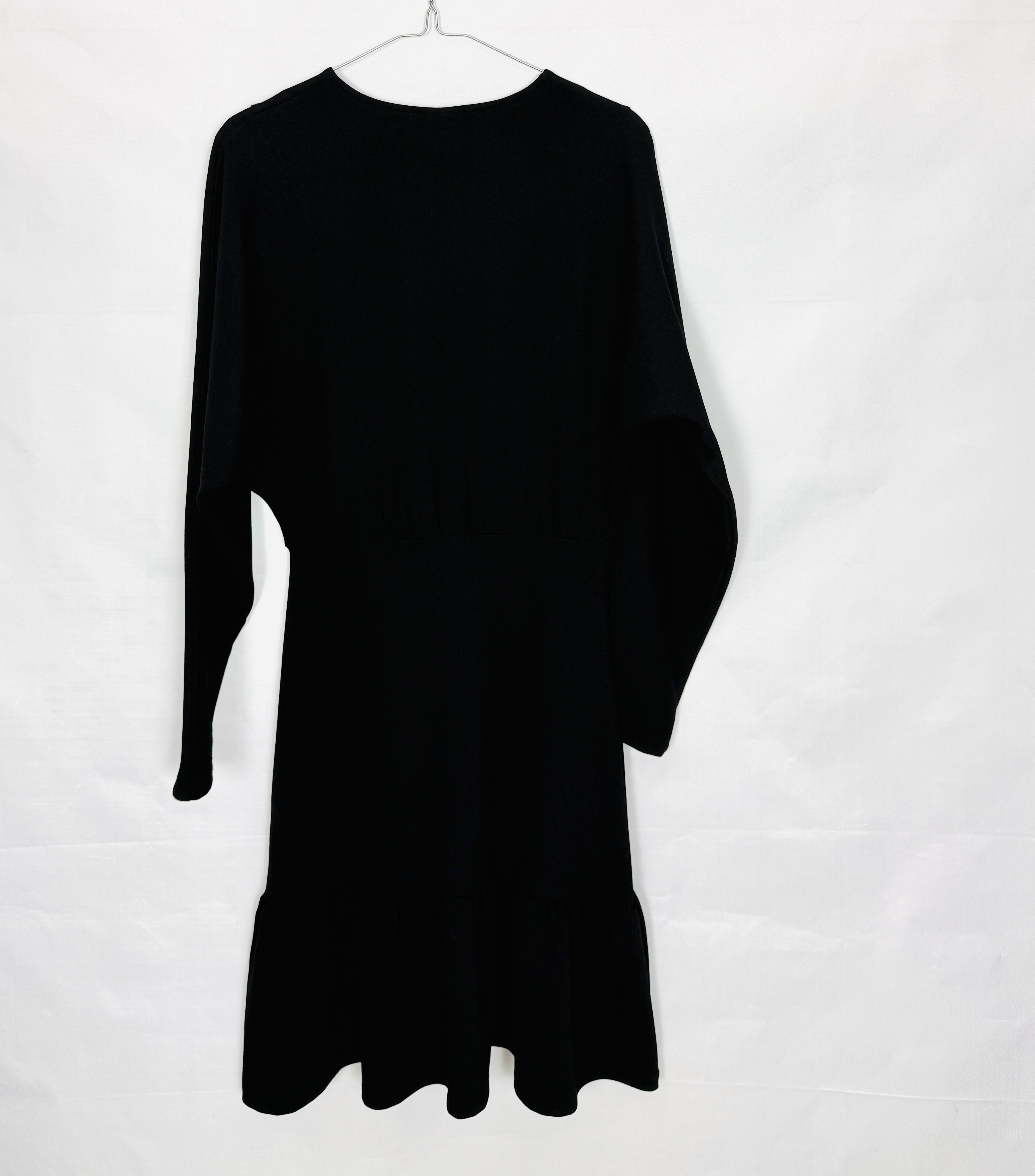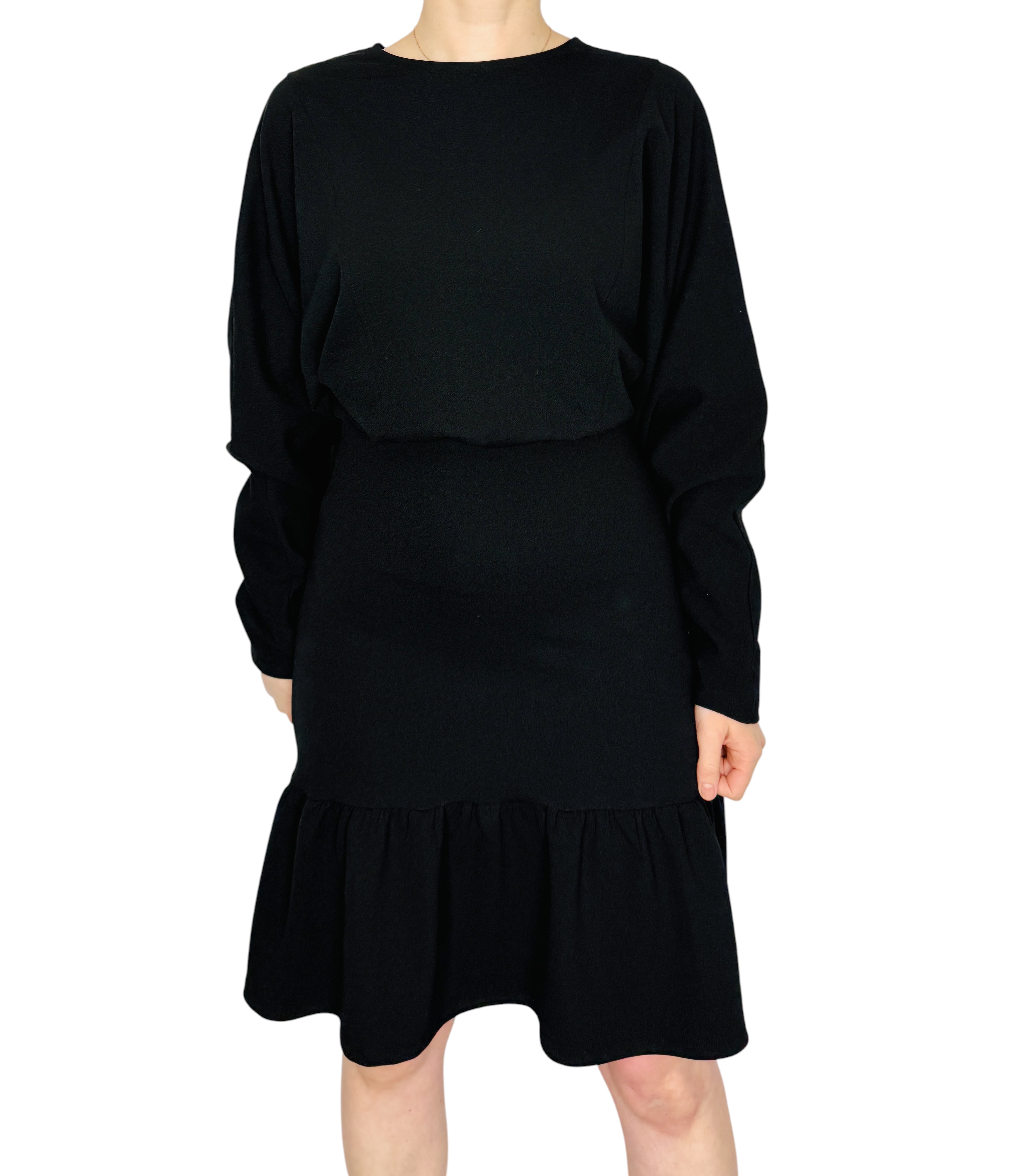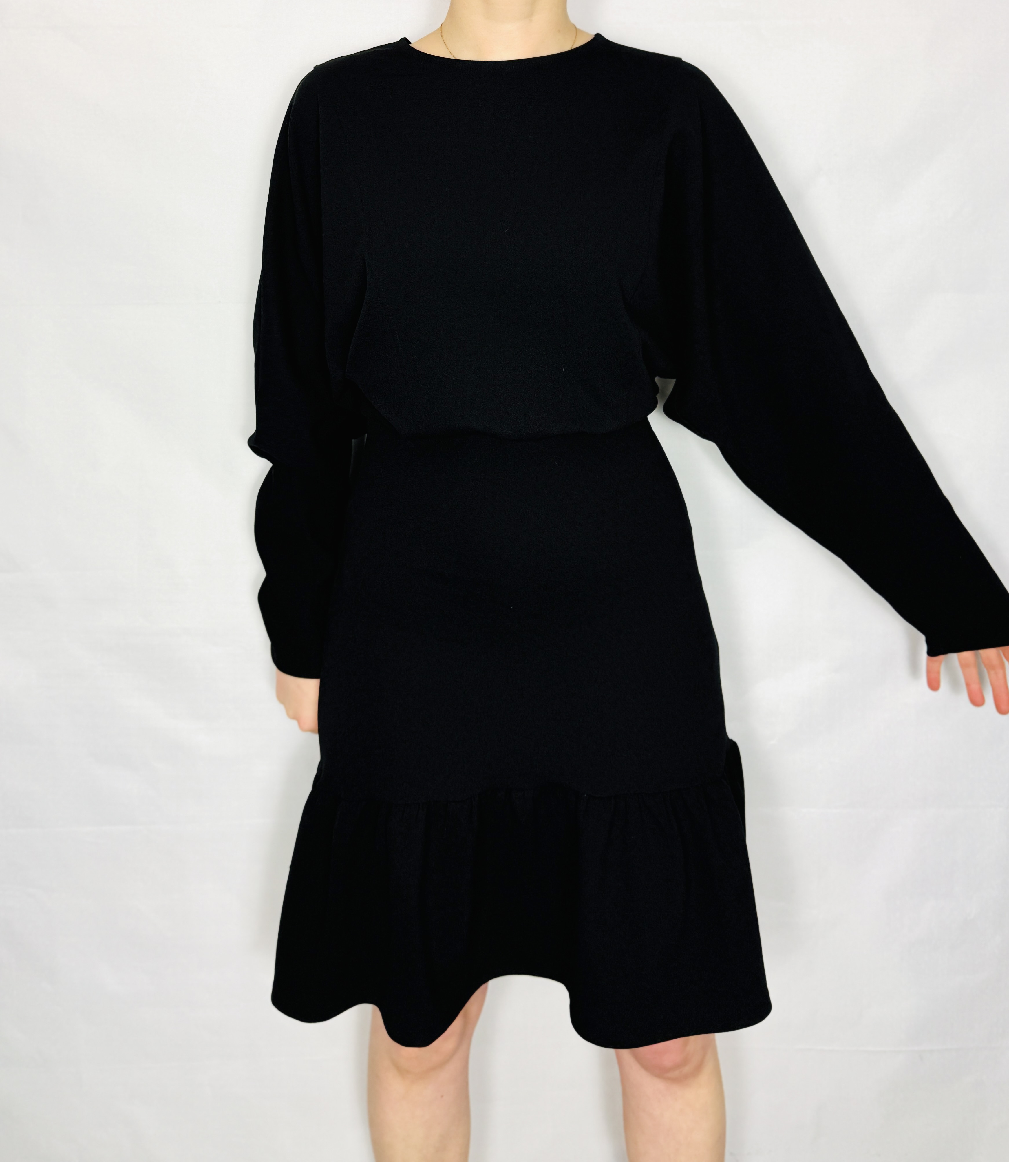 Ta sukienka to subtelne połączenie klasycznej prostoty i kobiecej lekkości — głęboka czerń daje jej uniwersalny, elegancki charakter, a jednocześnie projekt ma w sobie przyjemną nonszalancję dzięki lekko bluzowanemu topowi i delikatnej falbanie u dołu. Całość wypada dostojnie i jednocześnie świeżo; to propozycja dla osób, które cenią uporządkowaną formę z niewymuszoną, kobiecą nutą. Nastrój sukienki jest stonowany, ale pełen subtelnego uroku — łatwo odnaleźć ją w garderobie zarówno na bardziej formalne wyjścia, jak i do codziennych stylizacji.