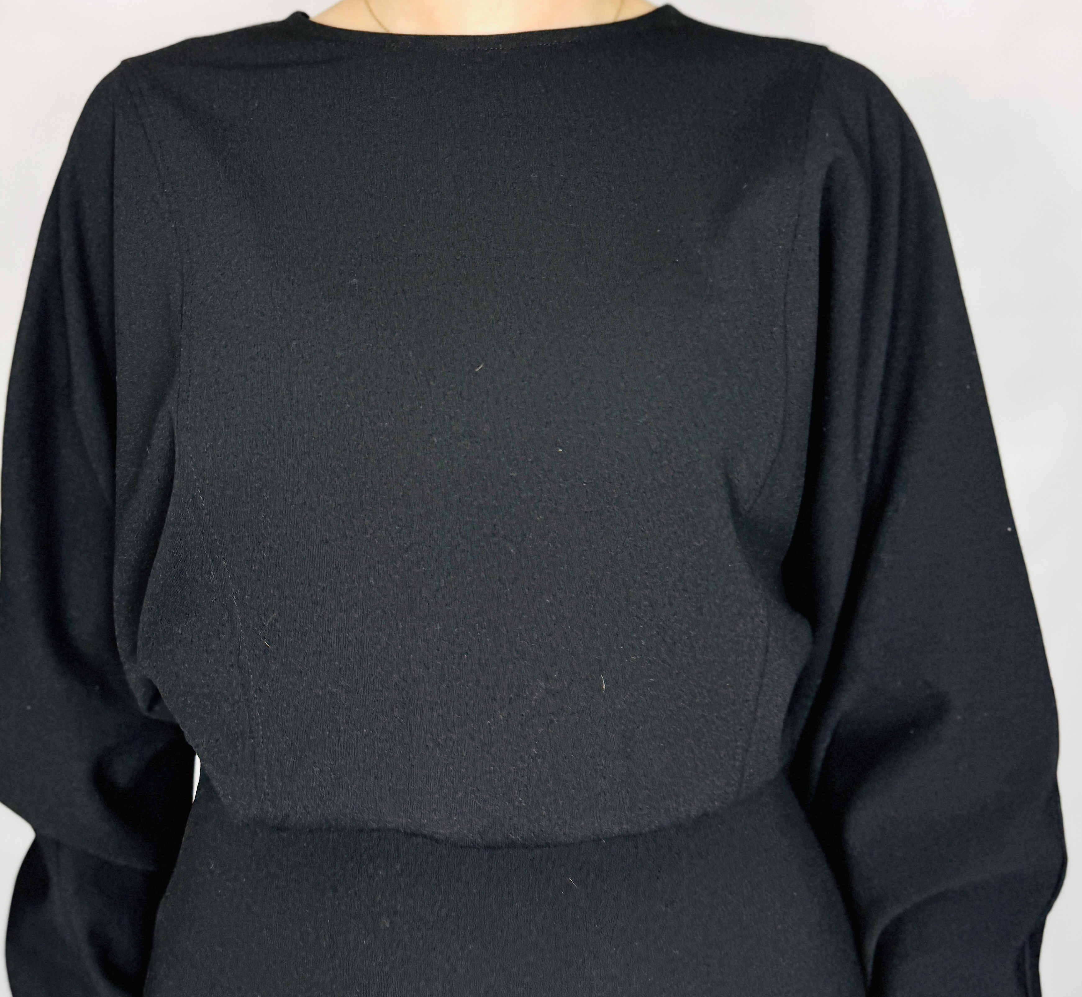 Dekolt ma klasyczny, łagodnie okrągły kształt, który dyskretnie oprawia szyję i daje przestrzeń na delikatną biżuterię. Rękawy mają szeroki, opadający krój — ich lekka objętość przy ramionach wprowadza miękkość i kobiecy akcent, jednocześnie pozostając elegancko zharmonizowana z resztą sylwetki. Górna część fasonu ma luźniejsze, bluzowane ułożenie, które płynnie przechodzi w węższą formę bioder; takie zestawienie tworzy ciekawą grę proporcji i pozwala na komfort noszenia bez utraty szyku.