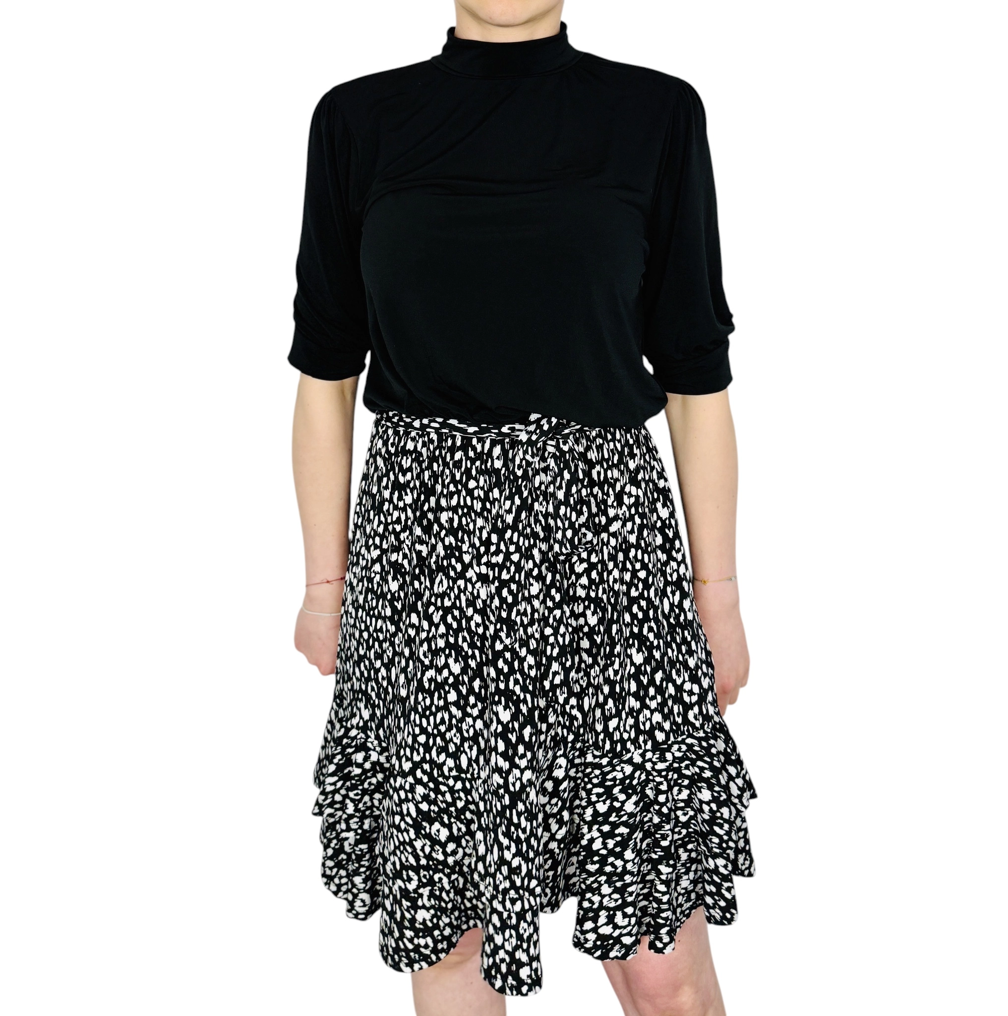 Dół sukienki to prawdziwa eksplozja wzoru i ruchu. Spódnica o długości przed kolano została uszyta z lekkiej, zwiewnej tkaniny pokrytej gęstym, nieregularnym motywem przypominającym drobne cętki lub abstrakcyjne plamki. Odcięcie w talii wyraźnie zaznacza środek sylwetki, a liczne marszczenia sprawiają, że dół staje się rozkloszowany i bardzo dynamiczny. Dodatkowym atutem jest szeroka falbana u dołu, która nadaje spódnicy objętości i sprawia, że materiał pięknie pracuje przy każdym kroku.