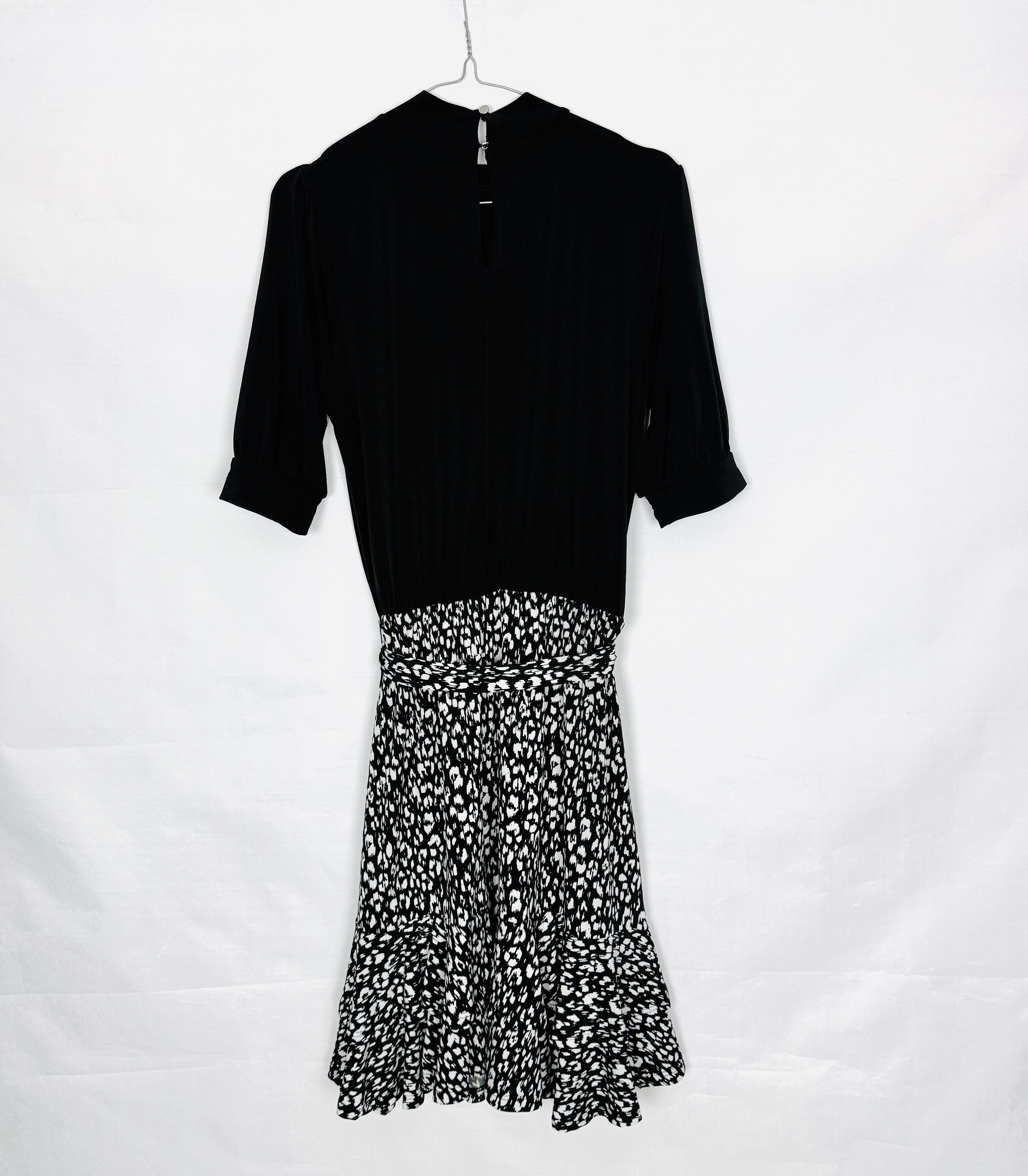 Ta sukienka to mistrzowskie połączenie minimalistycznej góry z dynamicznym, pełnym energii dołem. Zestawienie głębokiej czerni z biało czarnym, drobnym wzorem tworzy niezwykle stylowy kontrast, który przyciąga wzrok i nadaje całości nowoczesnego wyrazu. To kreacja, która emanuje kobiecością i pewnością siebie, łącząc w sobie elegancję z nutą swobody, idealną dla kobiet ceniących nieoczywiste rozwiązania w modzie.