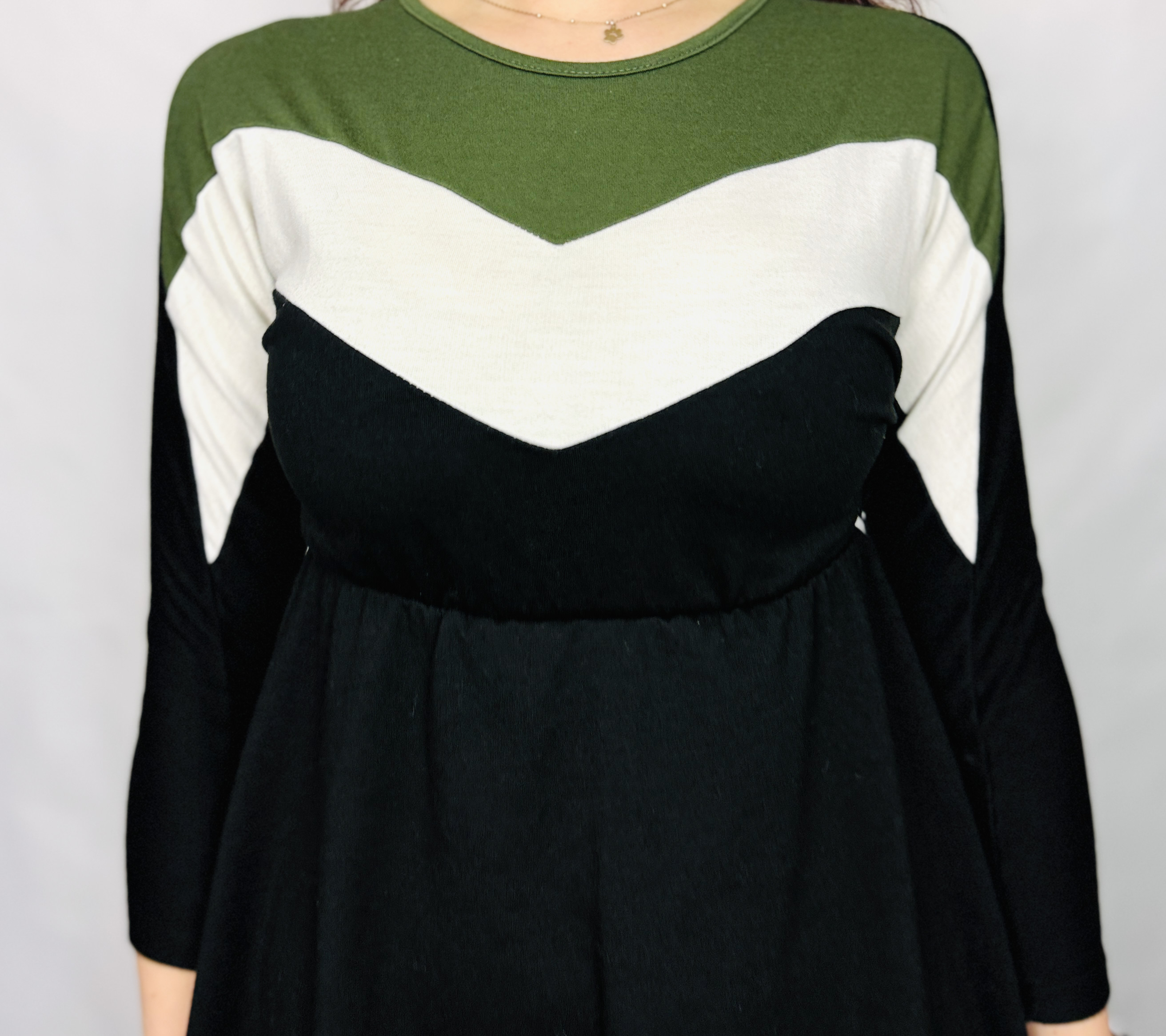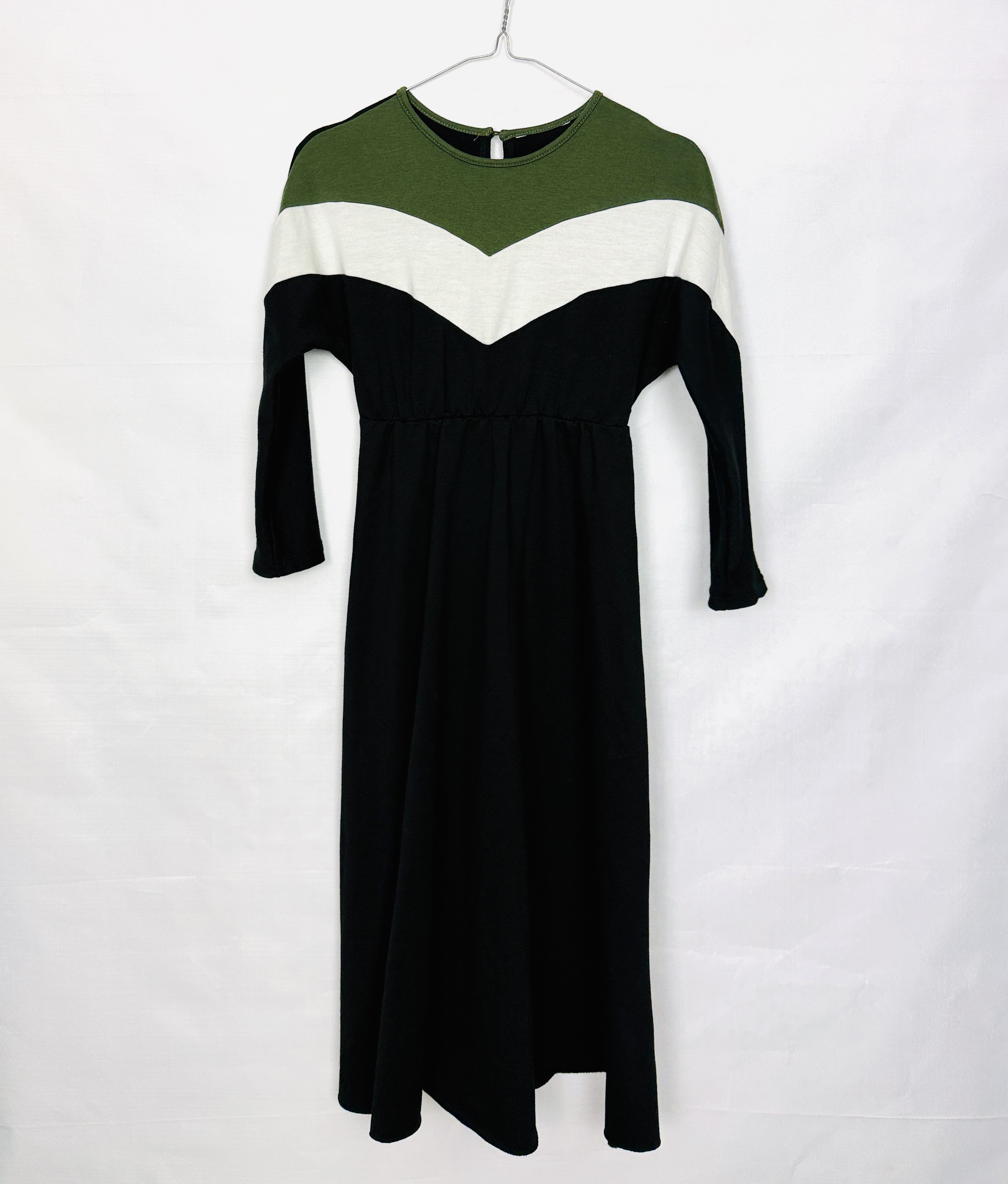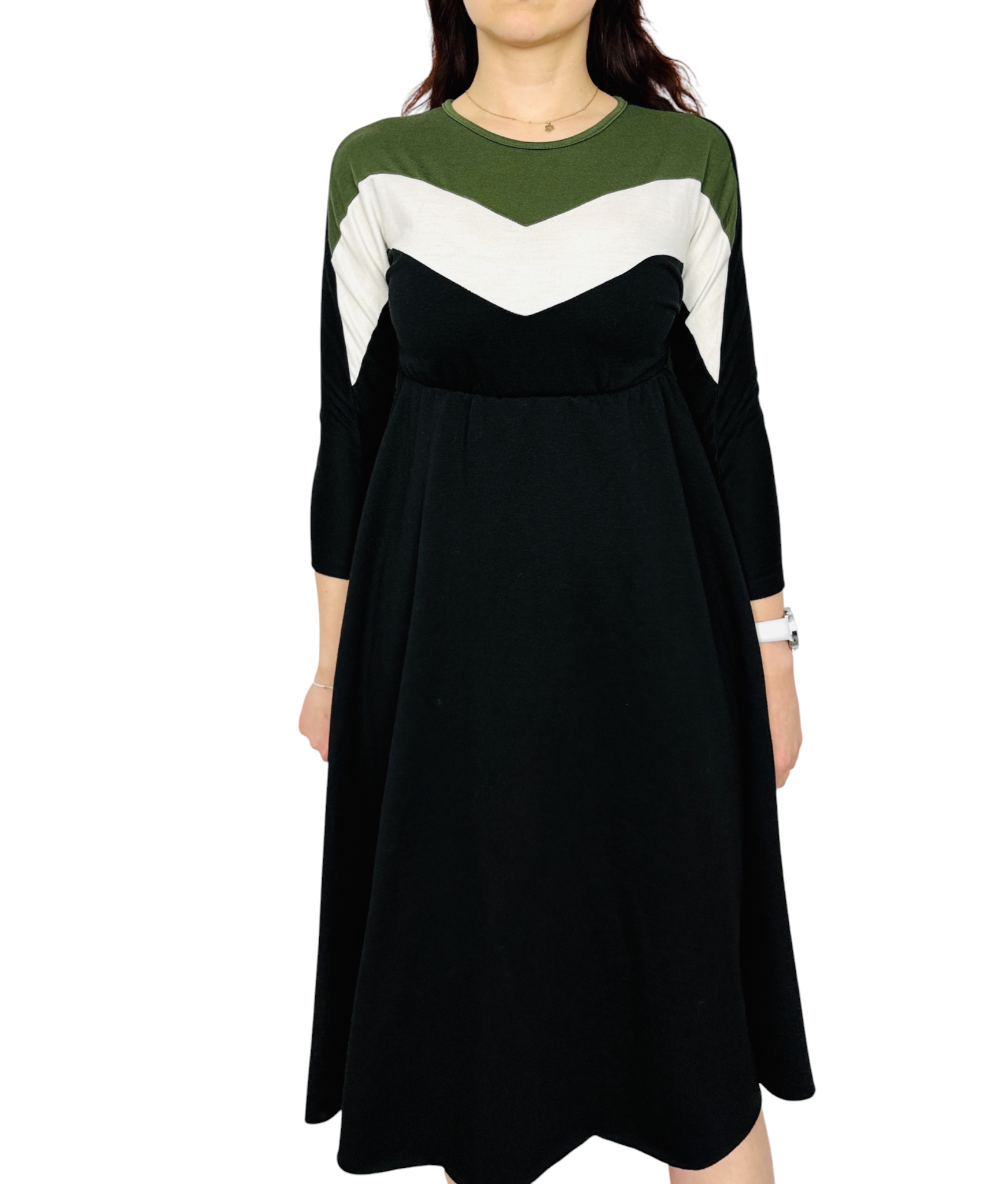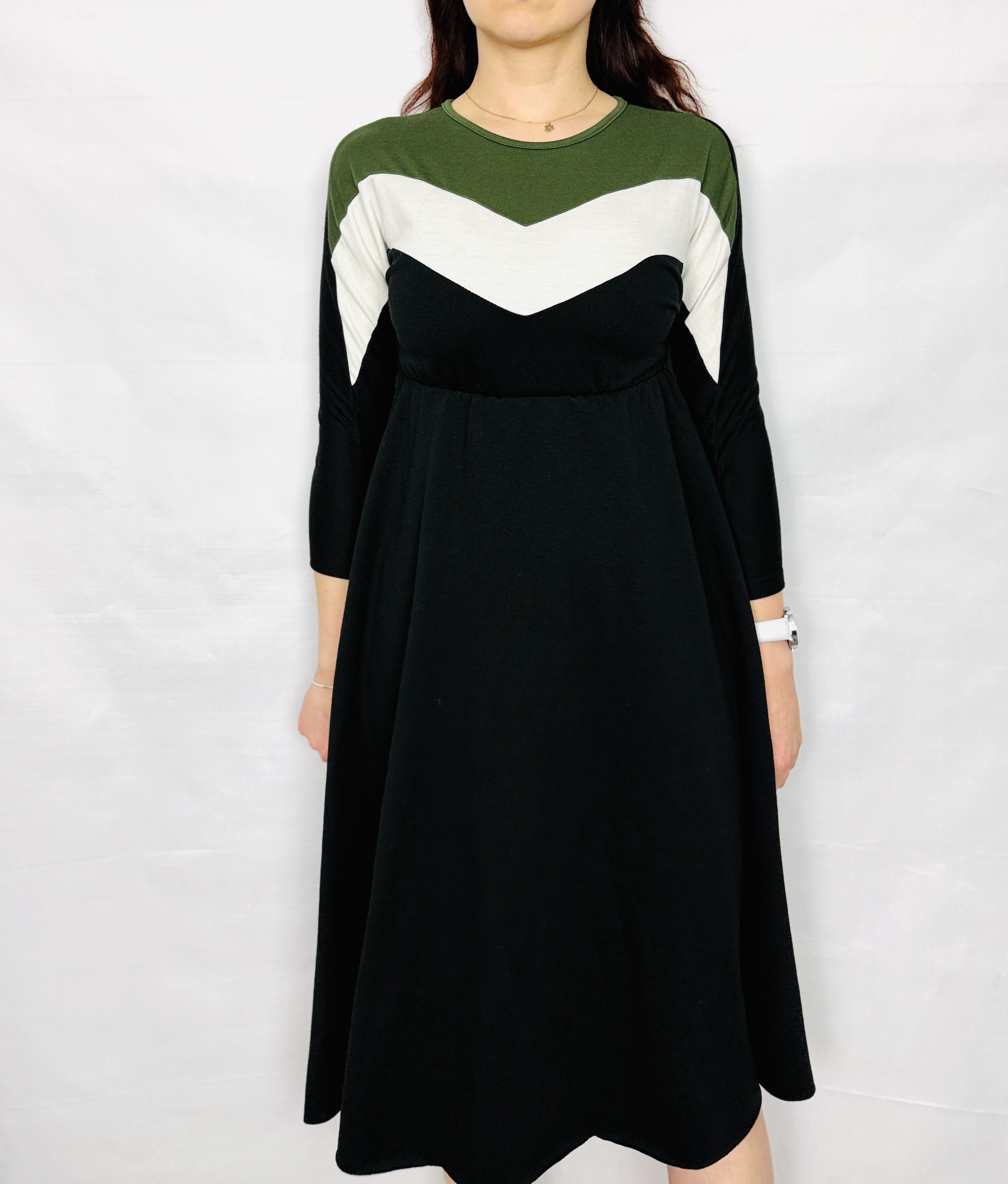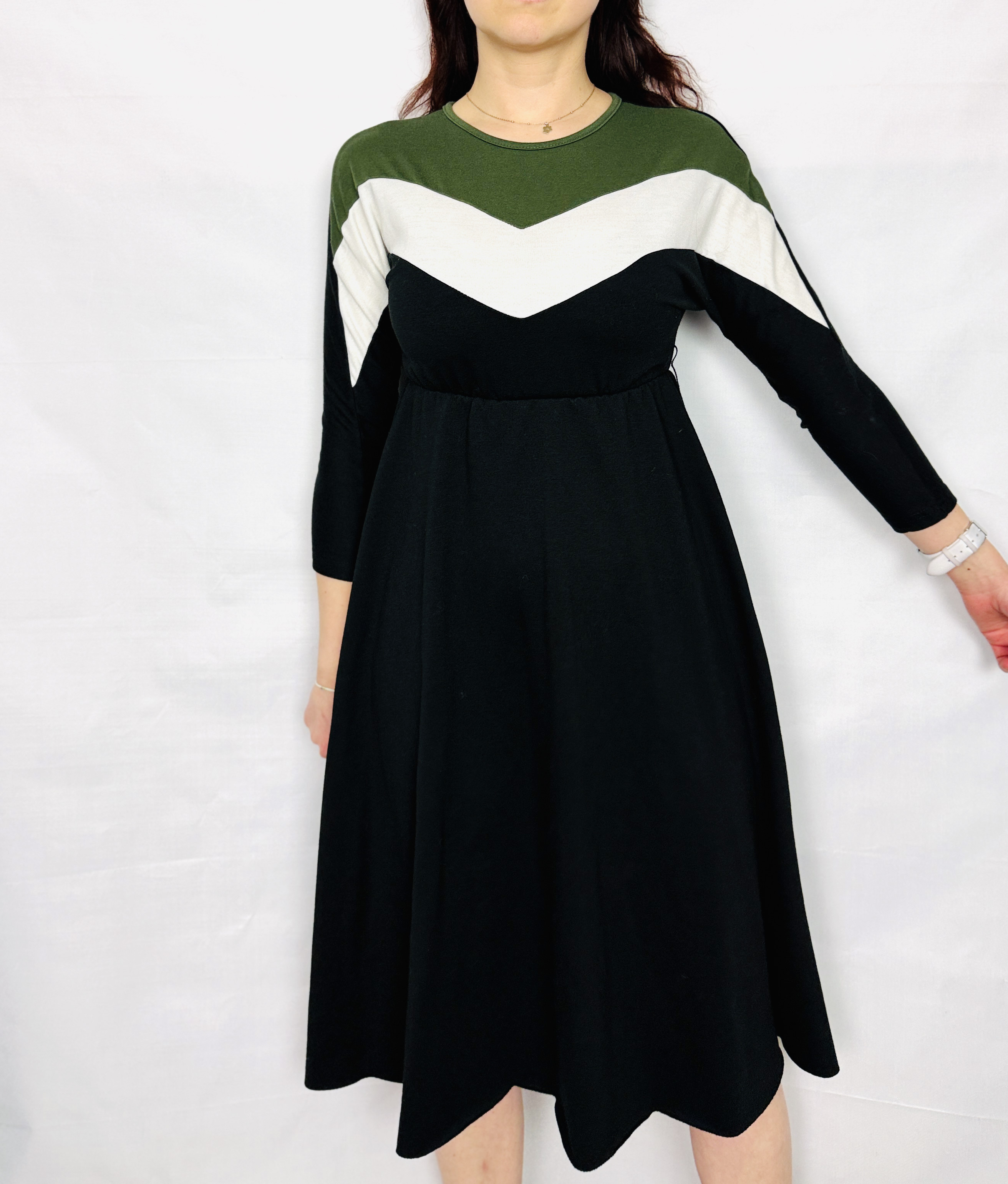 Ta sukienka to połączenie subtelnej kobiecości i nowoczesnej, graficznej estetyki — stonowana czerń przełamana kontrastującymi panelami w odcieniu oliwkowej zieleni i czystej bieli tworzy świeży, uporządkowany wygląd, który jednocześnie pozostaje delikatny i noszalny. Projekt ma w sobie nutę sportowej elegancji dzięki geometrycznym wstawkom w kształcie litery V, a jednocześnie zachowuje kobiecy charakter poprzez łagodnie rozkloszowany dół. To sukienka dla osób, które lubią wyraźny detal bez krzykliwego efektu.