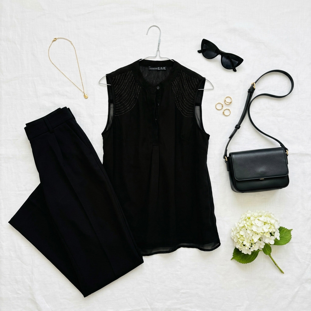 W stylizacjach postaw na kontrasty materiałów i prostotę dodatków: na co dzień zestaw bluzkę z wąskimi spodniami typu cygaretki i loafersami albo ze spodniami z wysokim stanem i klasycznymi półbutami; do pracy noś ją pod dopasowanym żakietem albo z ołówkową spódnicą i subtelnymi czółenkami, a na wieczór wybierz eleganckie szpilki lub ozdobne sandały oraz wyrazistą biżuterię, która podkreśli dekoracyjne ramiona. Czarna baza znakomicie łączy się z kremem i beżem, z głębokim bordo, z butelkową zielenią oraz z metalicznymi akcentami złota czy srebra — te zestawienia pozwolą zarówno podkreślić wieczorowy charakter bluzki, jak i stworzyć stonowane, codzienne kompozycje.