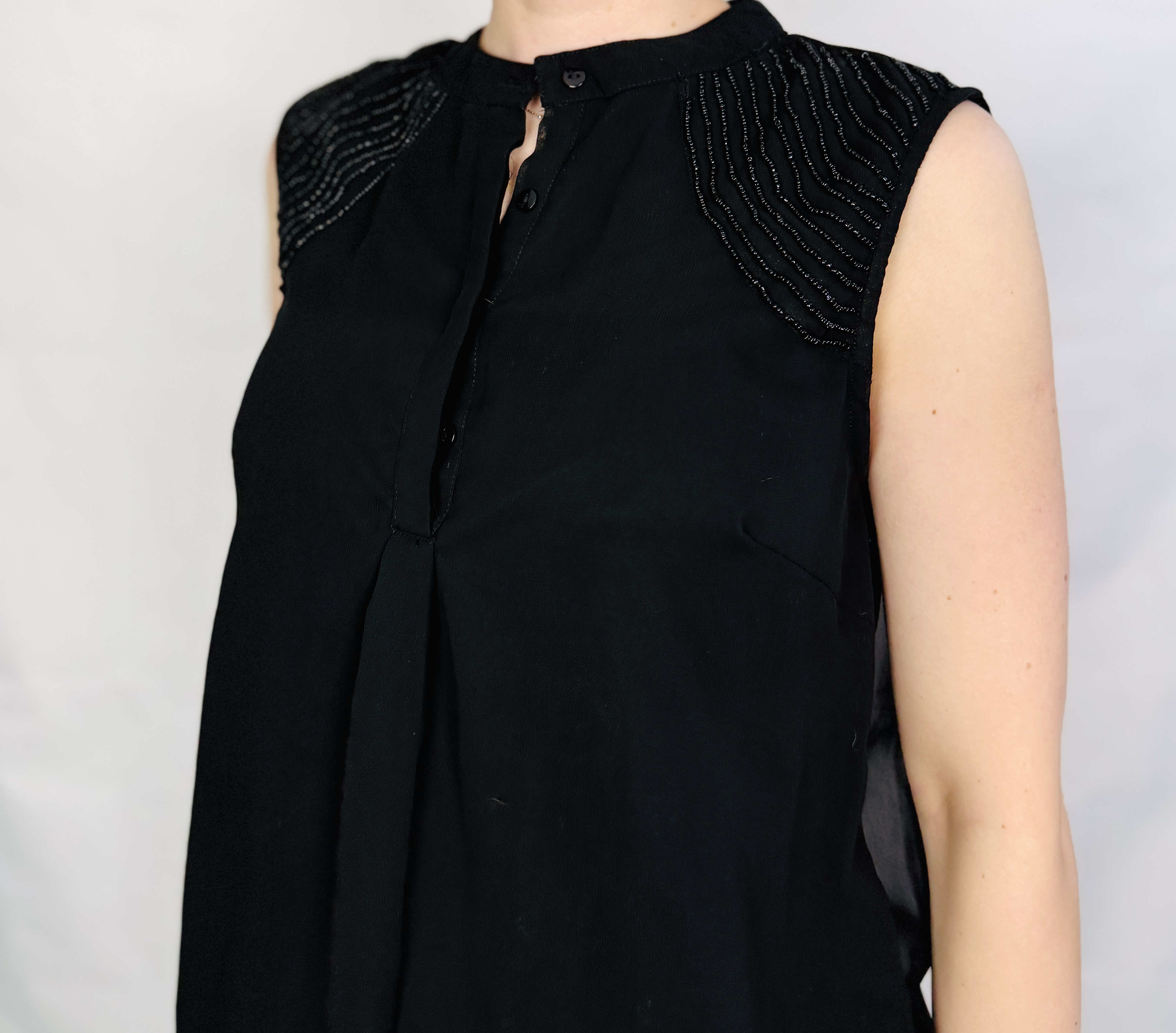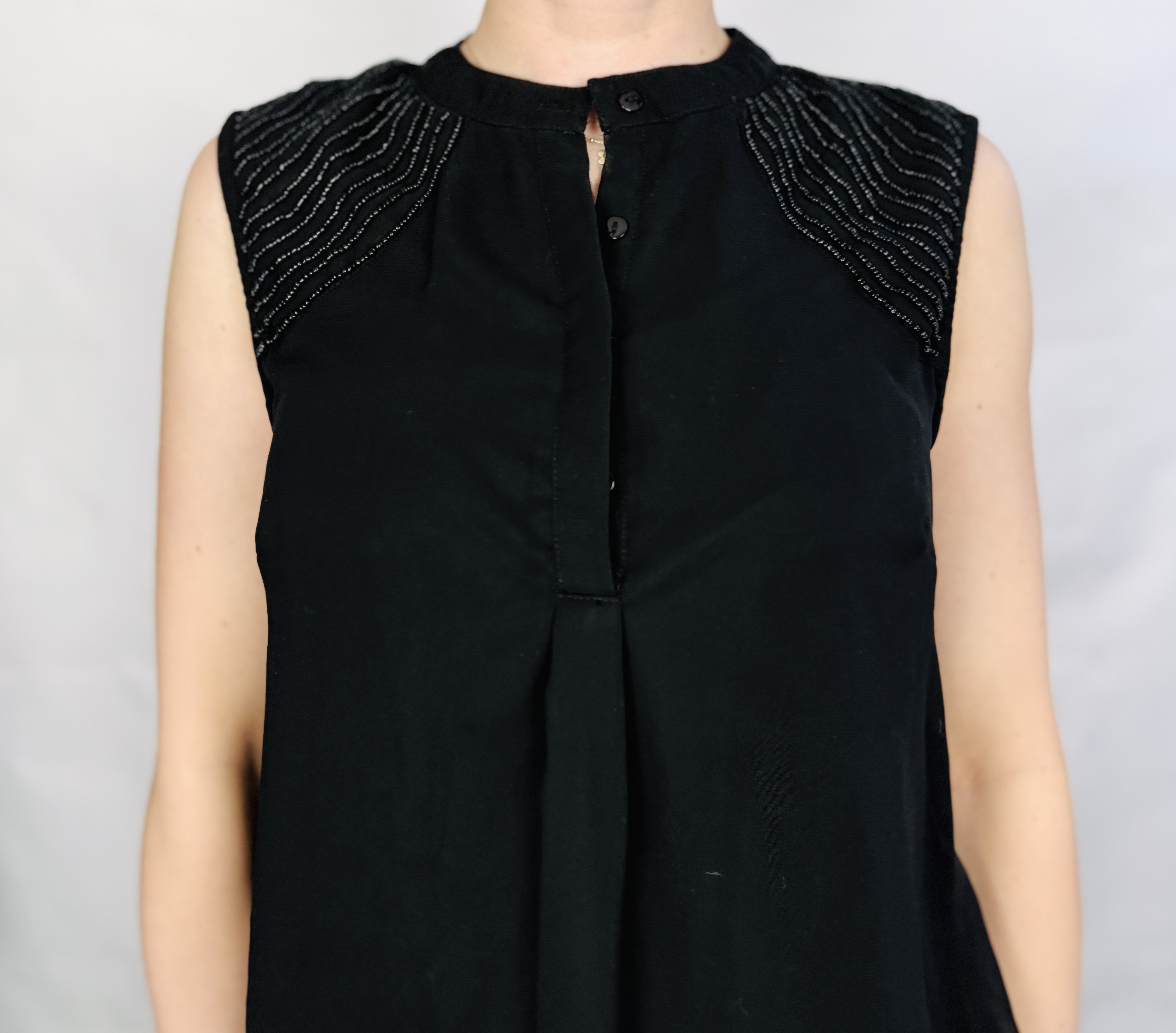 To bluzka o delikatnej, wieczorowej elegancji, w której klasyczna czerń spotyka się z subtelnym, ręcznie wyglądającym wykończeniem przy ramionach — efekt ten nadaje kreacji nieoczywistej lekkości i szyku, sprawiając, że staje się ona propozycją zarówno na bardziej formalne okazje, jak i na stylizacje, w których chcemy wyglądać kobieco, ale z dystansem. Gładka, jednolita powierzchnia korpusu kontrastuje tu z dekoracyjnymi, połyskującymi detalami na barkach, co wprowadza do projektu romantyczny, a zarazem uporządkowany akcent.
