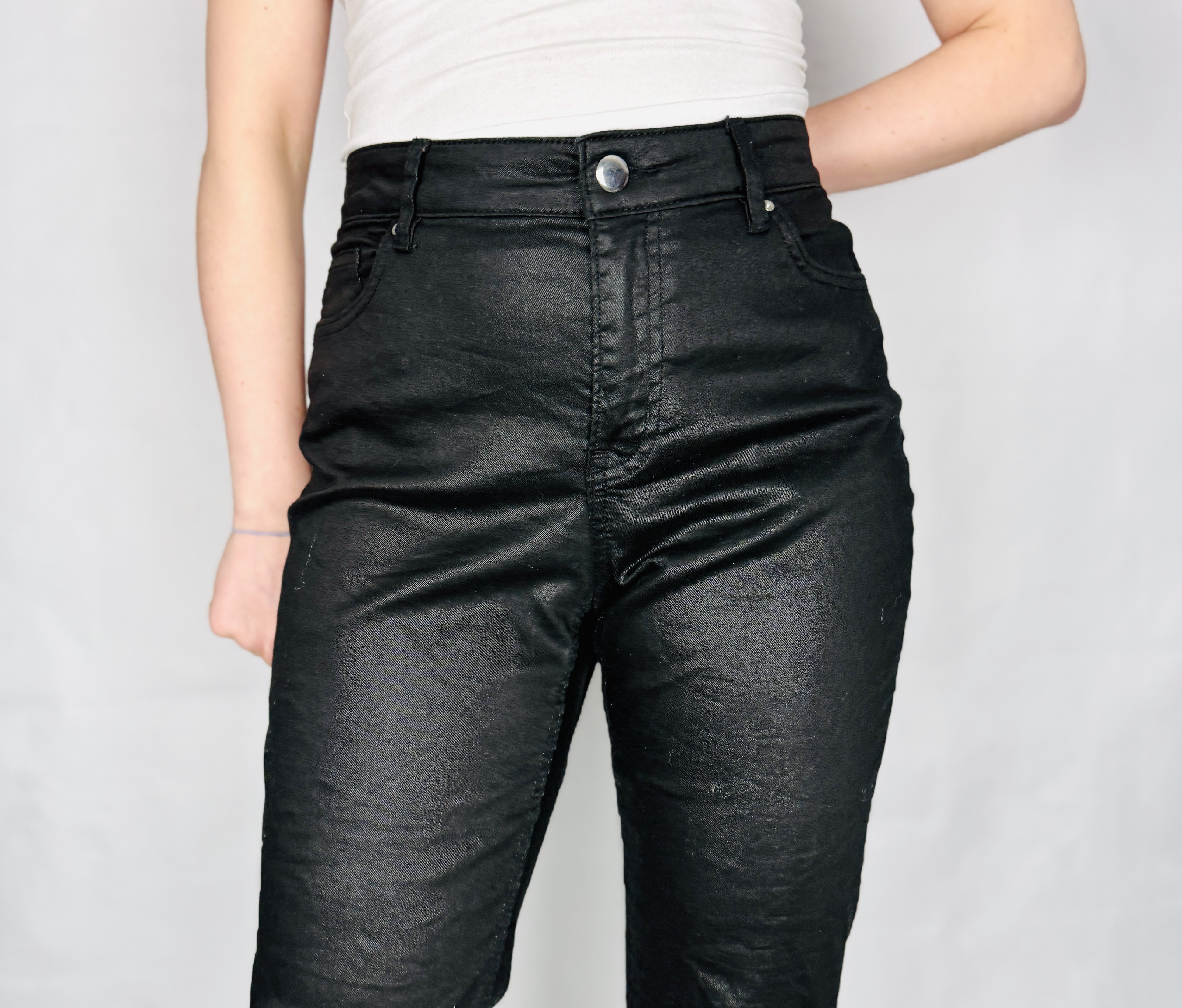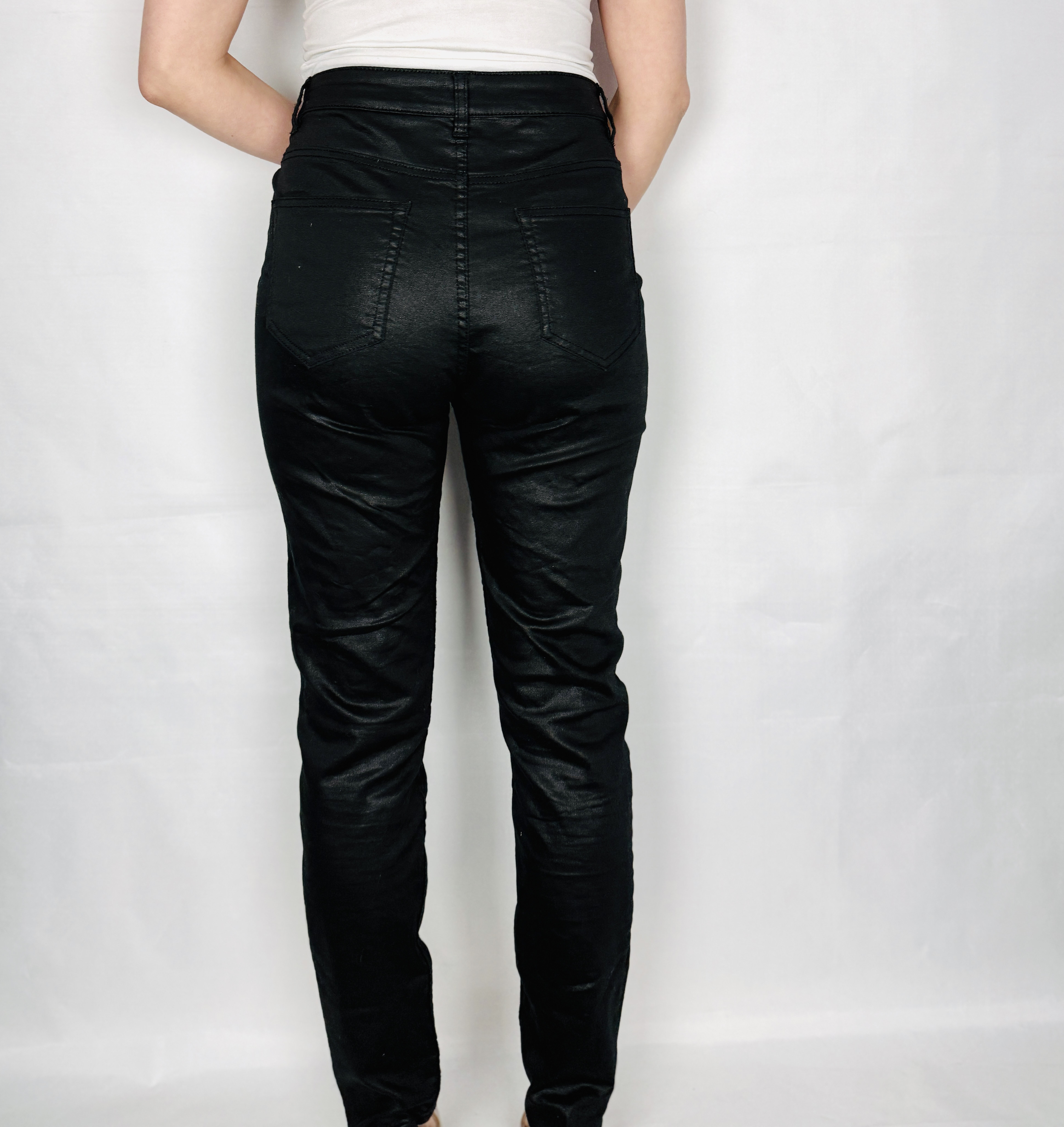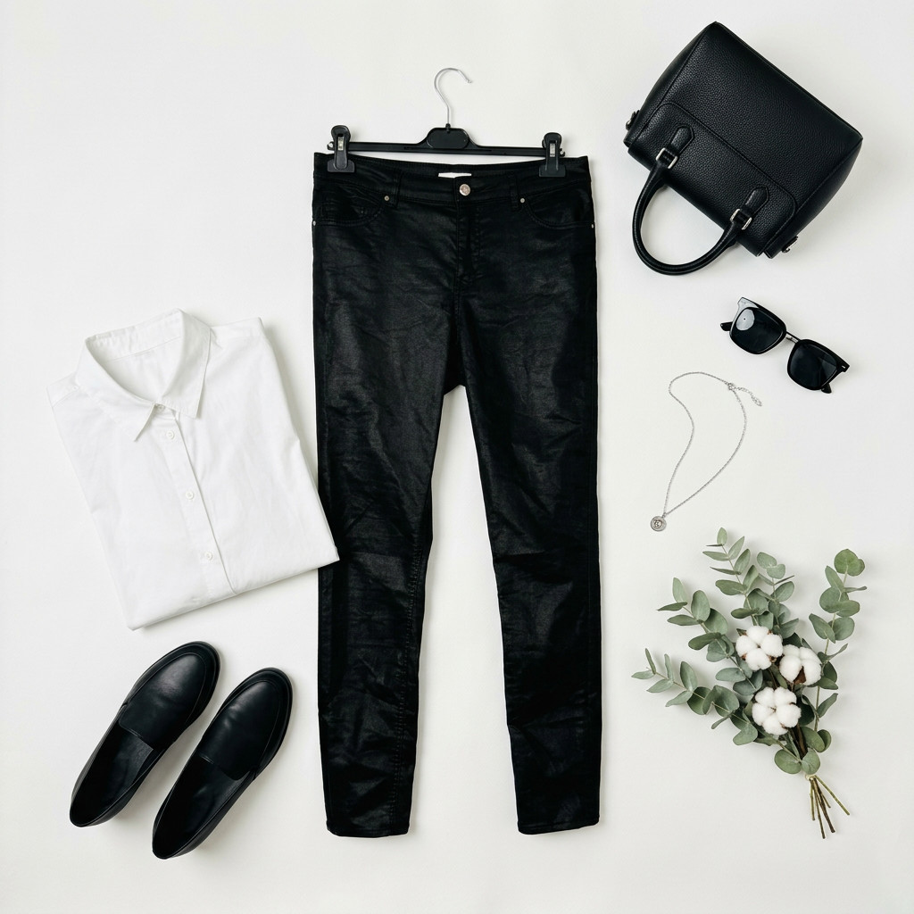 W stylizacjach sprawdzą się niezwykle uniwersalnie: w wersji na co dzień zestaw z prostym topem i eleganckimi sneakersami, do pracy połącz z gładką koszulą i dopracowaną marynarką, a na wieczór dobierz efektowny top i szpilki dla wyrazistego, kobiecego efektu. Czerń pięknie współgra z bielą, kremem i beżem, równie dobrze odnajdzie się w towarzystwie mocniejszych tonów — bordo, granat czy intensywna zieleń nadadzą stylizacji głębi i wyrazistości. To para dla osoby, która ceni stylową prostotę z subtelnym, błyszczącym akcentem.