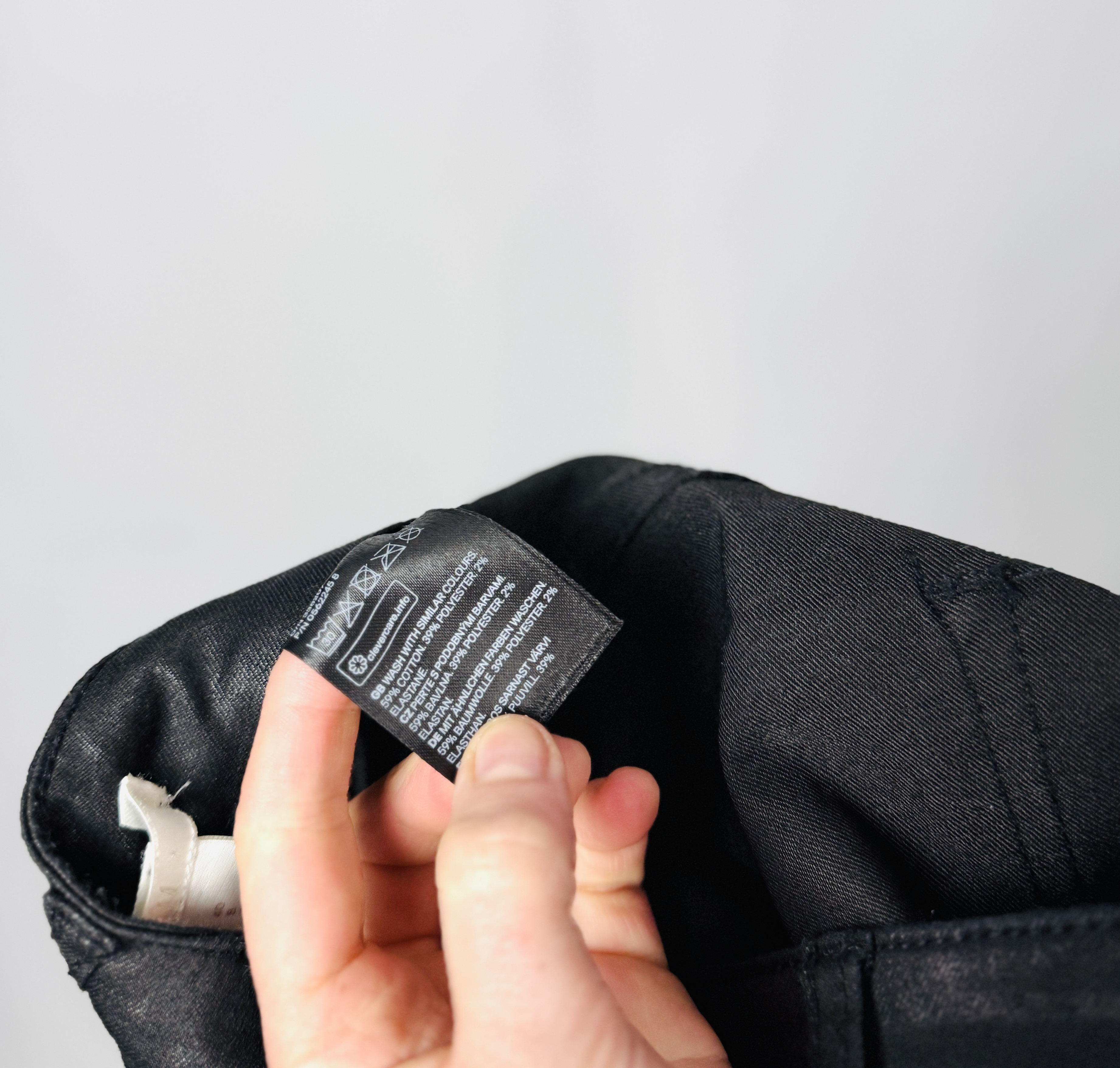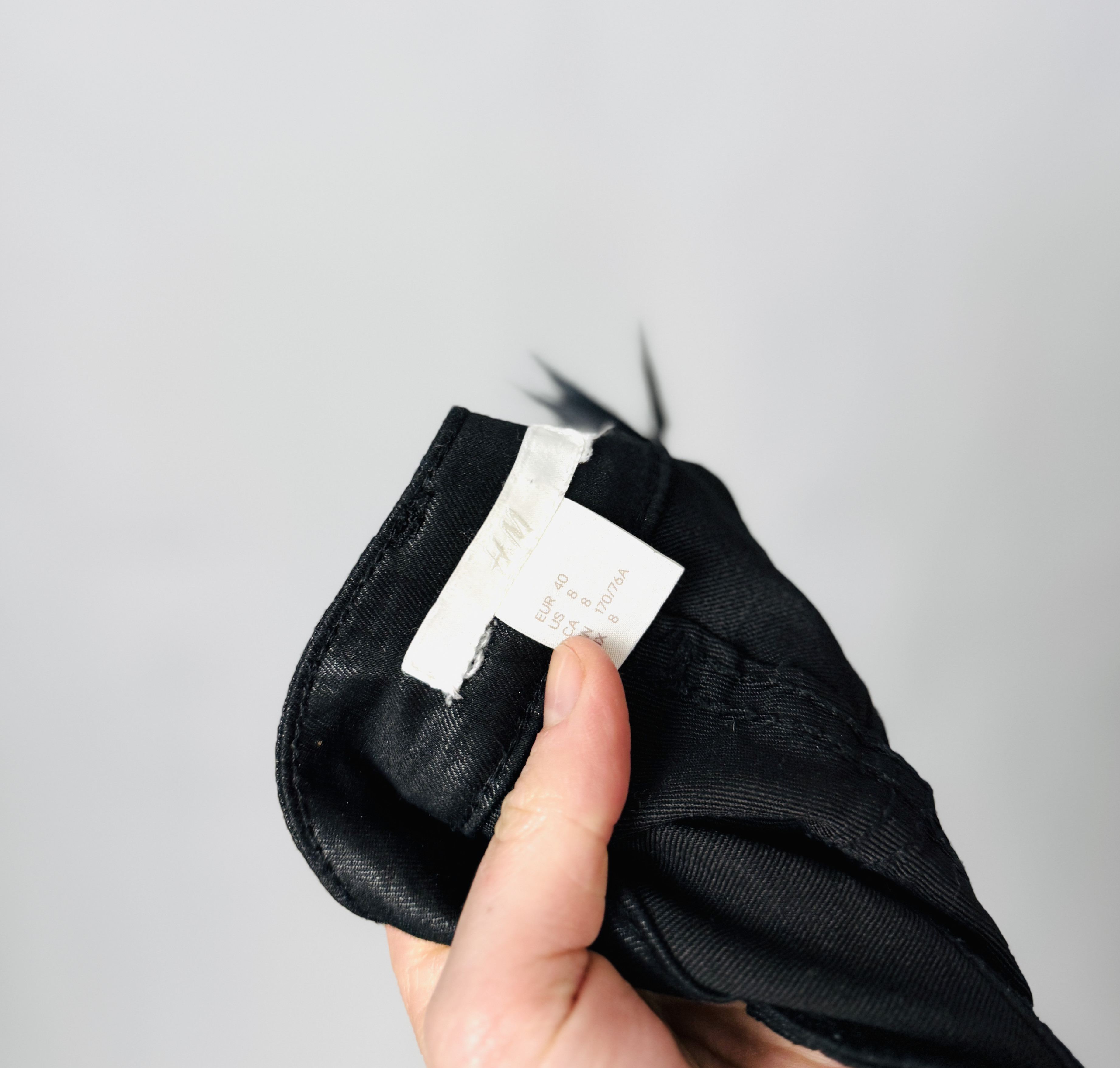 Krój wyróżnia wyraźnie podwyższony stan z widocznym zapięciem na guzik i klasycznymi szlufkami, które porządkują linię talii. Przód wyposażony jest w tradycyjne kieszenie i mniejszą kieszonkę, a pionowe przeszycia wokół rozporka nadają całości konstrukcyjnej klarowności. Spodnie zachowują raczej prostą, lekko zwężaną linię nogawki — nie są ekstremalnie obcisłe, dzięki czemu zachowują swobodę ruchu i tworzą schludny, nowoczesny kontur aż do kostki.