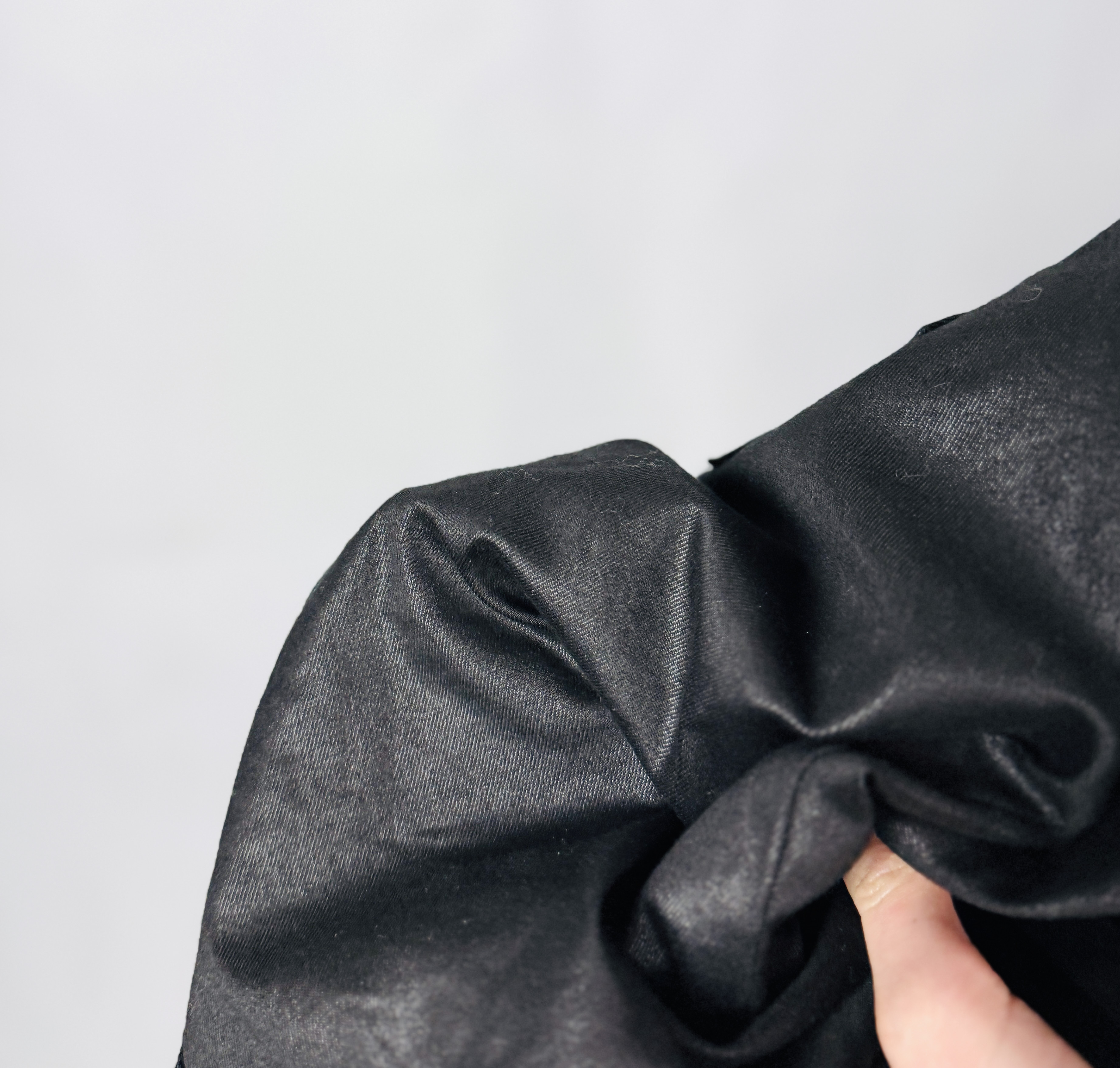 Materiał prezentuje się jako gładki i lekko połyskujący, o delikatnej, satynowej poświacie; powierzchnia subtelnie łapie światło, a przy zgięciach tworzą się naturalne, miękkie marszczenia, które dodają całości autentycznego charakteru. Tkanina wydaje się mieć zwartą strukturę, a jednocześnie miękko układać się przy ciele, co przekłada się na komfort noszenia i estetyczne dopasowanie bez nadmiernego obciążania formy.