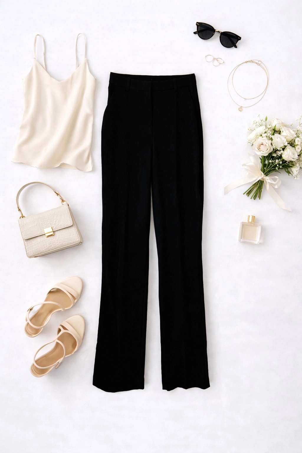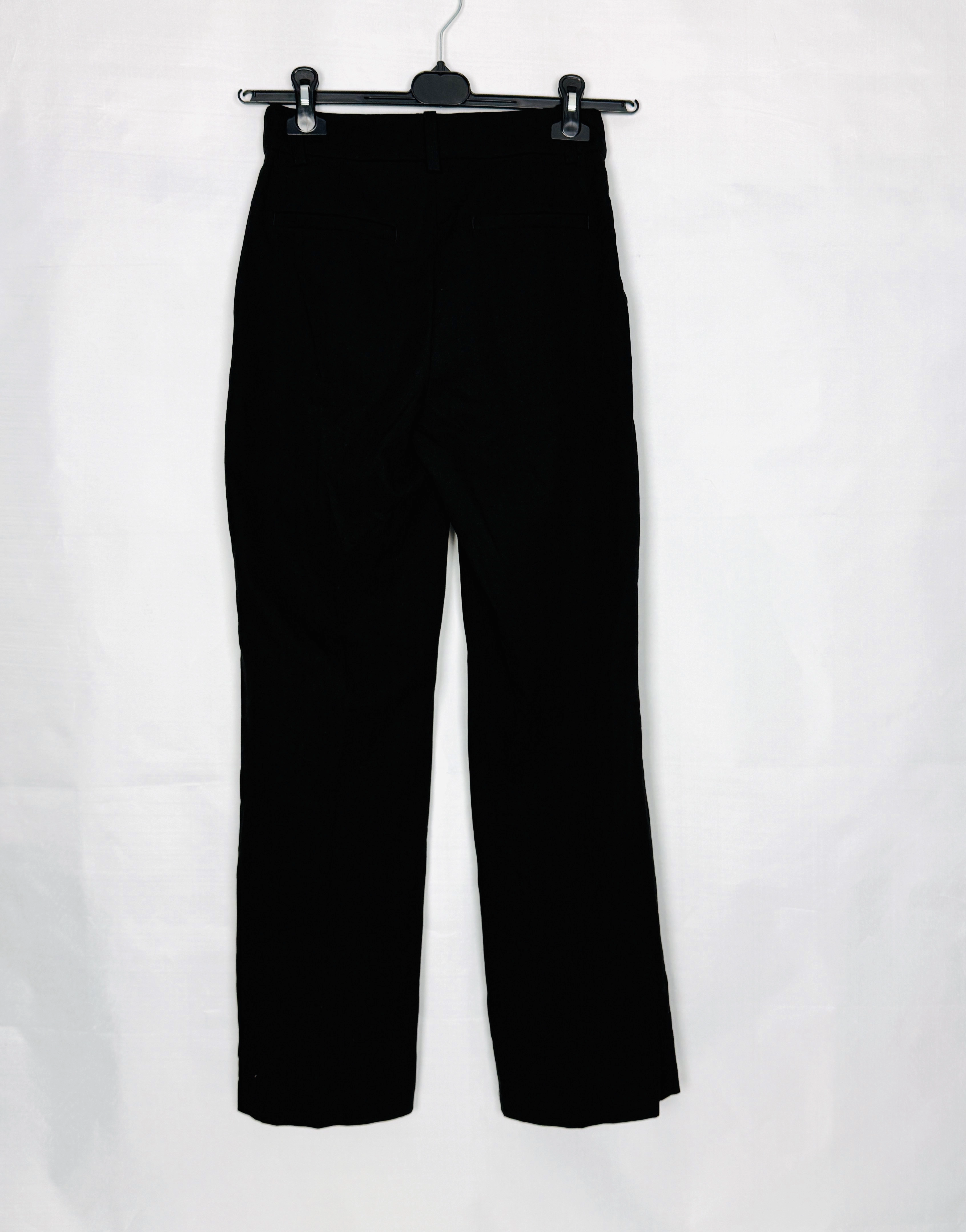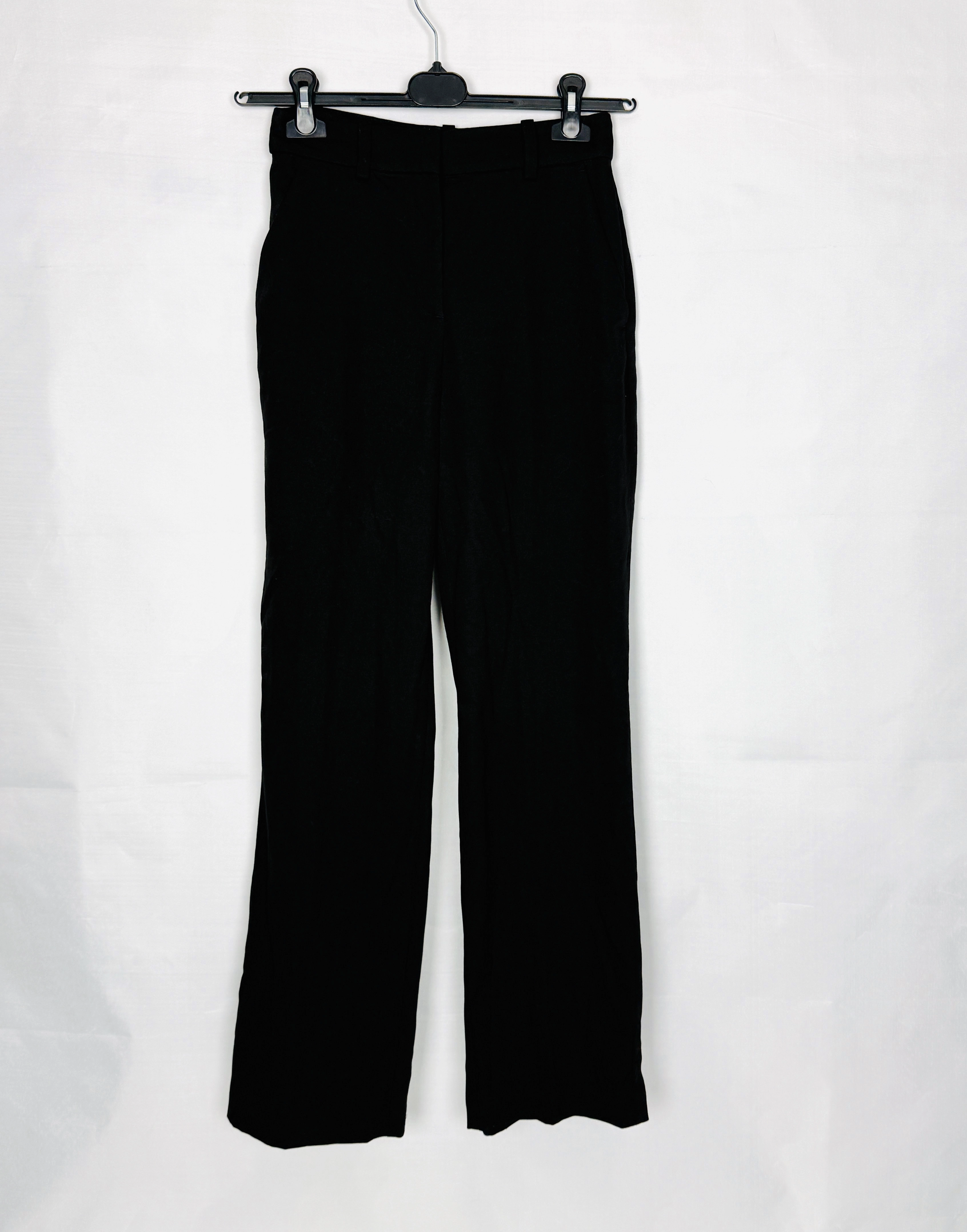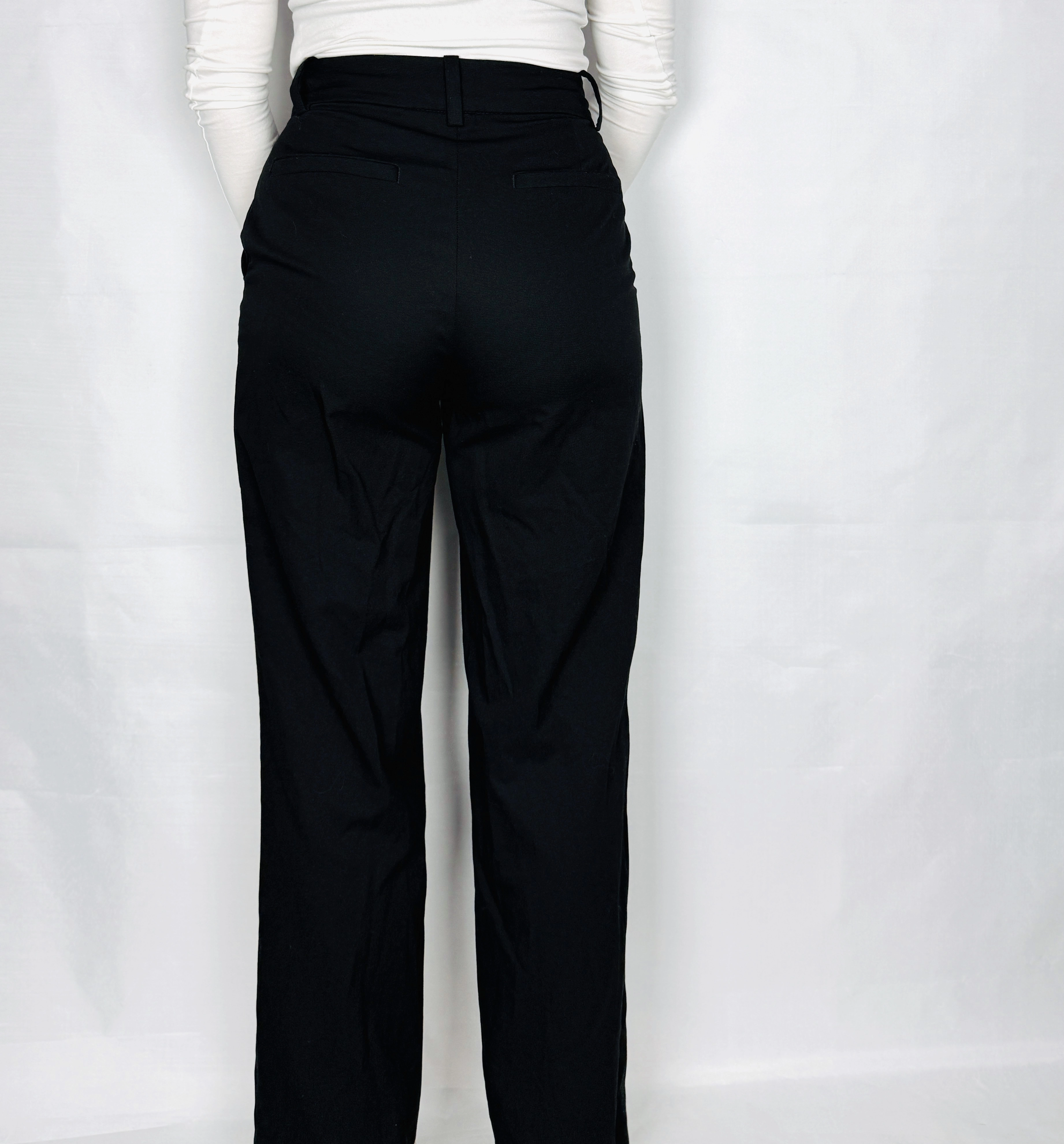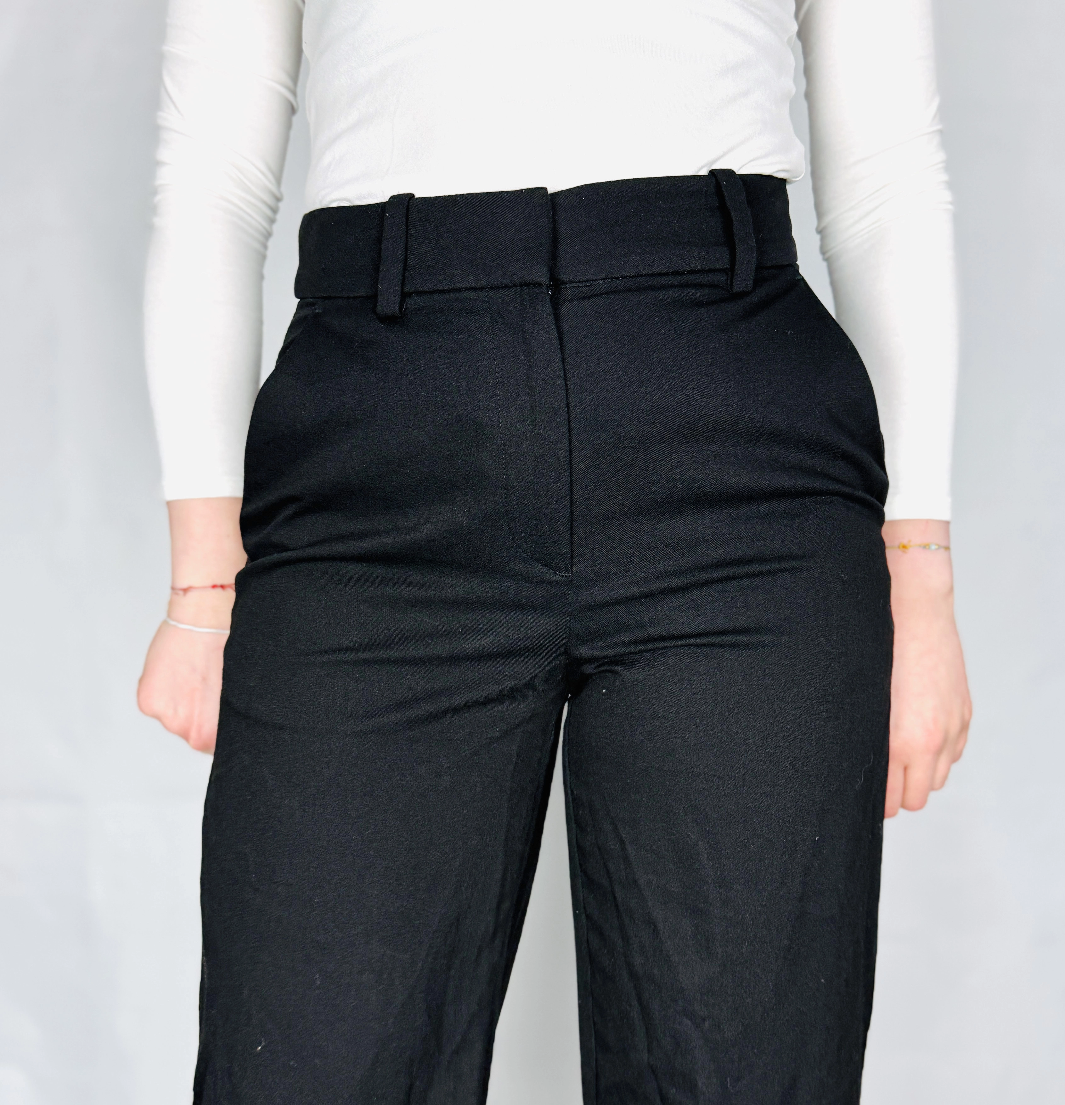Fason oparty jest na prostej, lekko swobodnej linii, która miękko opada wzdłuż nóg, nie opinając ich nadmiernie. Wysoki stan subtelnie podkreśla talię i pomaga wyrównać proporcje sylwetki, jednocześnie zapewniając wygodę. Górna część jest uporządkowana i dobrze dopasowana, co nadaje całości schludnego, eleganckiego wyglądu. Nogawki są proste i wydłużone, co optycznie wysmukla nogi i dodaje sylwetce lekkości.