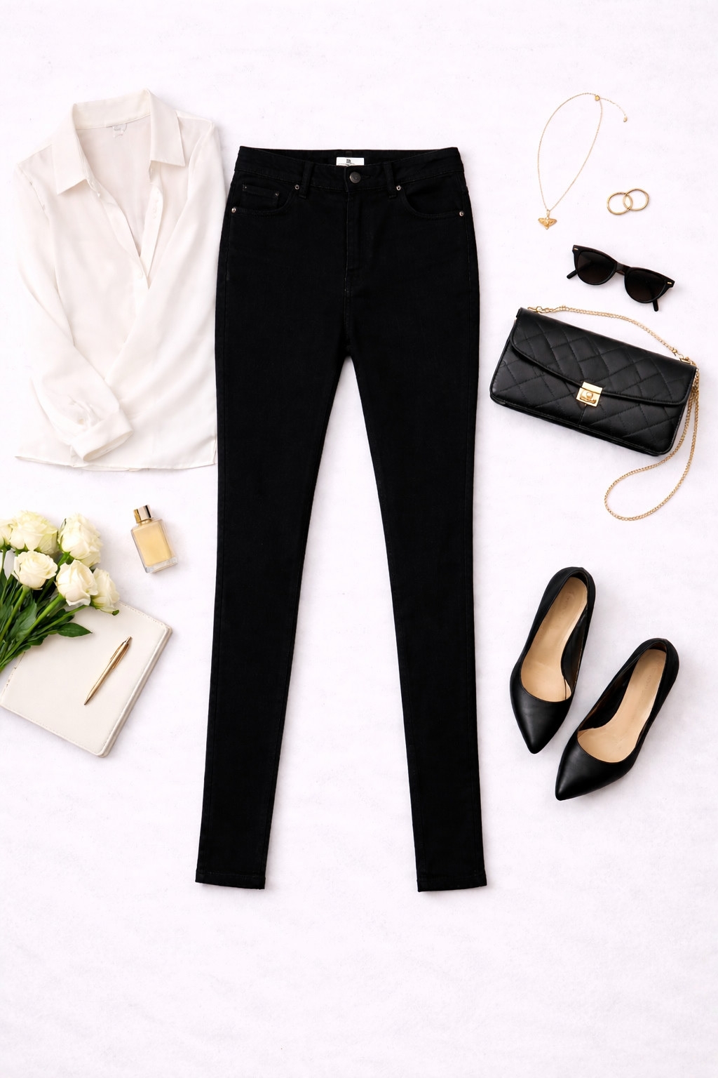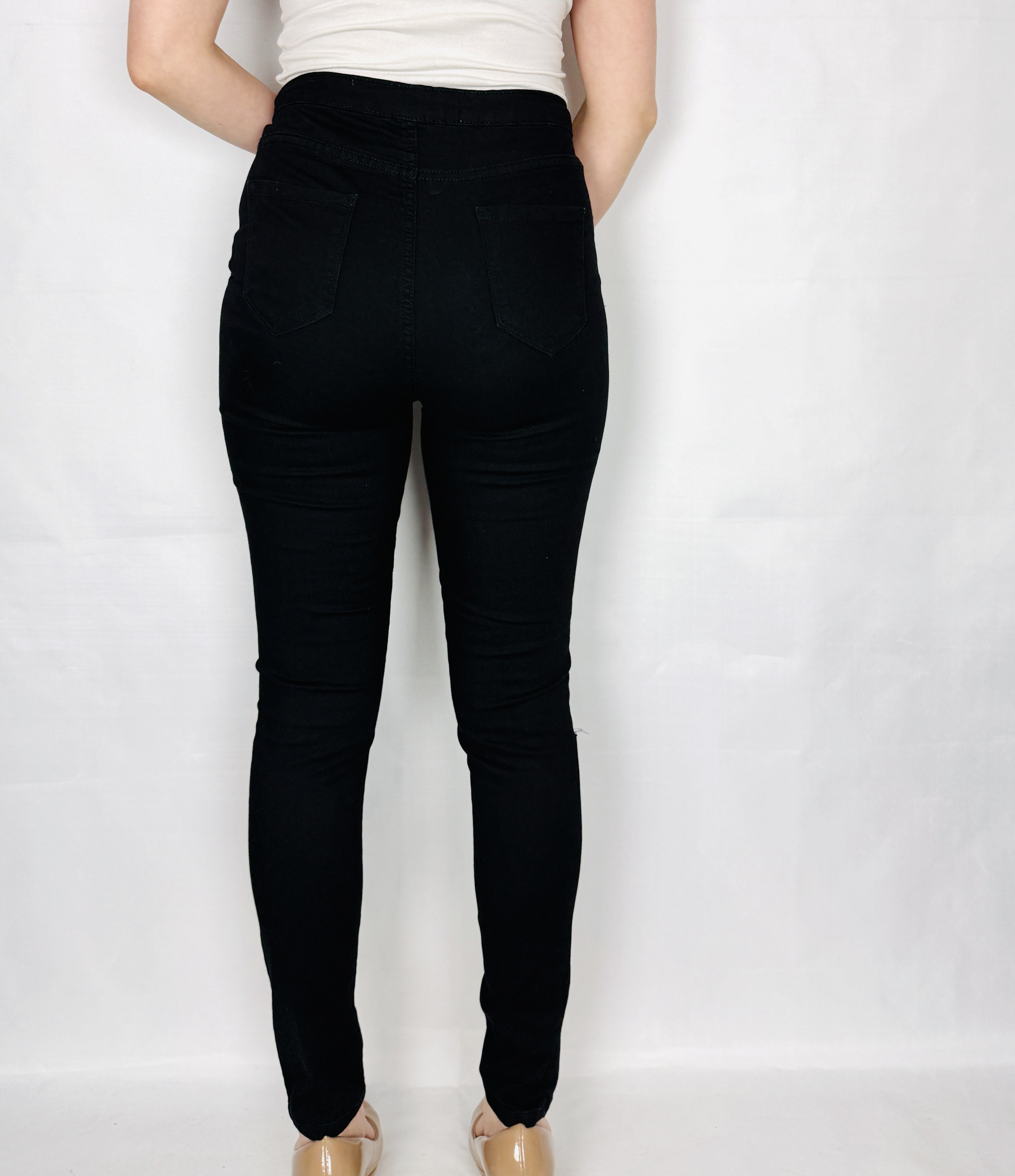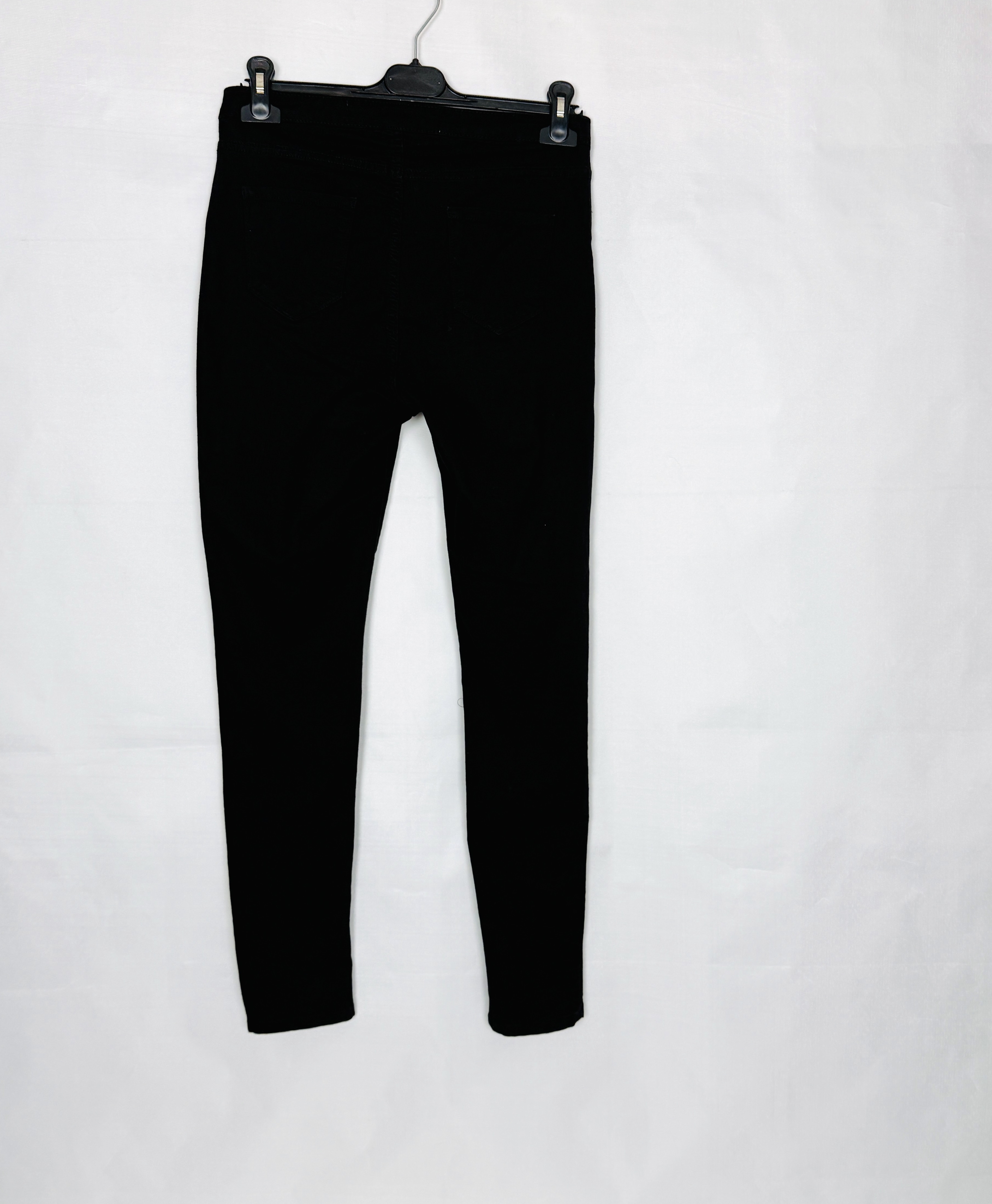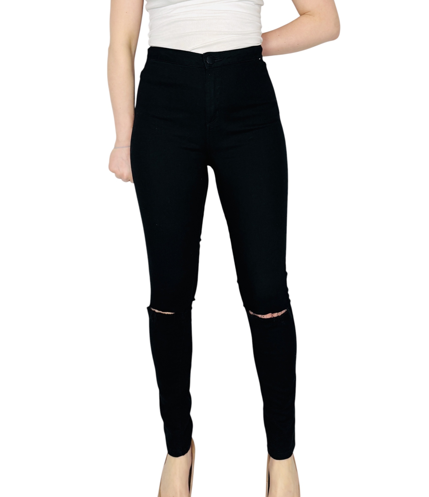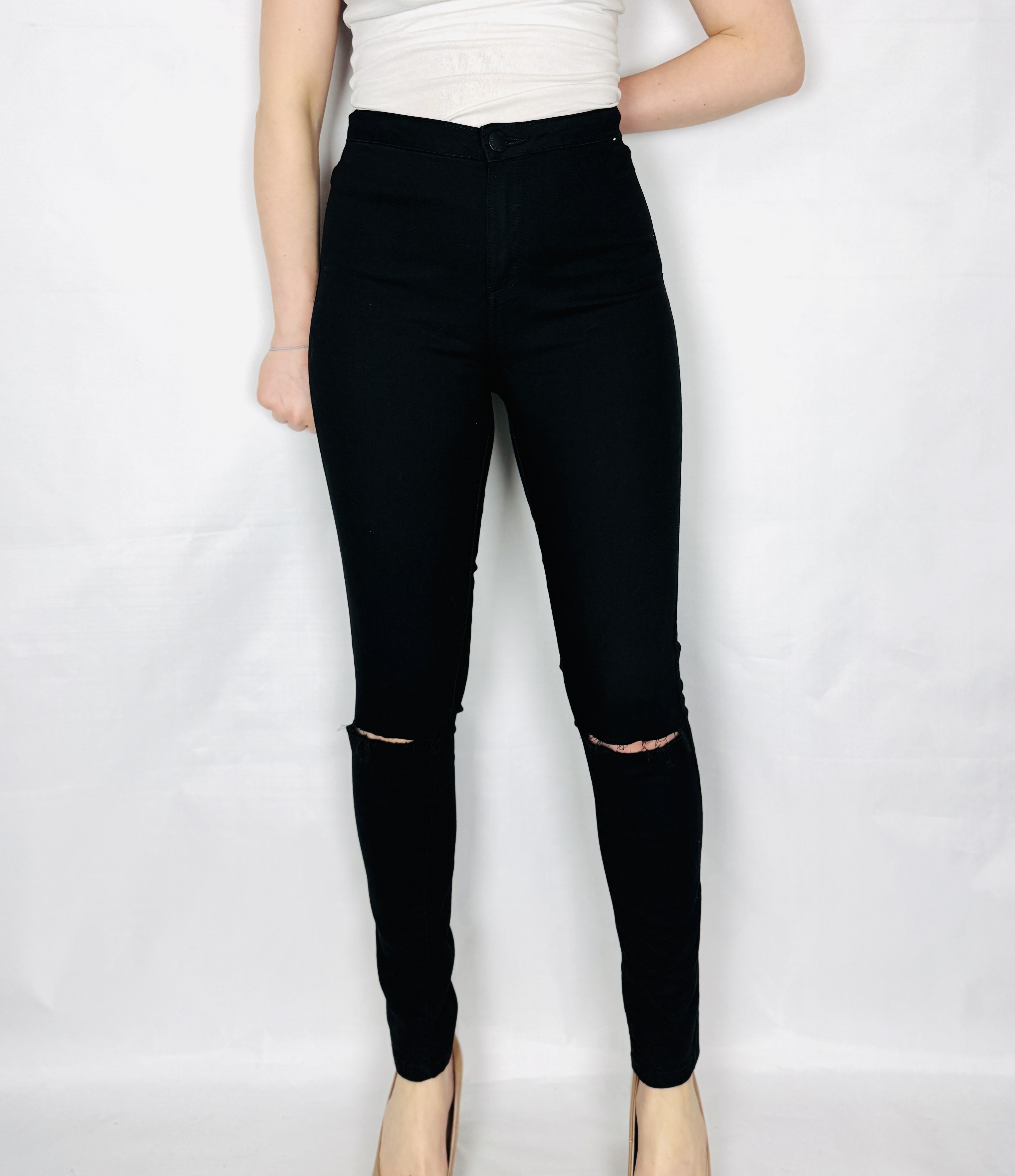 To wyrazisty, miejskiszny model, który łączy surowy charakter denimu z kobiecą, uporządkowaną linią. Głęboka czerń nadaje spodniom eleganckiego, nieco zmysłowego wyrazu, a jednocześnie pozostawia miejsce na swobodę i codzienny luz dzięki wyrazistym przetarciom przy kolanach. Całość ma nowoczesny, lekko buntowniczy temperament, ale pozostaje na tyle stonowana, że z łatwością wpisze się w wiele stylizacji — od prostych, dziennych zestawów po wieczorowe zestawienia z wyższym obcasem.