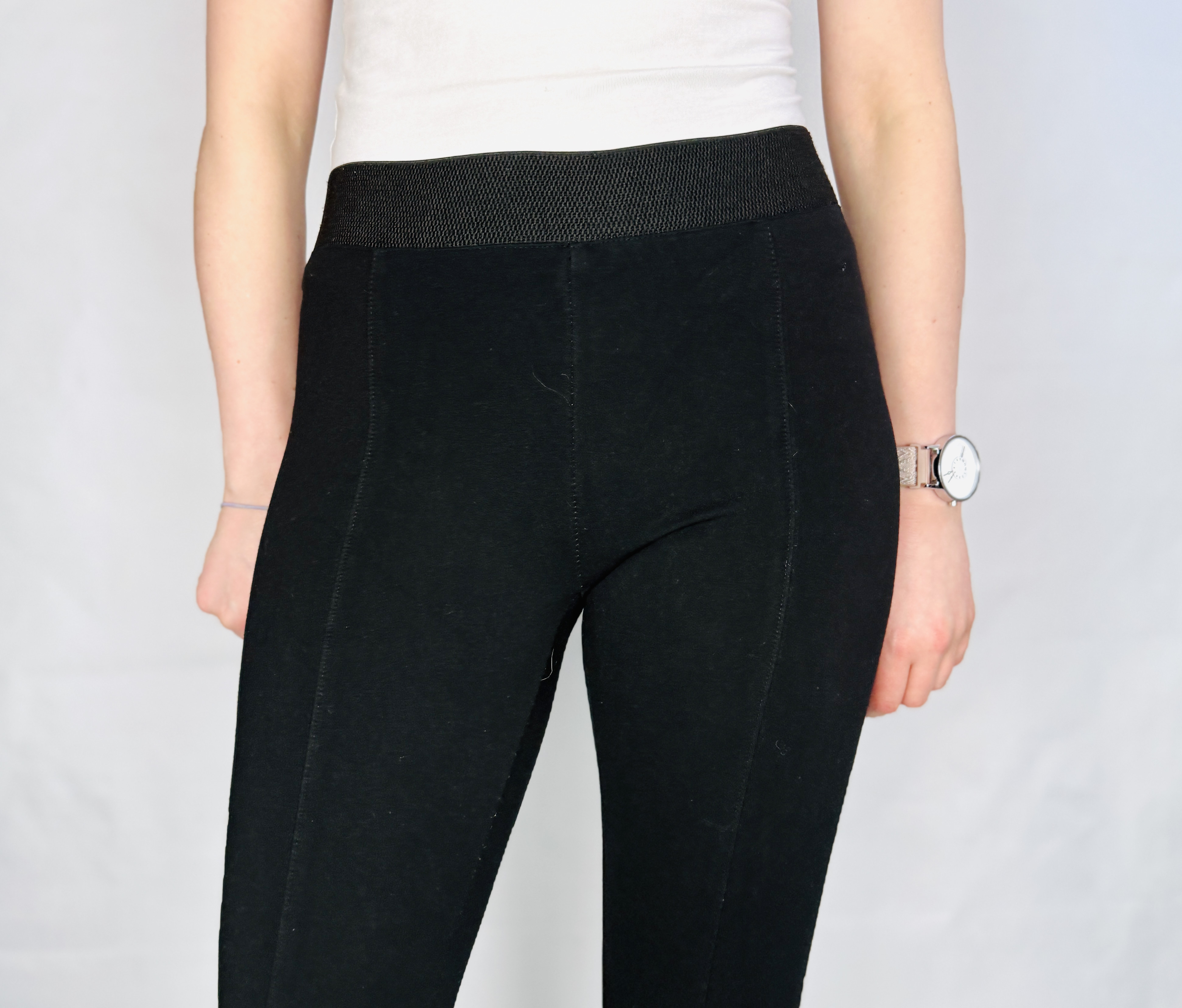 Materiał prezentuje się jako gładszy i matowy, jednocześnie elastyczny i sprężysty; tkanina wygląda na gęsto tkana i kryjąca, dzięki czemu zapewnia komfort oraz subtelną modelację sylwetki. Powierzchnia jest jednolita, bez połysku, co nadaje legginsom stonowanego, eleganckiego charakteru. Pas o prążkowanej fakturze kontrastuje delikatnie z gładkimi nogawkami, tworząc ciekawy, ale dyskretny detal.