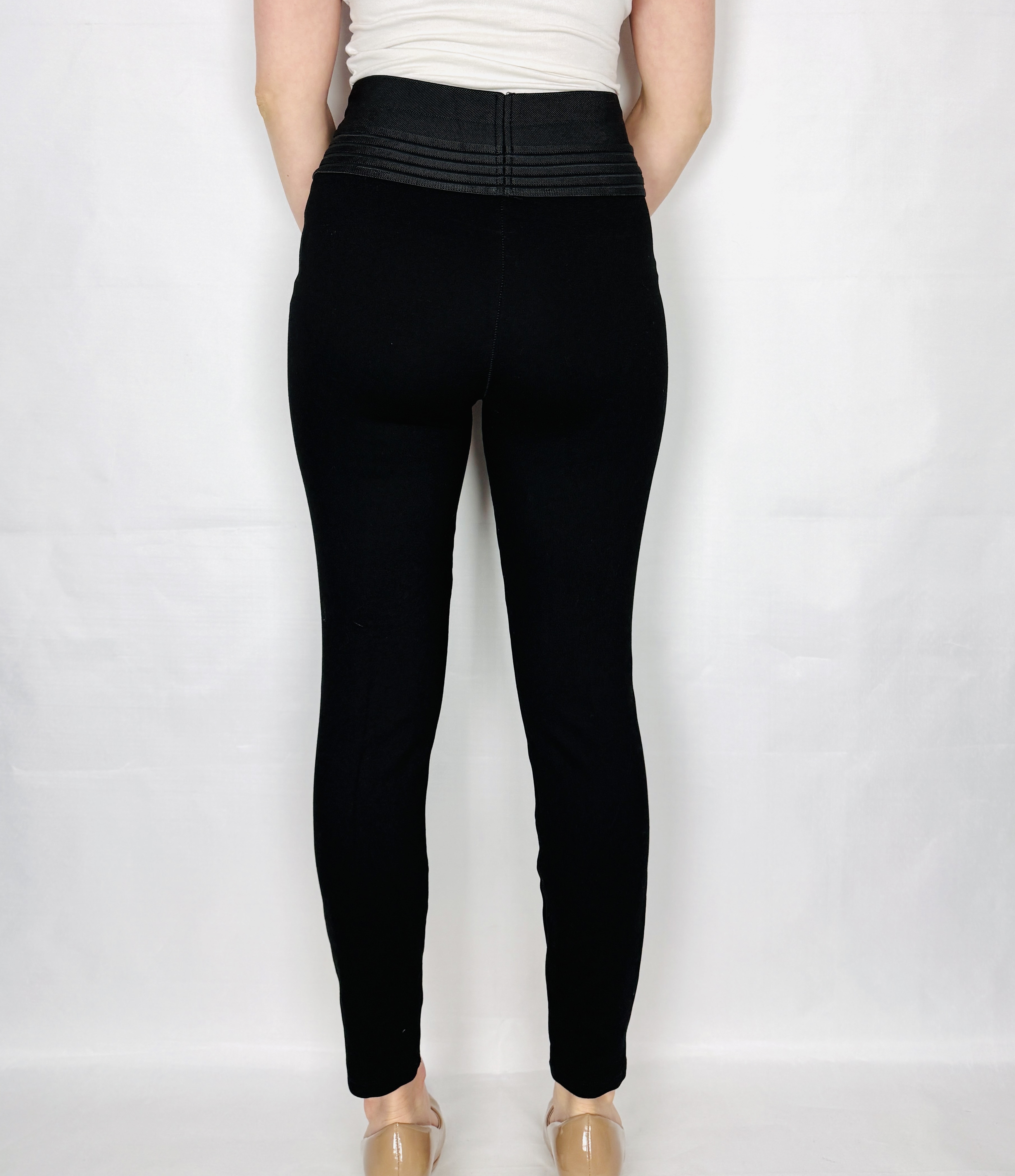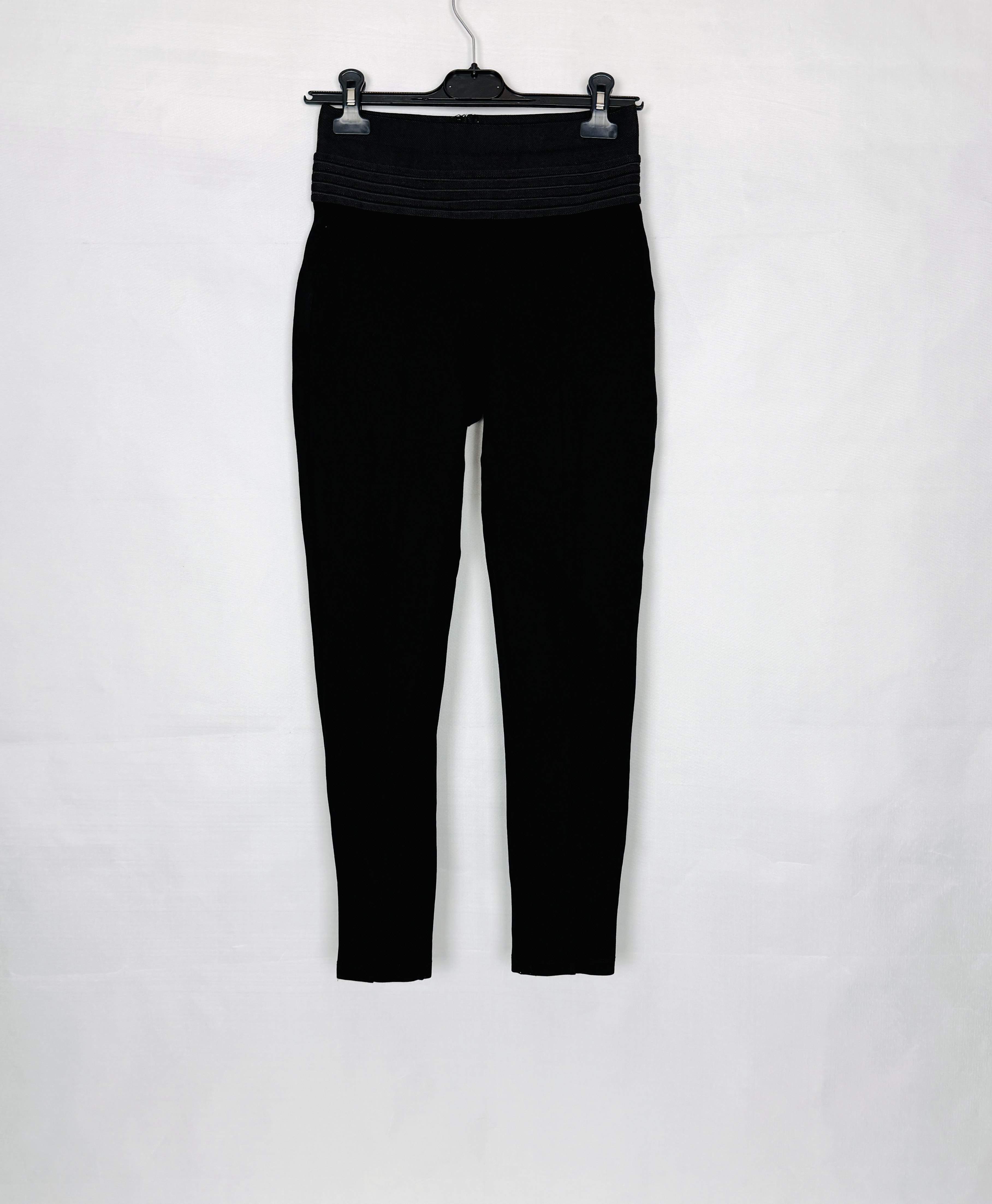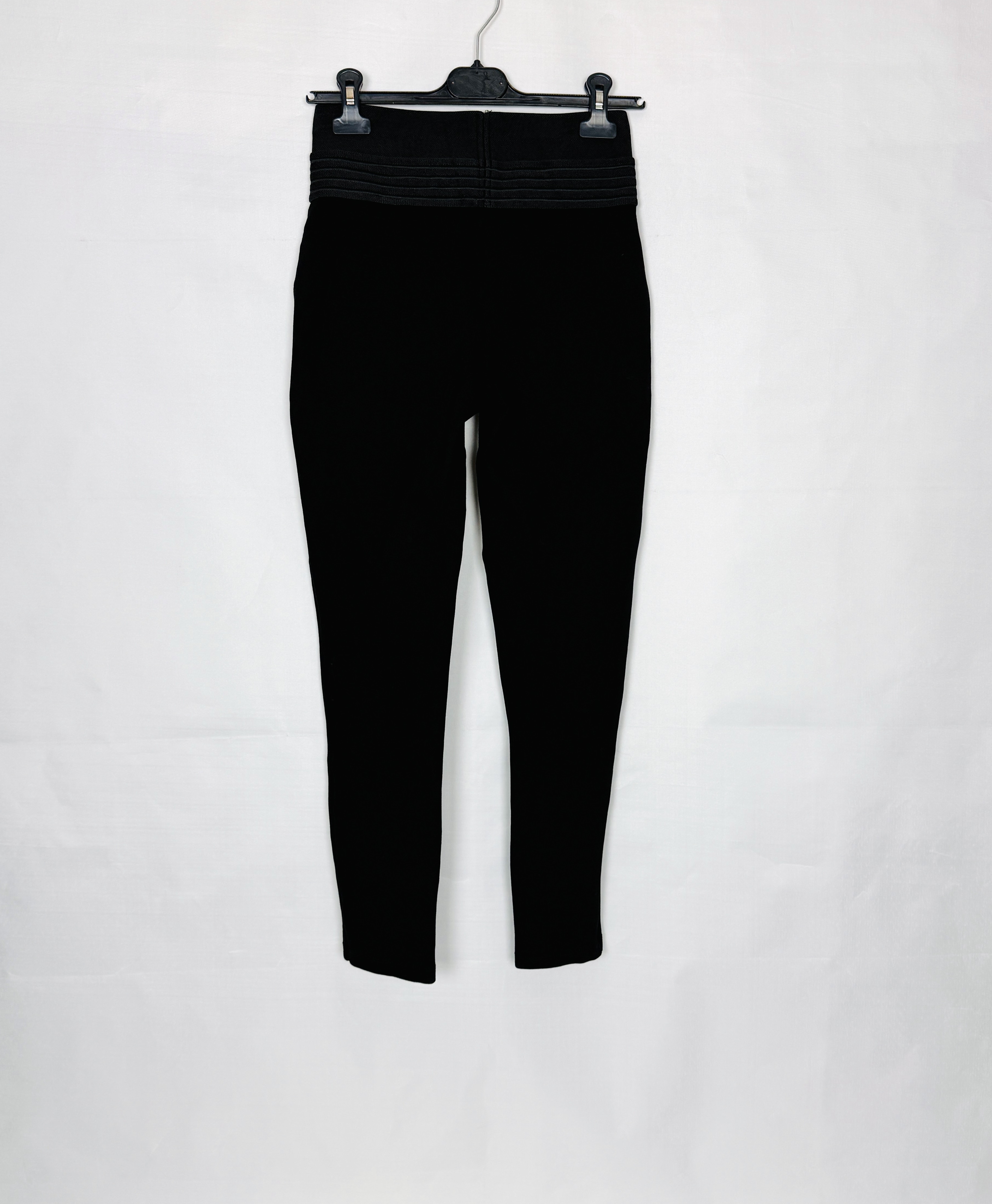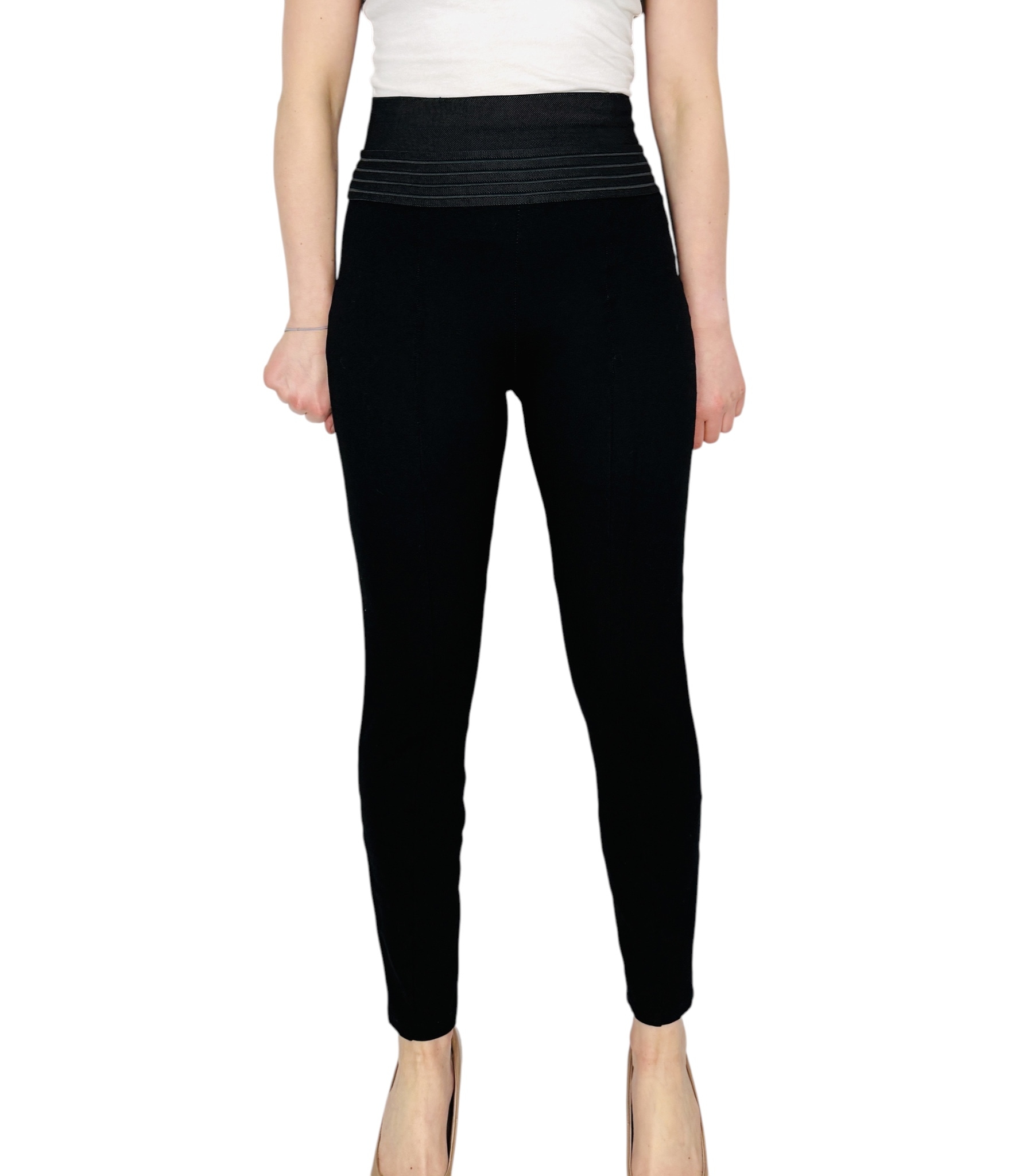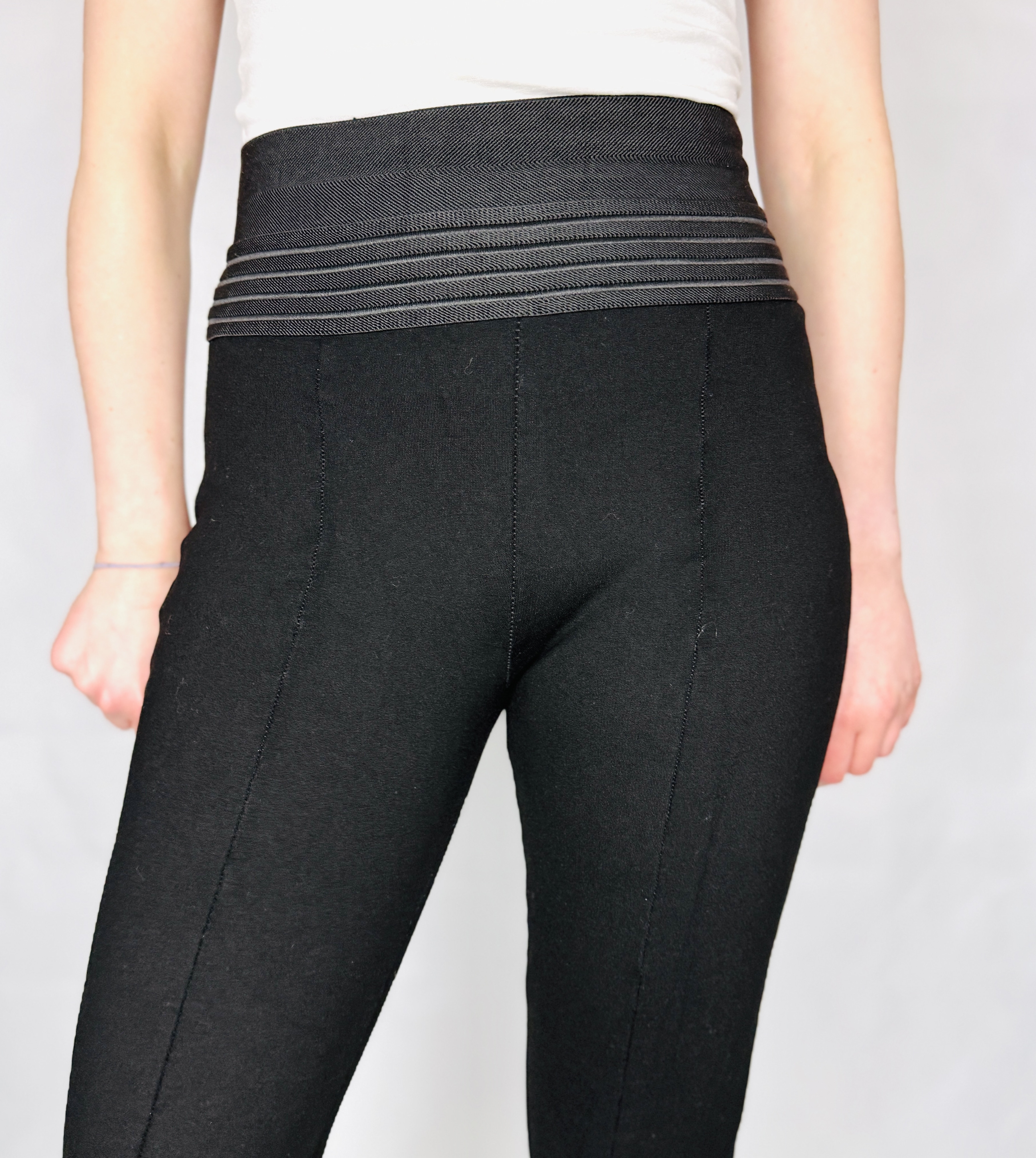 Fason cechuje się wyraźnie podwyższonym stanem z szerokim pasem w talii, ozdobionym subtelnym, poziomym przeszyciem tworzącym dekoracyjny akcent bez nadmiaru detali. Przód gładki i jednolity, nogawki dopasowane, sięgające kostek — długość i krój nadają sylwetce smukłości i harmonii. Brak zbędnych kieszeni czy zdobień utrzymuje czystą linię, co podkreśla uniwersalność modelu i ułatwia komponowanie stylizacji. Konstrukcja legginsów tworzy efekt lekko ujętej figury, a prosta linia nogawki daje elegancki, wydłużający rezultat.