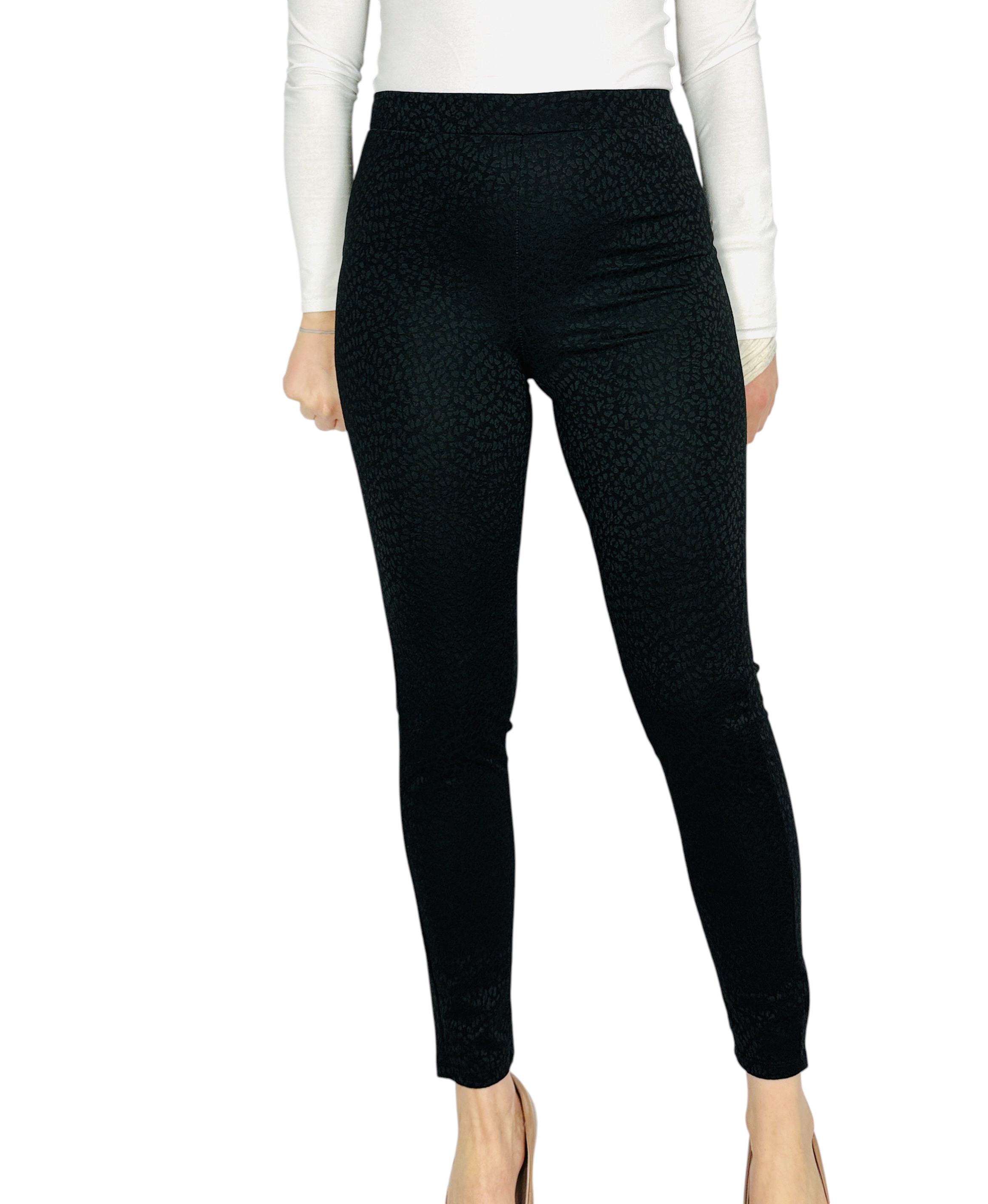 Górna część charakteryzuje się wysokim stanem z elastycznym pasem, który porządkuje linię talii i daje komfort noszenia; pas jest gładki i pozbawiony zbędnych detali, co podkreśla minimalistyczny charakter konstrukcji. Tył prezentuje równą, uporządkowaną powierzchnię z delikatnym przeszyciem wzdłuż środka, natomiast brak widocznych kieszeni czy ozdobnych elementów sprawia, że wzór cętek pozostaje głównym punktem zainteresowania. Nogawki są mocno dopasowane, przylegają do nóg aż do kostki, co tworzy smukłą, harmonijną linię.