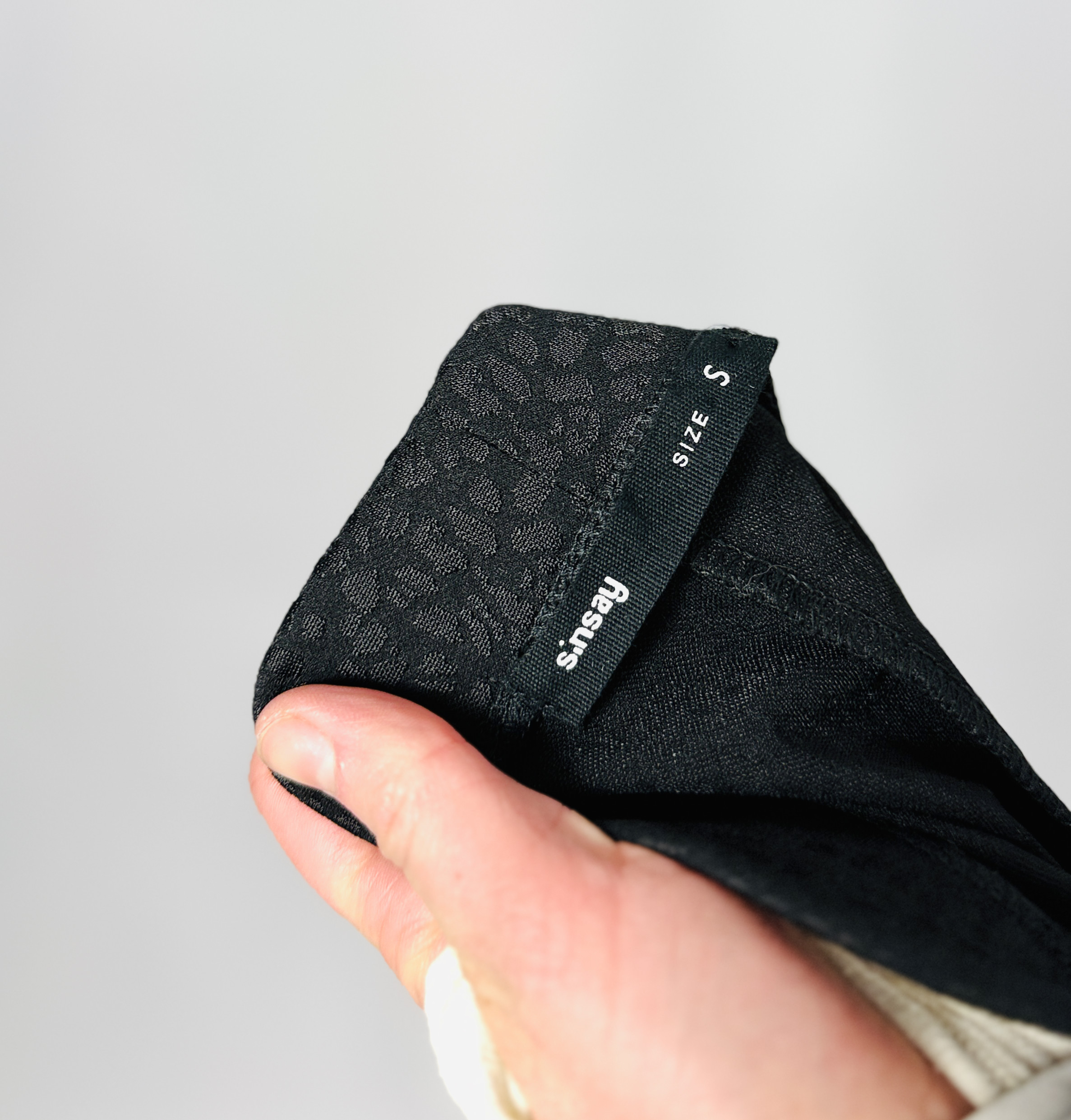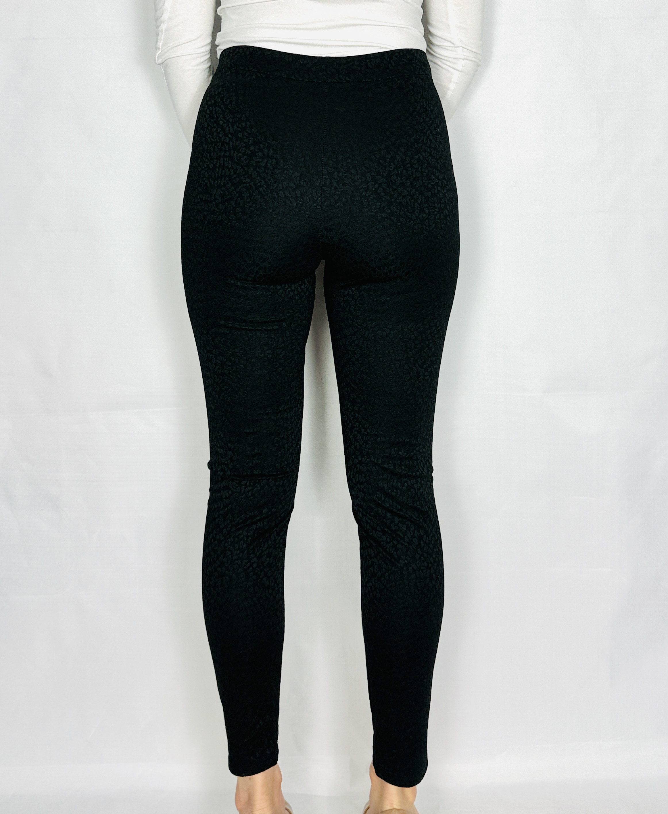 Materiał wygląda na miękko układający się i elastyczny, z matowym wykończeniem, które subtelnie przyjmuje światło; drobne zagniecenia w miejscach zgięć potwierdzają swobodę ruchu i komfort użytkowania. Wzór cętek jest ton‑w‑ton, delikatnie wtopiony w czarne tło, co daje efekt teksturowanej głębi bez rażącego kontrastu. Taka kombinacja faktury i wzoru sprawia, że legginsy mają zarówno codzienny, jak i lekko szykowny charakter — można w nich czuć się wygodnie, nie rezygnując z estetycznego dopracowania.
