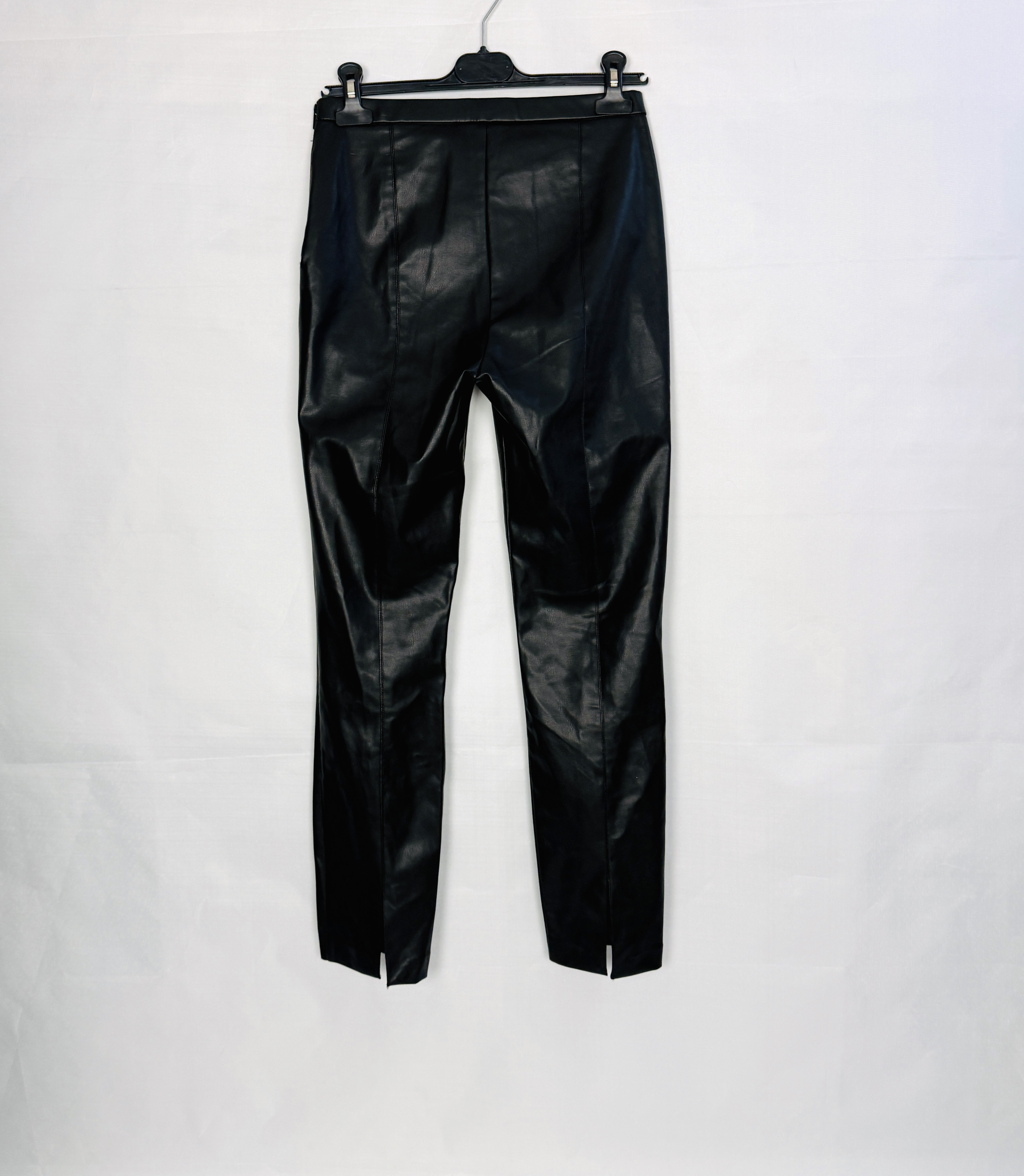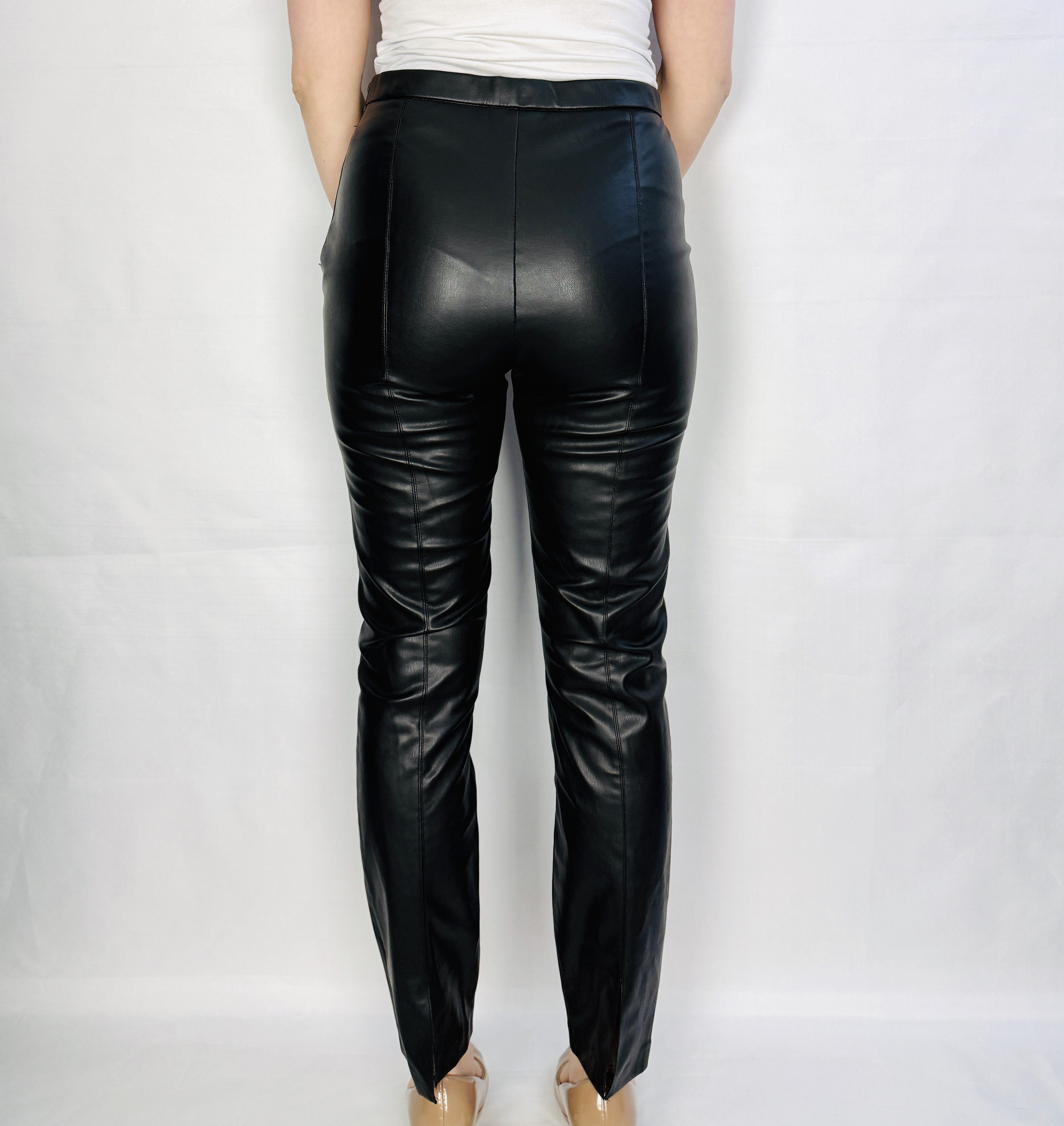 Konstrukcja ma wyraźnie wysoki stan, który podkreśla linię talii i wprowadza harmonijną proporcję między tułowiem a nogami. Przód zdobią pionowe przeszycia biegnące od pasa ku dołowi, które modelują nogawkę i optycznie wydłużają sylwetkę. Nogawki są wąskie, prowadzone blisko ciała, a długość sięga kostki, dzięki czemu spodnie pięknie eksponują buty i nadają sylwetce eleganckiego, wysmuklonego efektu. Widoczne są delikatne marszczenia i naturalne drapowania, które dodają autentycznego charakteru i podkreślają skórzane wykończenie.