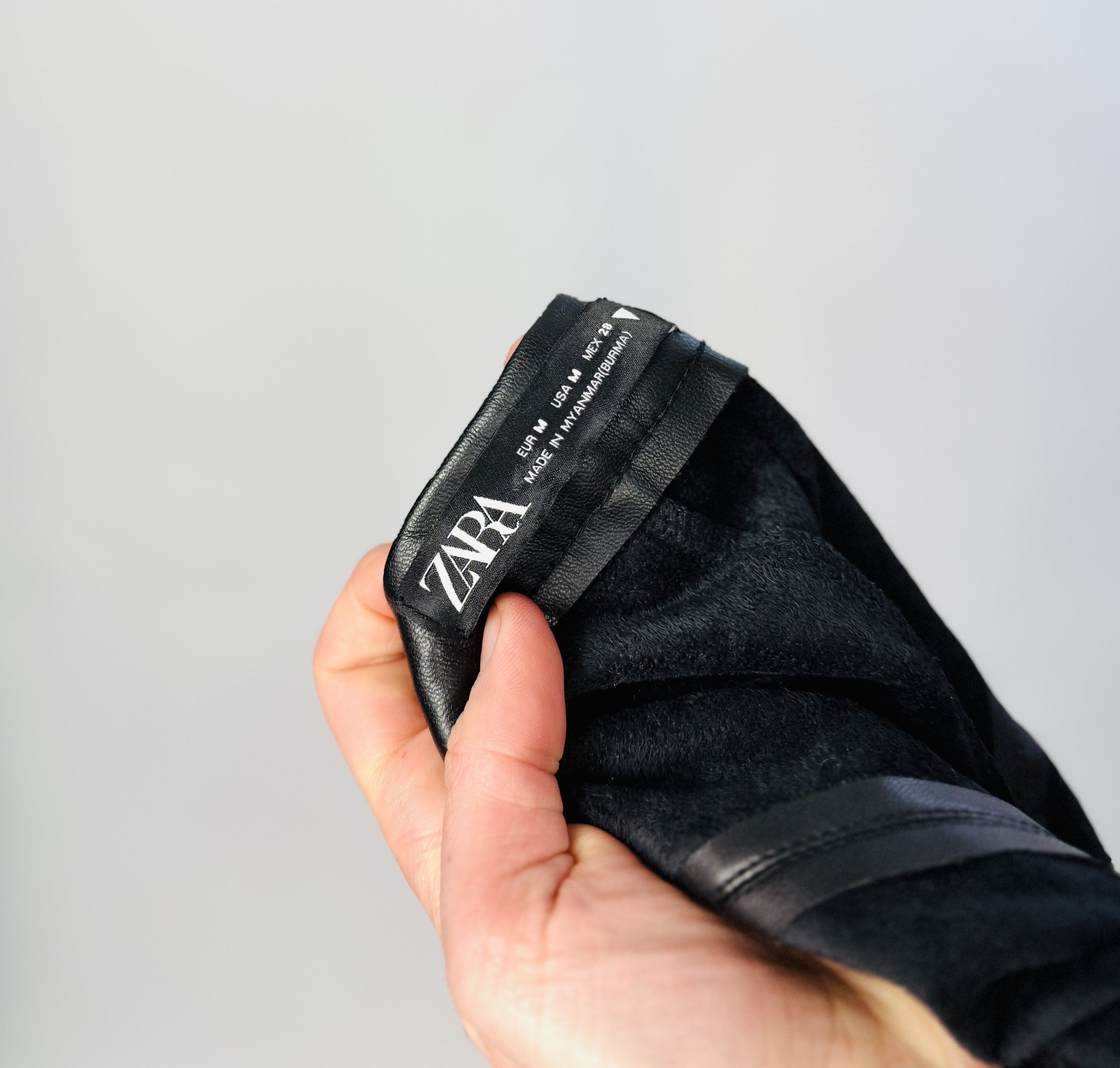 Materiał prezentuje się jako gładki i nieco połyskujący, o wyraźnej, skórzanej fakturze — wygląda na nieco sztywniejszy, co pomaga zachować formę i daje uporządkowane, schludne linie. Powierzchnia delikatnie odbija światło, dzięki czemu przeszycia i kontury nabierają głębi, a drobne załamania materiału dodają całości naturalnej ekspresji. Taki materiał ładnie trzyma kształt, a jednocześnie podkreśla sylwetkę, tworząc zmysłowy, zdecydowany efekt.