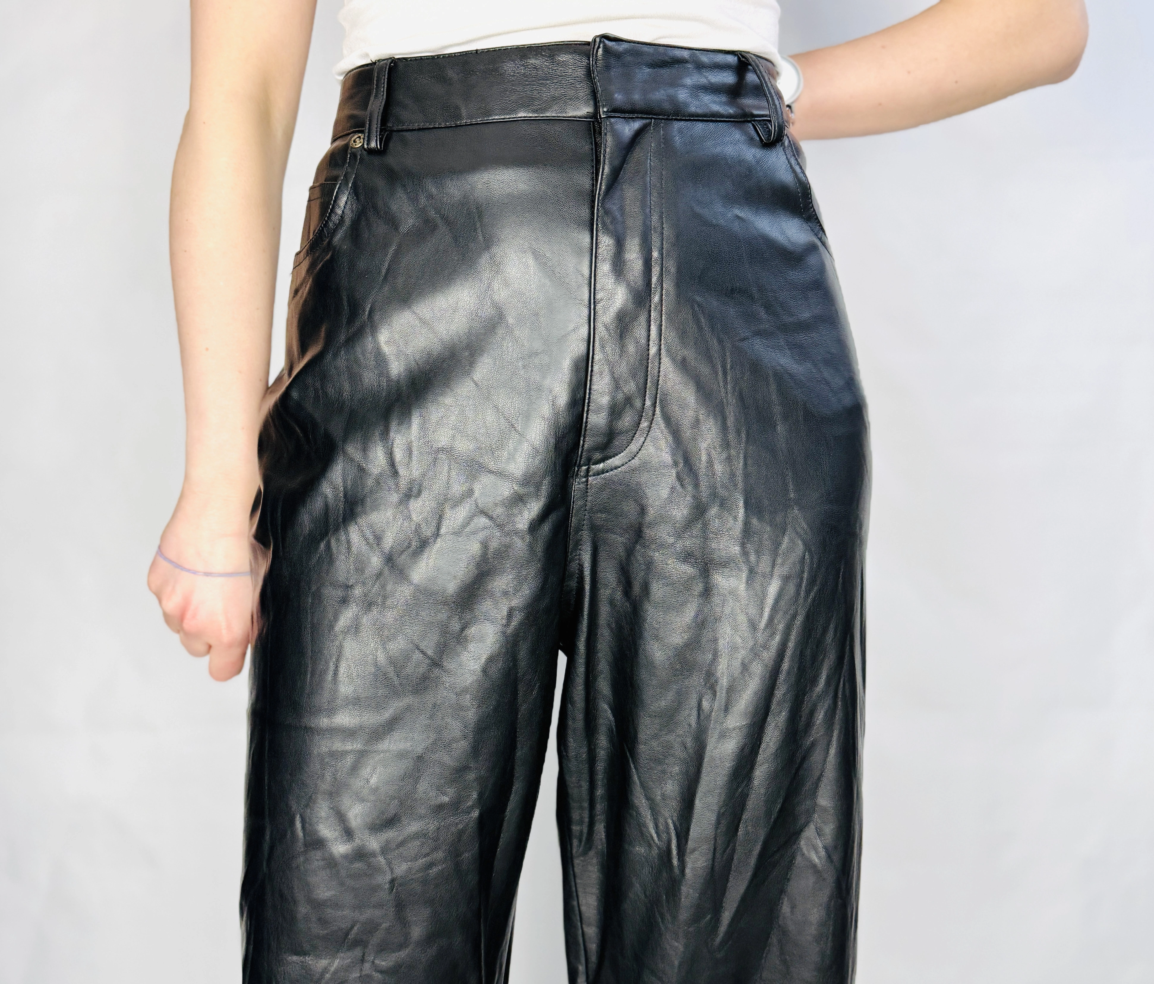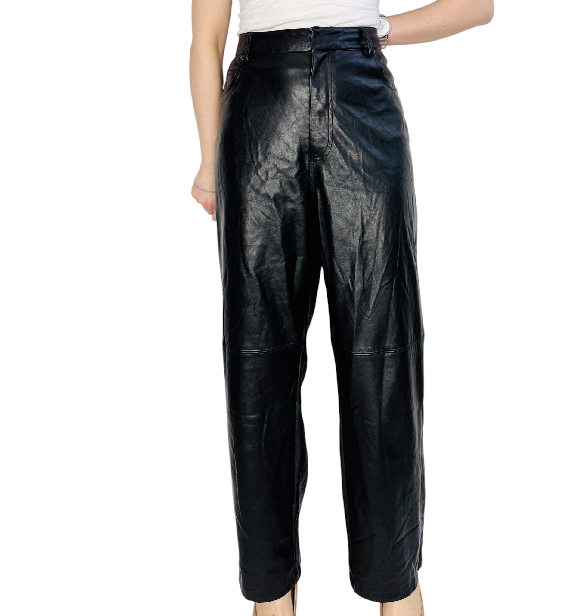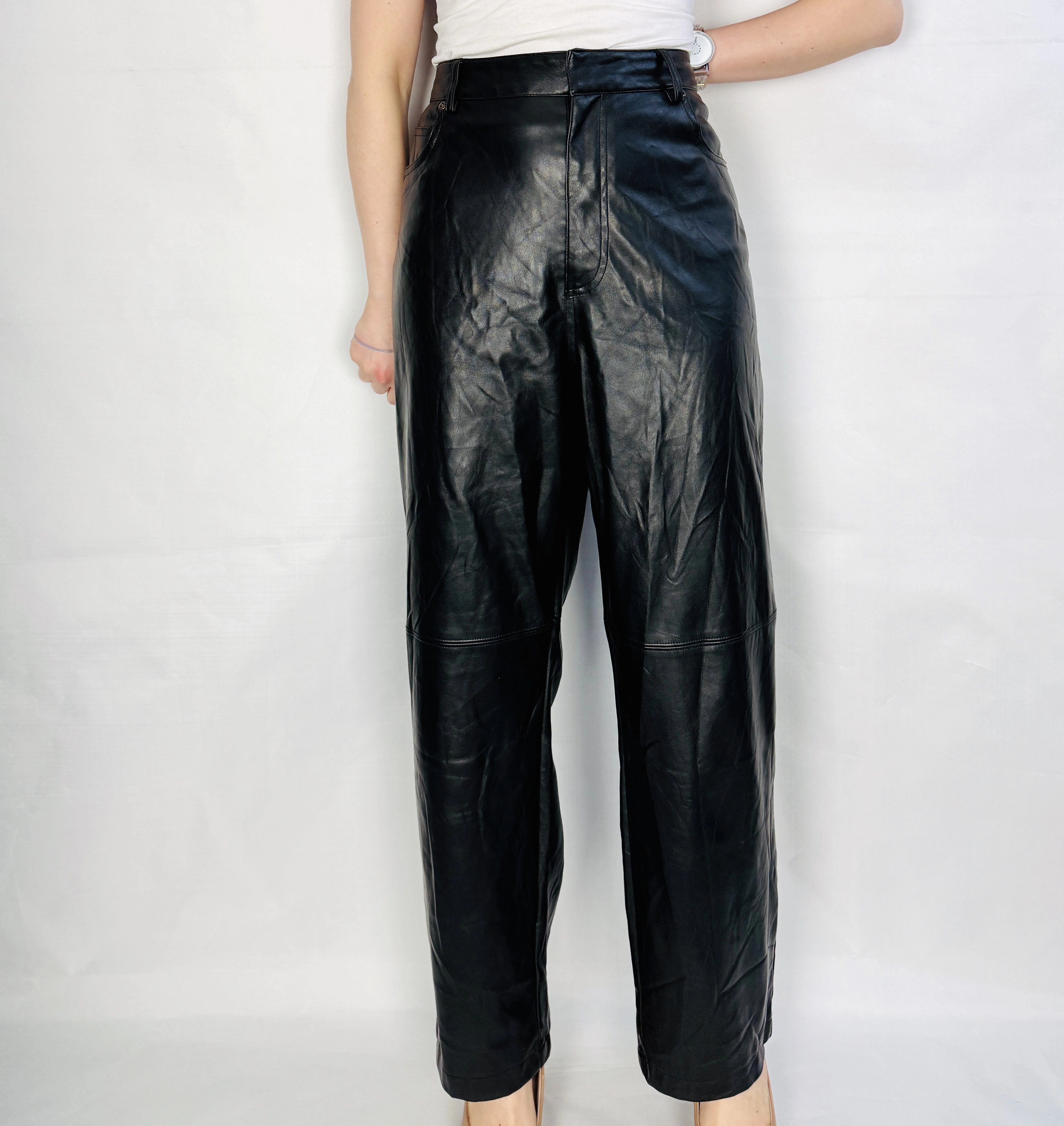 Materiał prezentuje się jako skórzany o gładkiej, lekko połyskującej powierzchni — wygląda na nieco sztywniejszy, nieco grubszy, dzięki czemu spodnie zachowują formę i mają uporządkowane drapowania. Widoczne są naturalne zmarszczenia i delikatne przetarcia, które dodają autentycznego, nieco surowego wyrazu, nadając ubraniu charakter vintage w eleganckim wydaniu. Powierzchnia odbija światło w sposób subtelny, co podkreśla linię nogawki i przeszycia, a jednocześnie zachowuje matowość na miarę klasycznego skórzanego wykończenia.