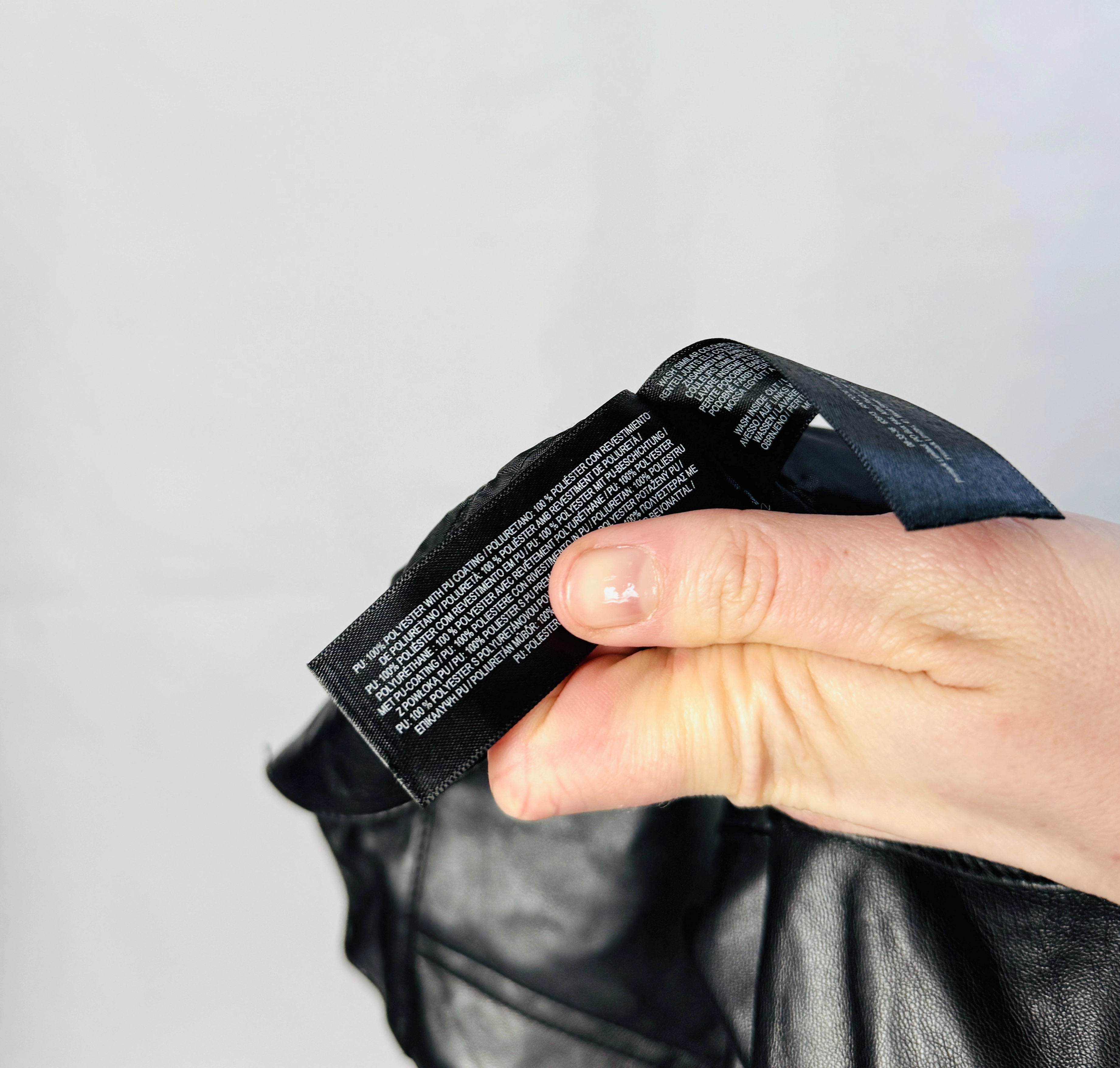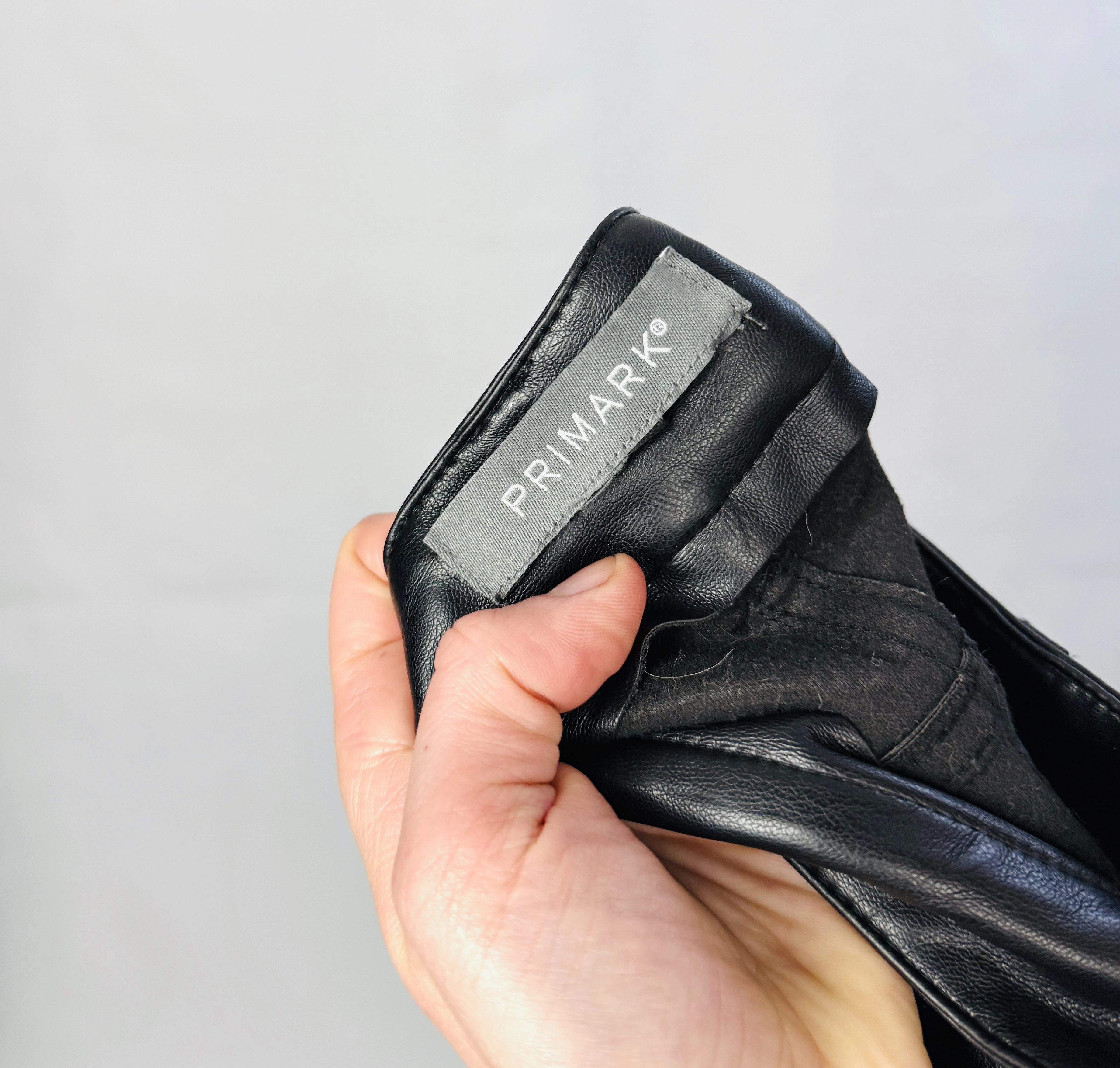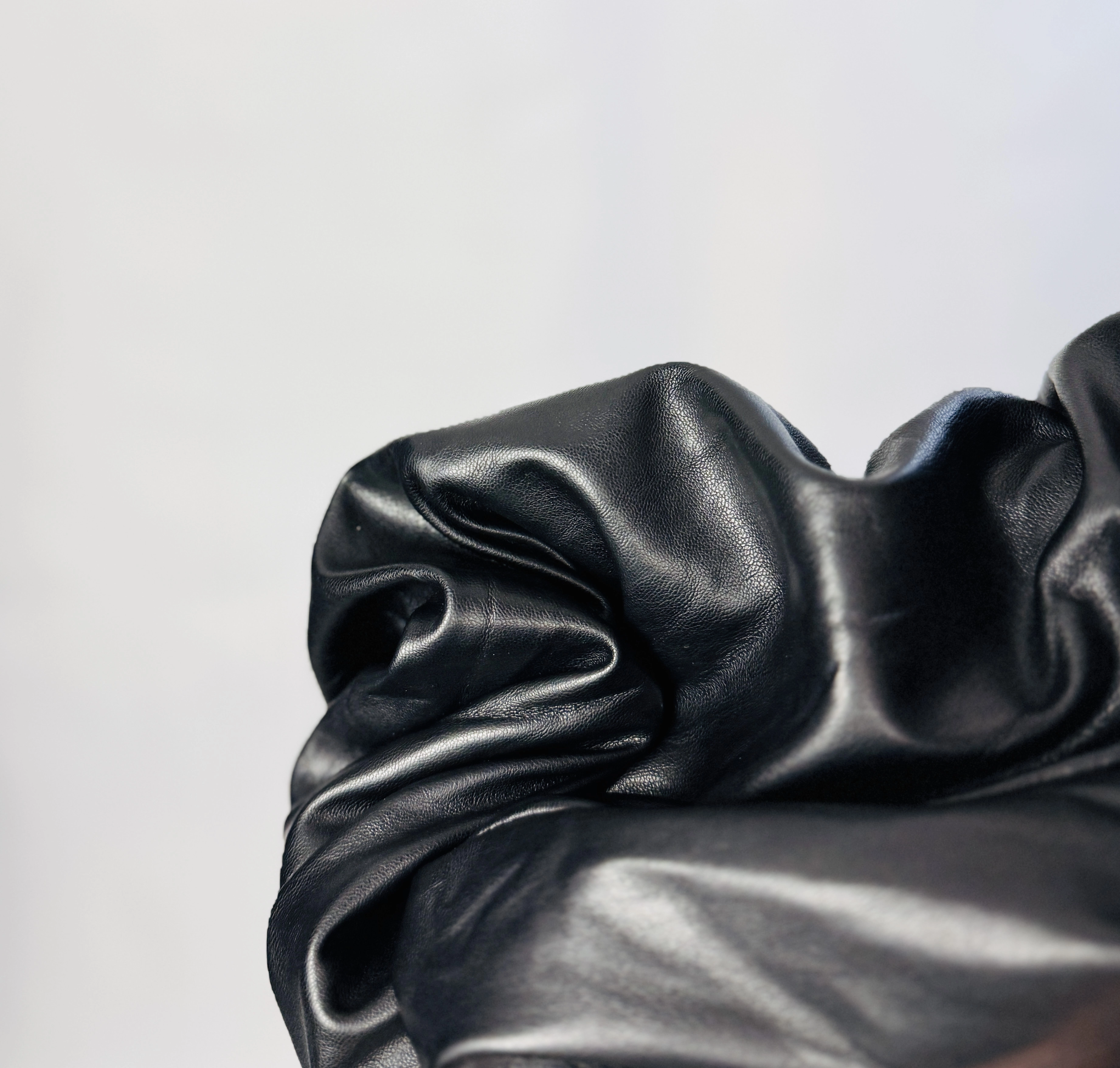 Materiał prezentuje się jako skórzany o gładkiej, lekko połyskującej powierzchni — wygląda na nieco sztywniejszy, nieco grubszy, dzięki czemu spodnie zachowują formę i mają uporządkowane drapowania. Widoczne są naturalne zmarszczenia i delikatne przetarcia, które dodają autentycznego, nieco surowego wyrazu, nadając ubraniu charakter vintage w eleganckim wydaniu. Powierzchnia odbija światło w sposób subtelny, co podkreśla linię nogawki i przeszycia, a jednocześnie zachowuje matowość na miarę klasycznego skórzanego wykończenia.