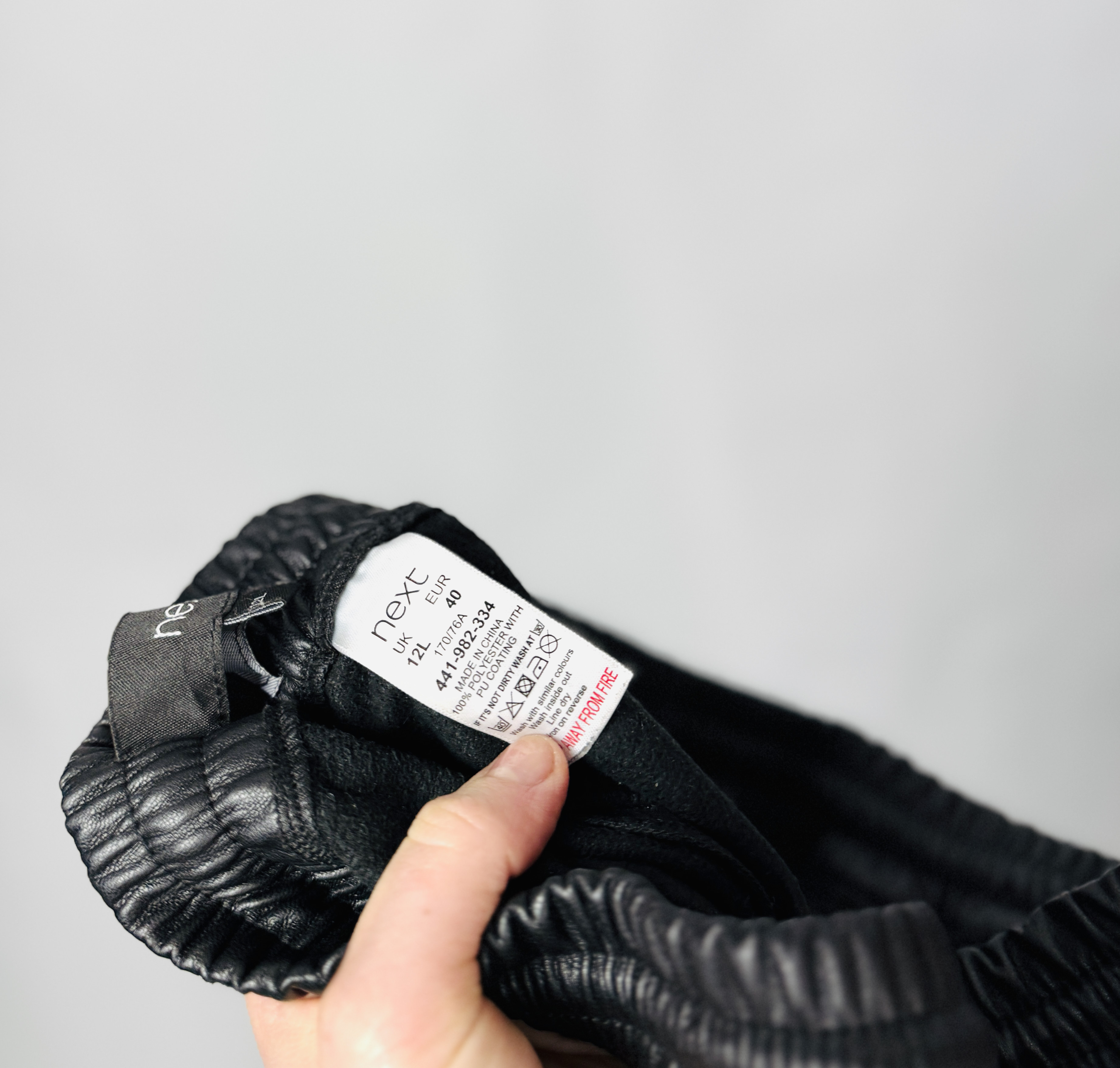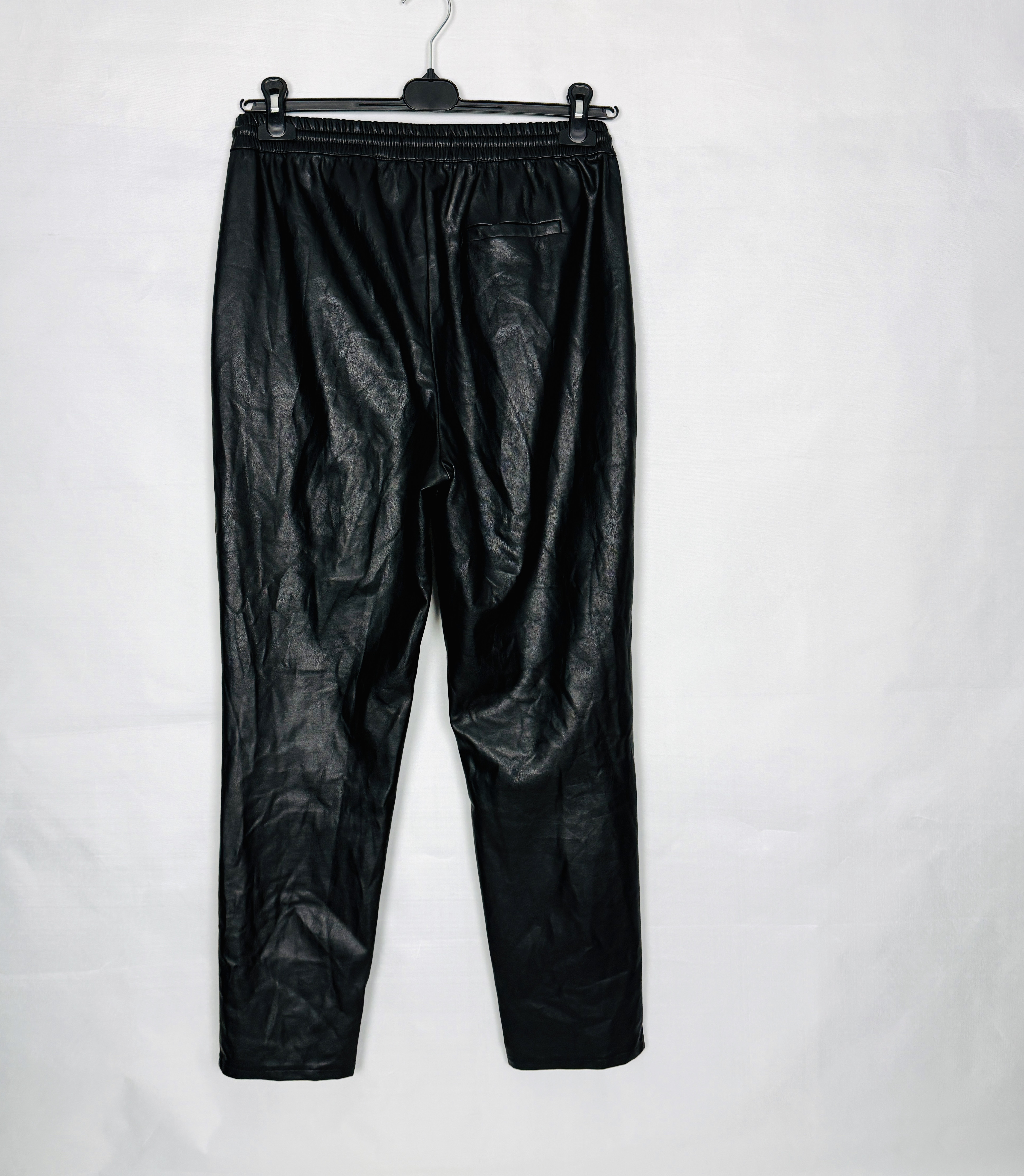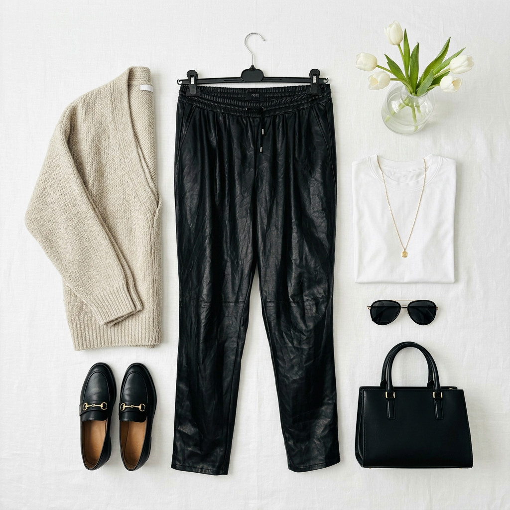 W stylizacjach spodnie są niezwykle wszechstronne: w wersji miejskiej połączysz je z dopasowanym, jasnym topem i sneakersami, na chłodniejsze dni zestaw z długim kardiganem lub oversize'ową marynarką, a na wieczór dobierz dopracowany top i szpilki lub eleganckie botki dla bardziej wyrazistego efektu. Czerń znakomicie komponuje się z bielą i kremem, ale także z głębszymi barwami — bordo, butelkowa zieleń czy granat dodadzą stylizacji eleganckiej głębi. To para dla osoby, która ceni połączenie wygody i charakterystycznego, skórzanego wykończenia.