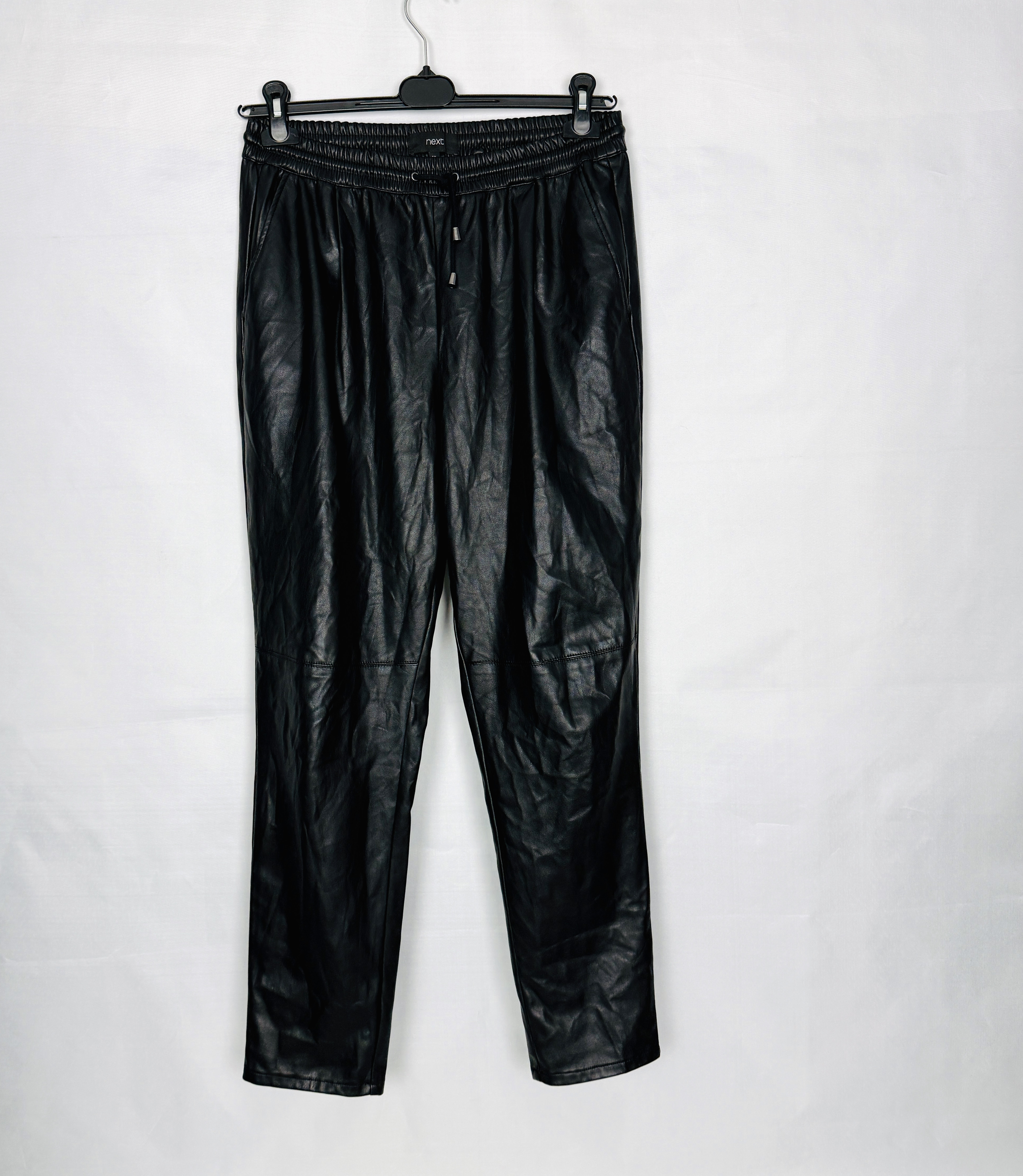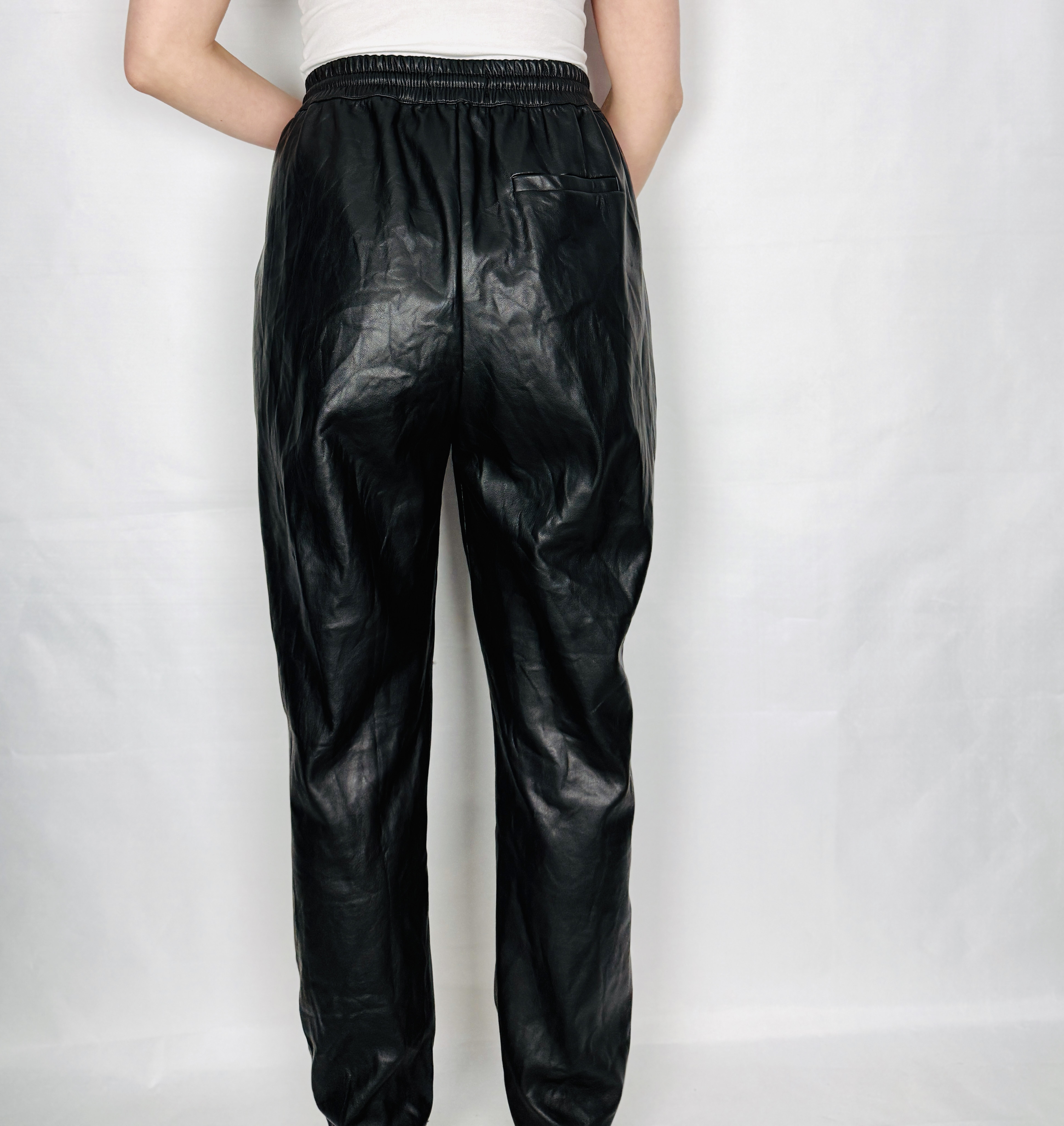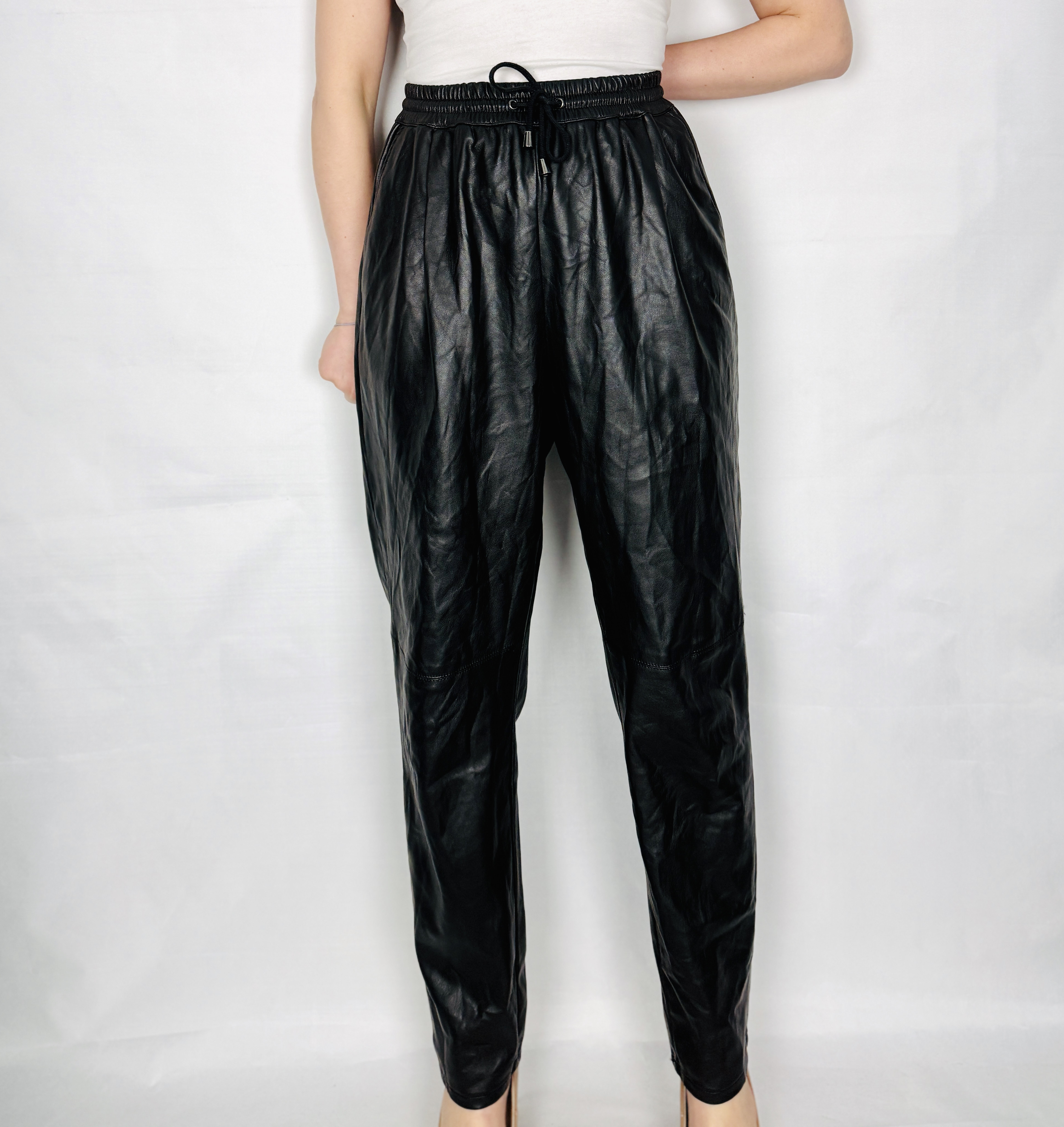 Te spodnie mają w sobie od razu wyczuwalny, miejski szyk — głęboka czerń i miękkie, skórzane wykończenie tworzą elegancki, a jednocześnie swobodny charakter. Całość posiada lekko dziewczęcy akcent dzięki drobnym marszczeniom przy pasie, które nadają formie subtelnej lekkości; to model, który łączy komfort z modowym wyrazem, idealny dla kobiety chcącej postawić na efektowny, lecz nienachalny look.