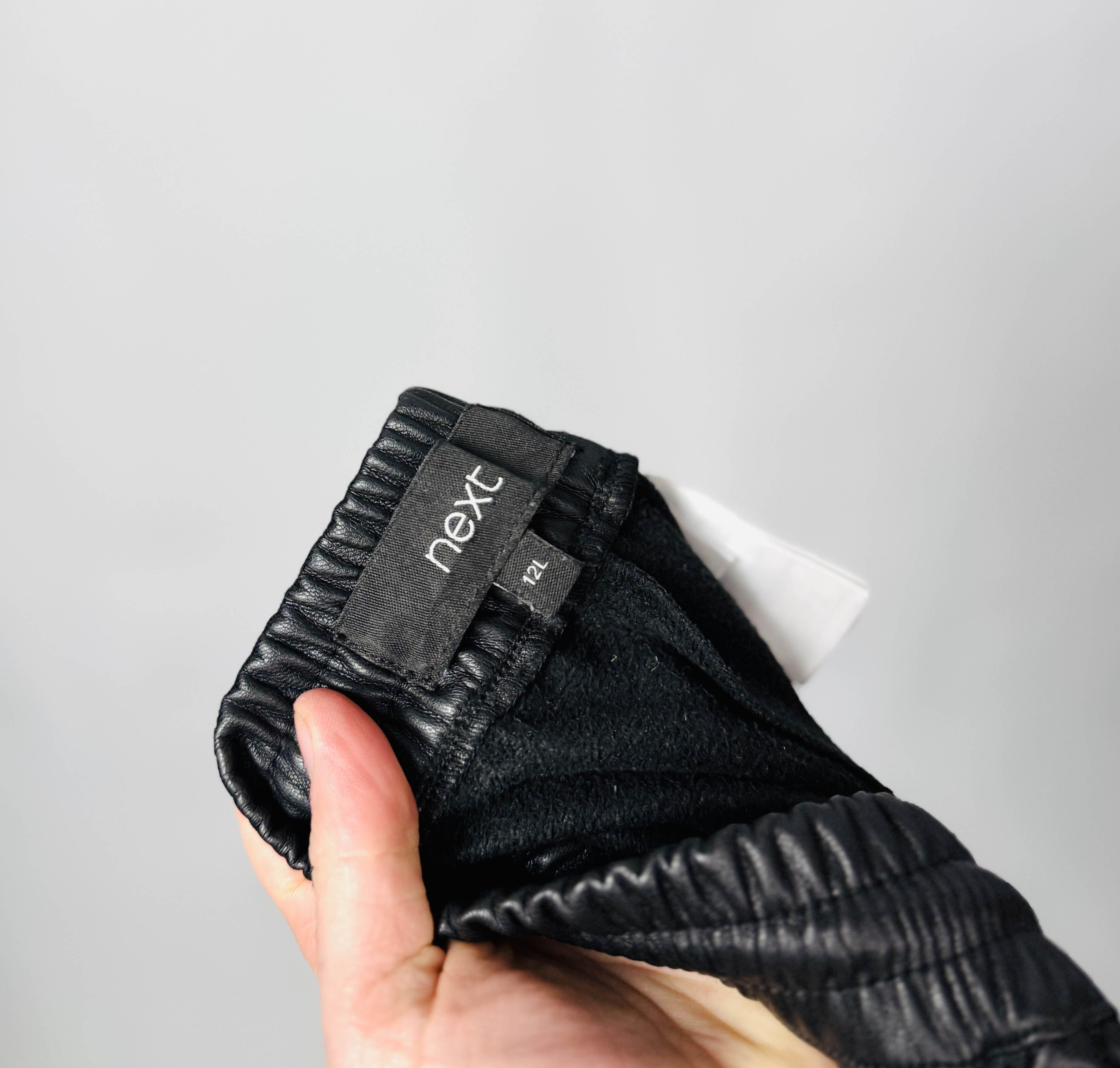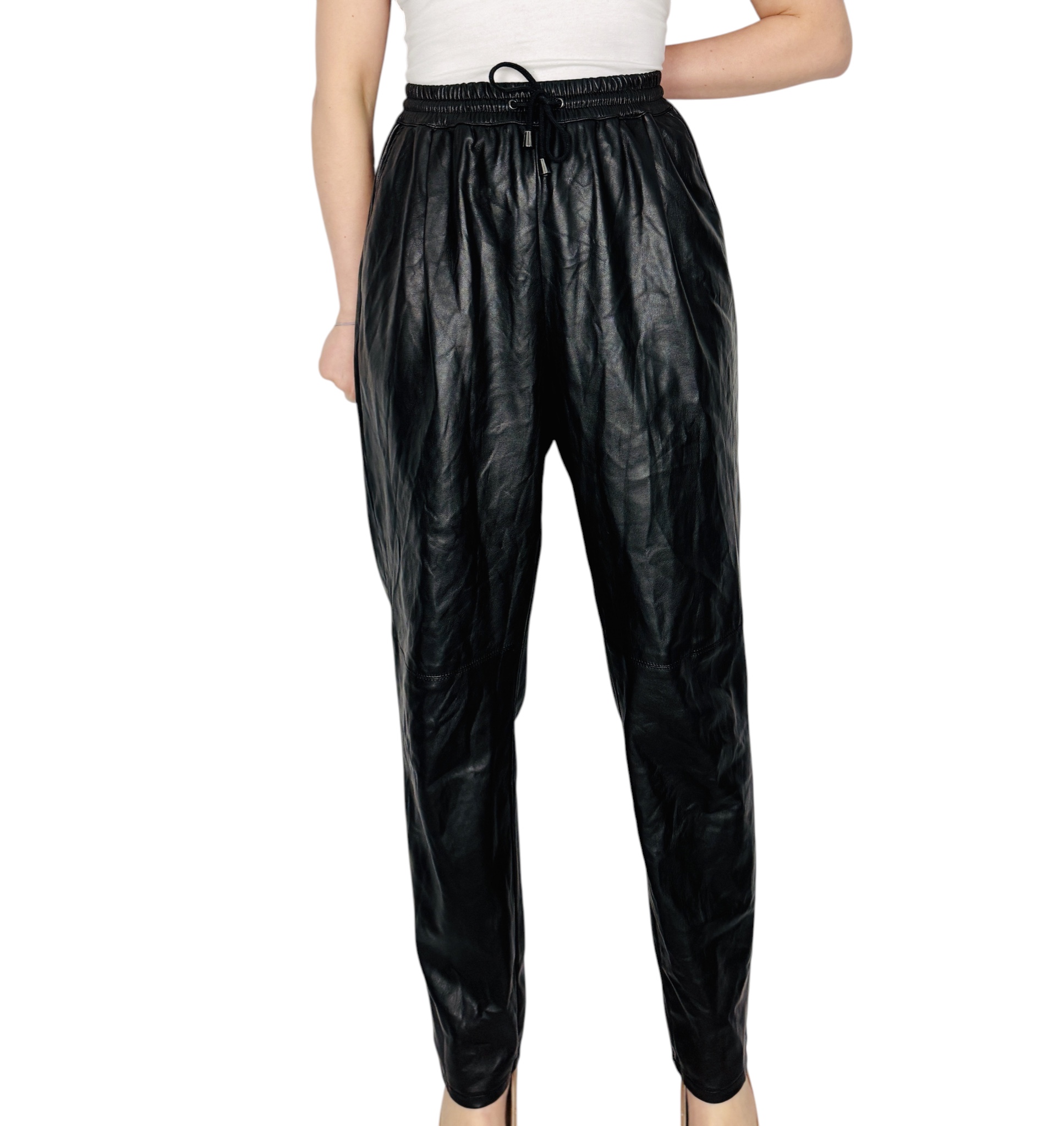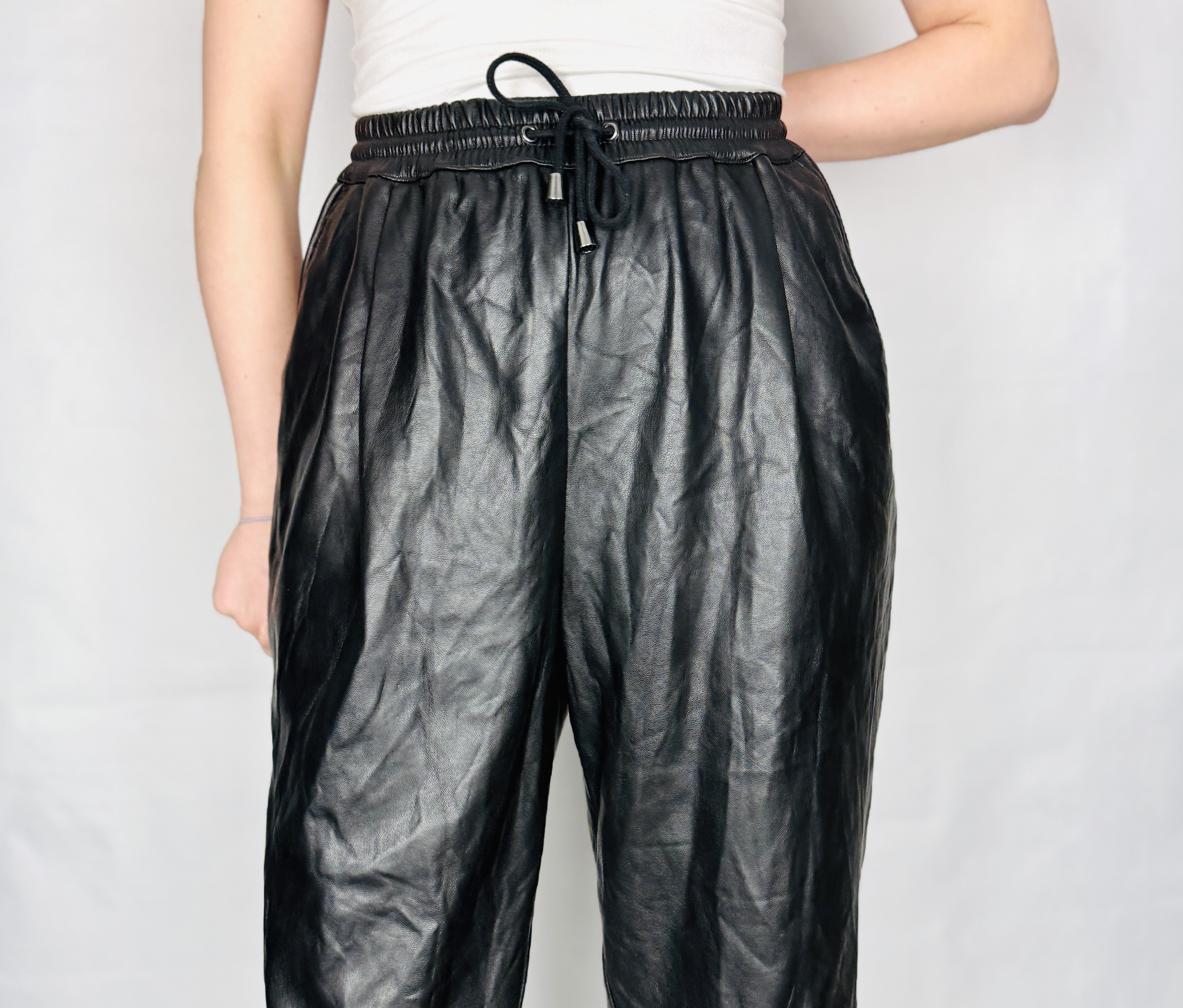 Te spodnie mają w sobie od razu wyczuwalny, miejski szyk — głęboka czerń i miękkie, skórzane wykończenie tworzą elegancki, a jednocześnie swobodny charakter. Całość posiada lekko dziewczęcy akcent dzięki drobnym marszczeniom przy pasie, które nadają formie subtelnej lekkości; to model, który łączy komfort z modowym wyrazem, idealny dla kobiety chcącej postawić na efektowny, lecz nienachalny look.
