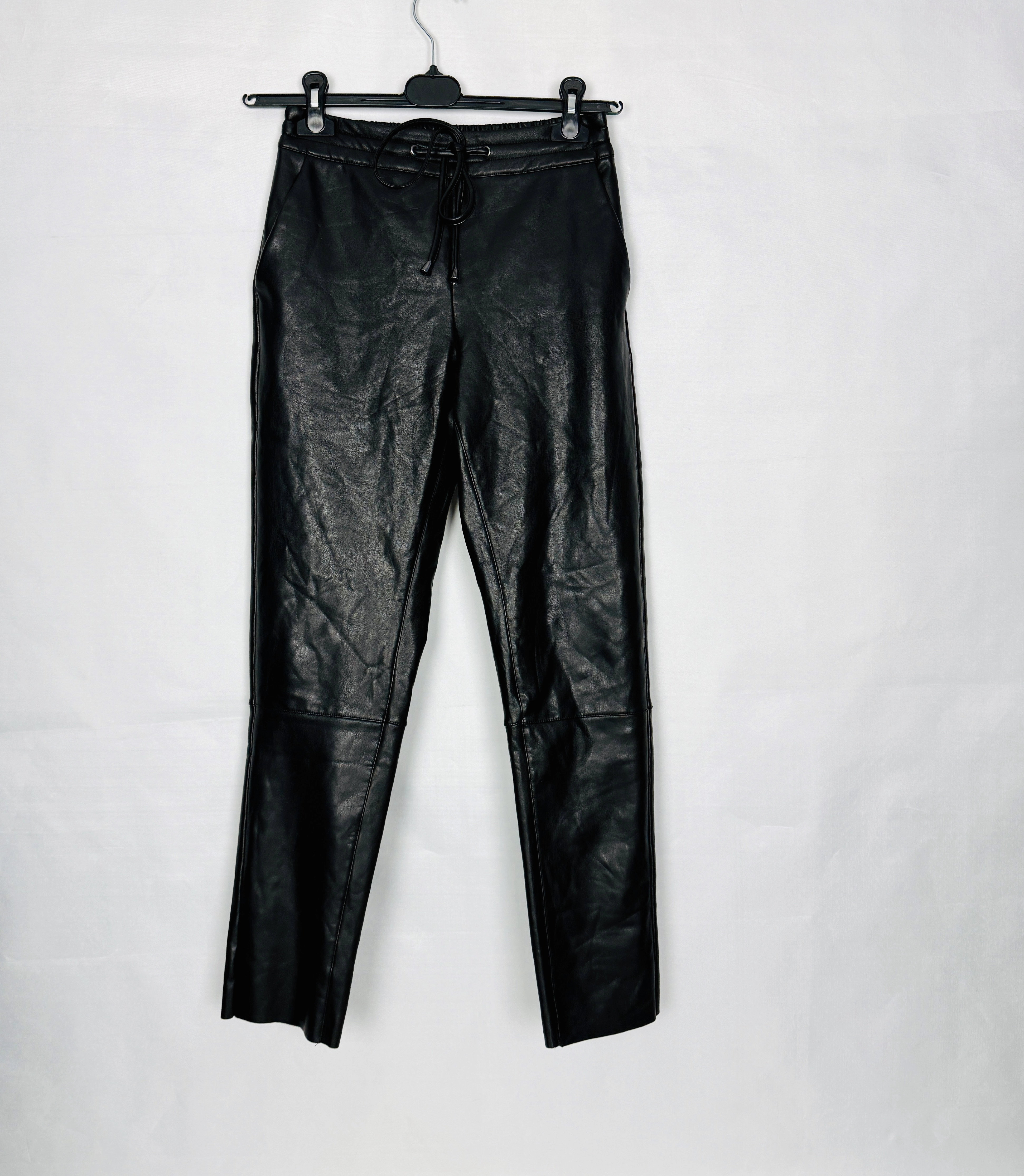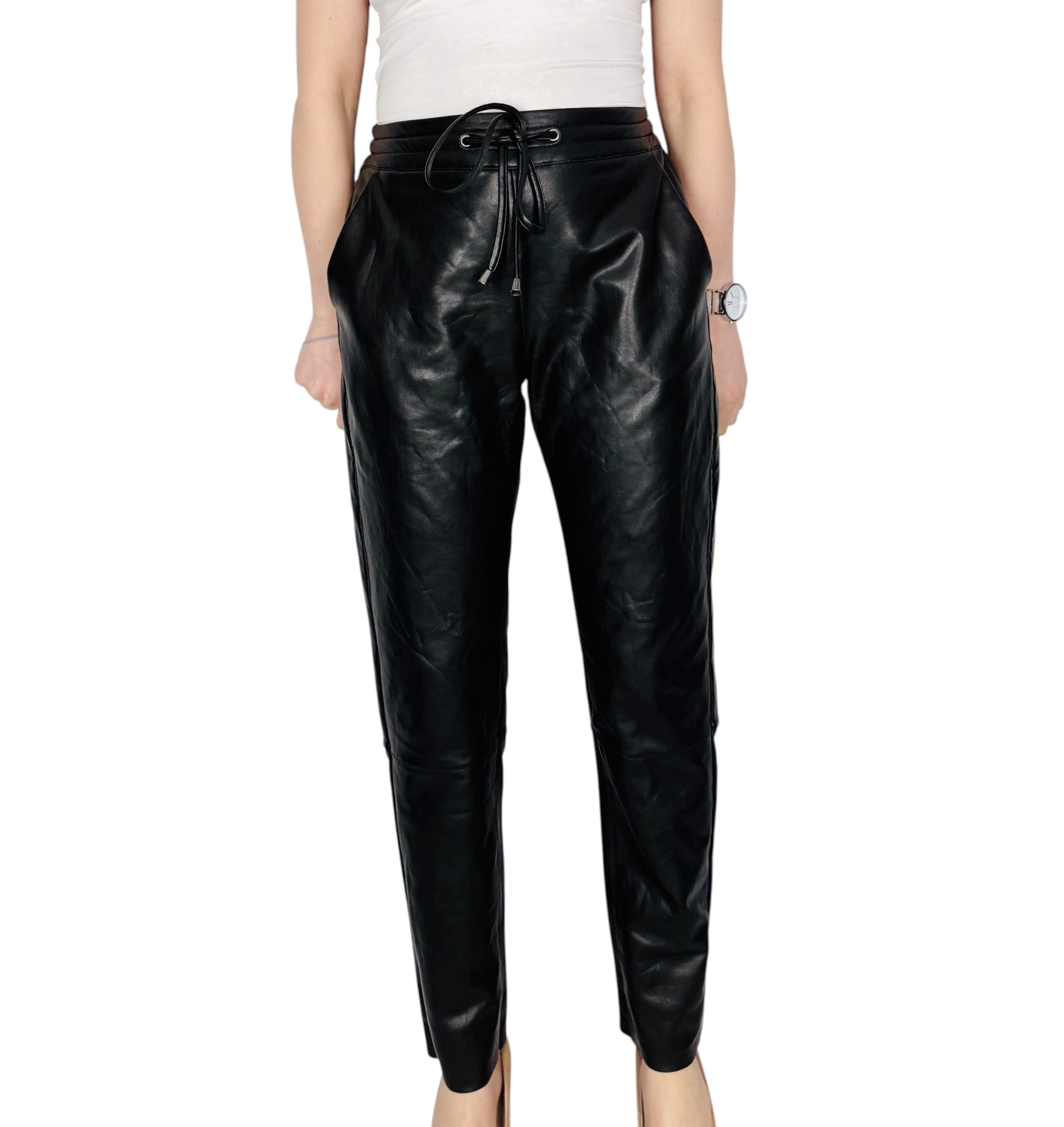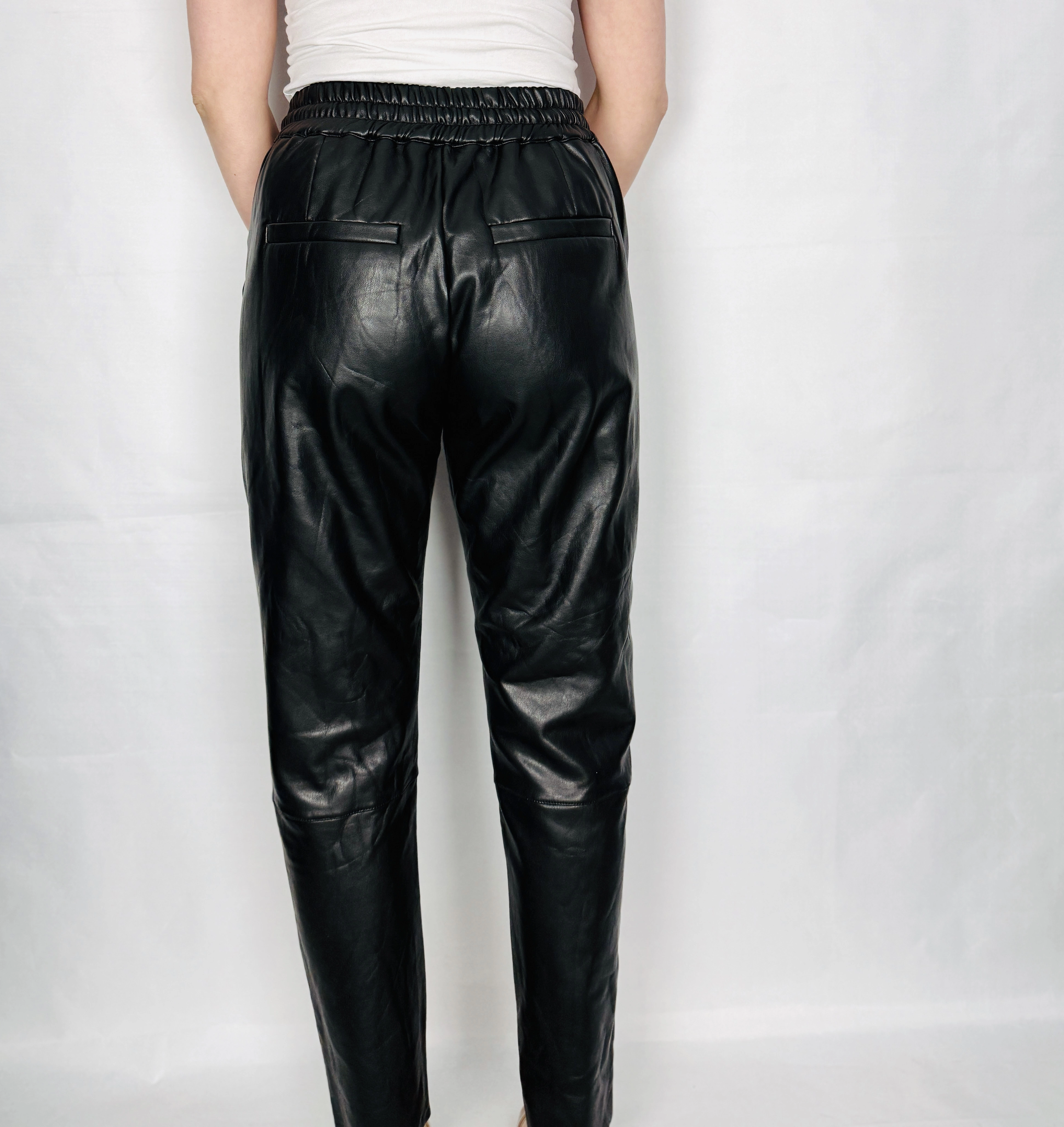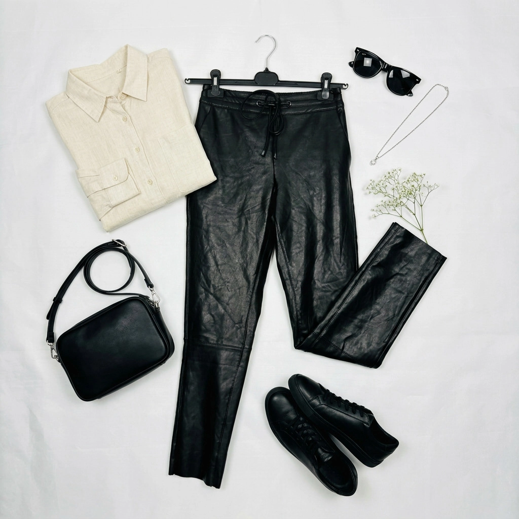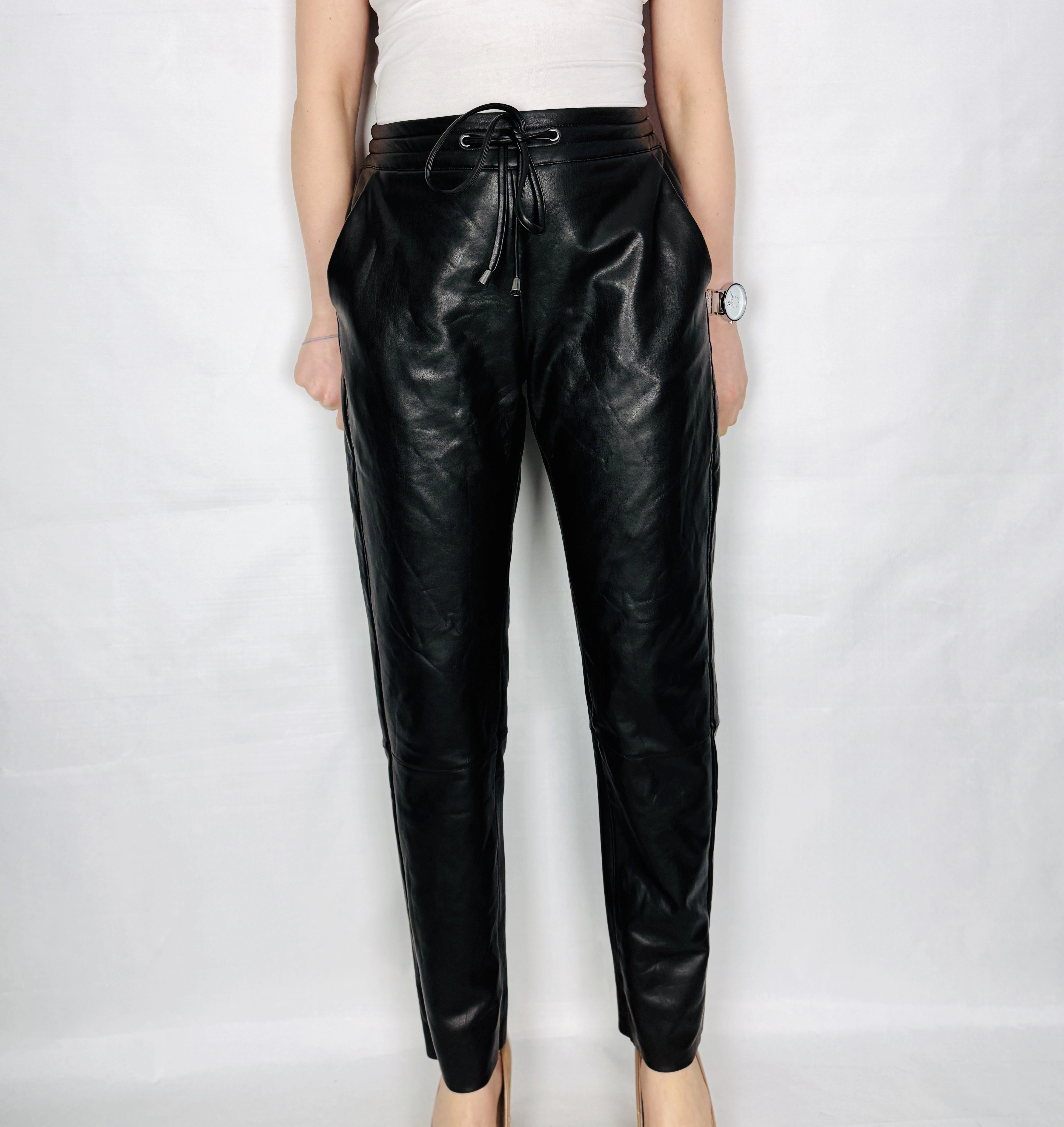 Materiał prezentuje się jako skórzany, gładki z dyskretnym połyskiem; powierzchnia jest miękko układająca się, momentami delikatnie pomarszczona, co dodaje całości autentycznego, lekko nonszalanckiego charakteru. Taka faktura sprawia, że spodnie trzymają formę w partii bioder, a jednocześnie poruszają się z ciałem, co przekłada się na wygodę noszenia. Kontrast pomiędzy gładkim frontem a miękkimi załamaniami przy zgięciach podkreśla naturalny, kobiecy rytm stroju.