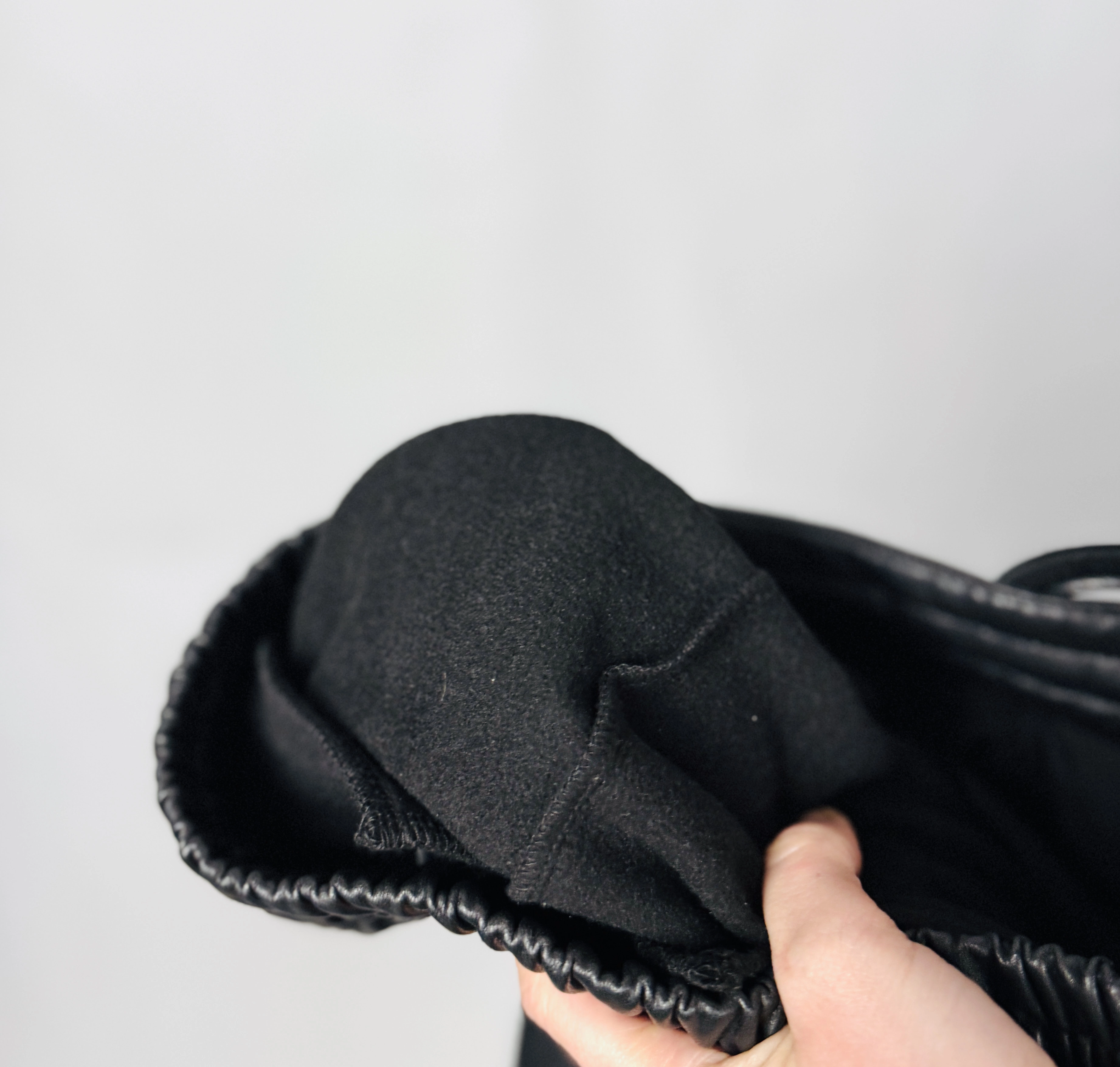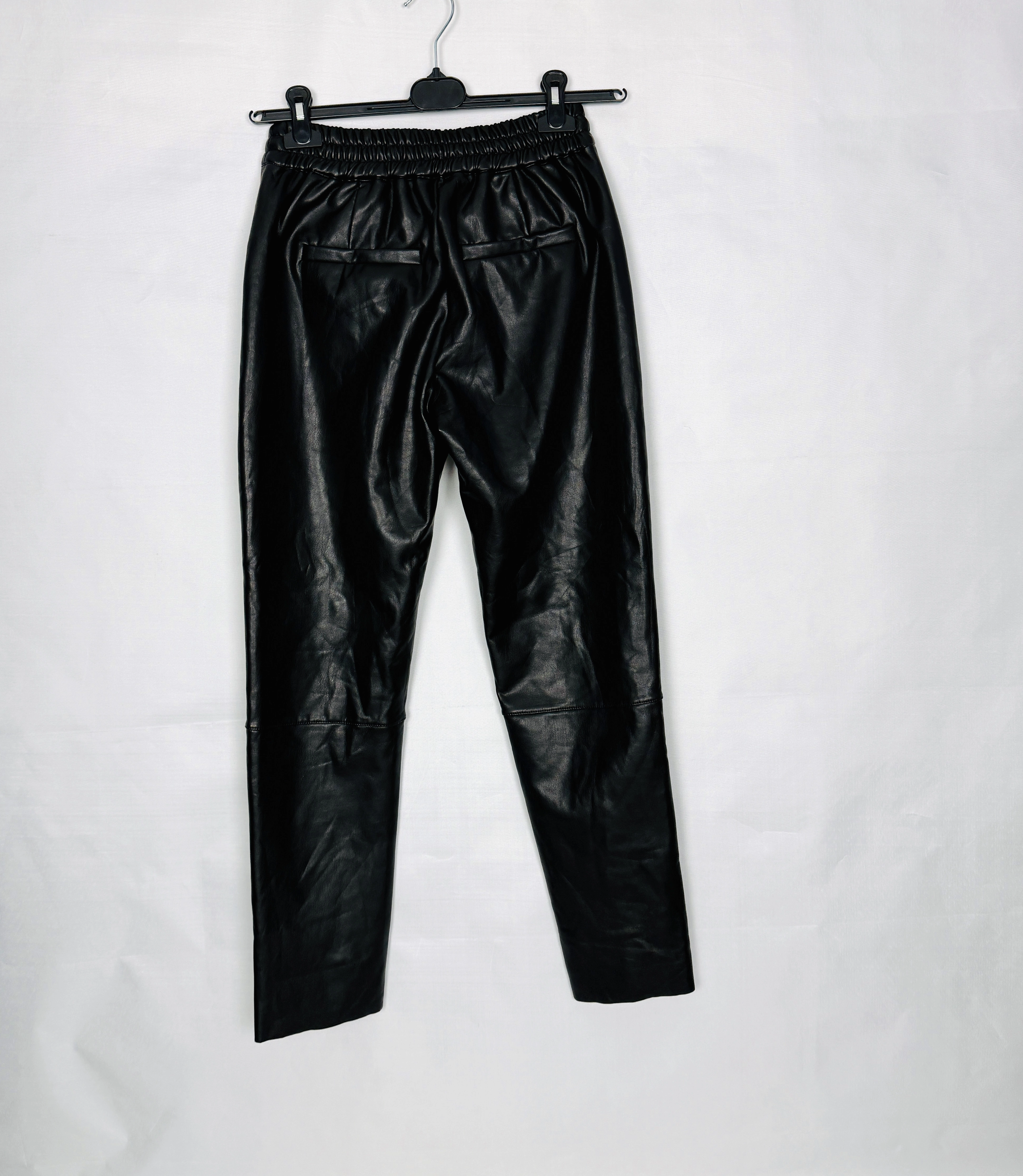 Te spodnie mają w sobie natychmiastowy, kobiecy magnetyzm — głęboka czerń i gładkie, lekko połyskujące wykończenie nadają im wyrafinowanego, nieco drapieżnego charakteru, a jednocześnie całość zachowuje uporządkowaną, elegancką linię. Projekt emanuje miejską pewnością siebie: jest prosty, ale efektowny, idealny dla osoby, która chce podkreślić sylwetkę przy zachowaniu komfortu i swobody ruchu. To model, który potrafi dodać szyku zarazem codziennej, jak i wieczorowej stylizacji.