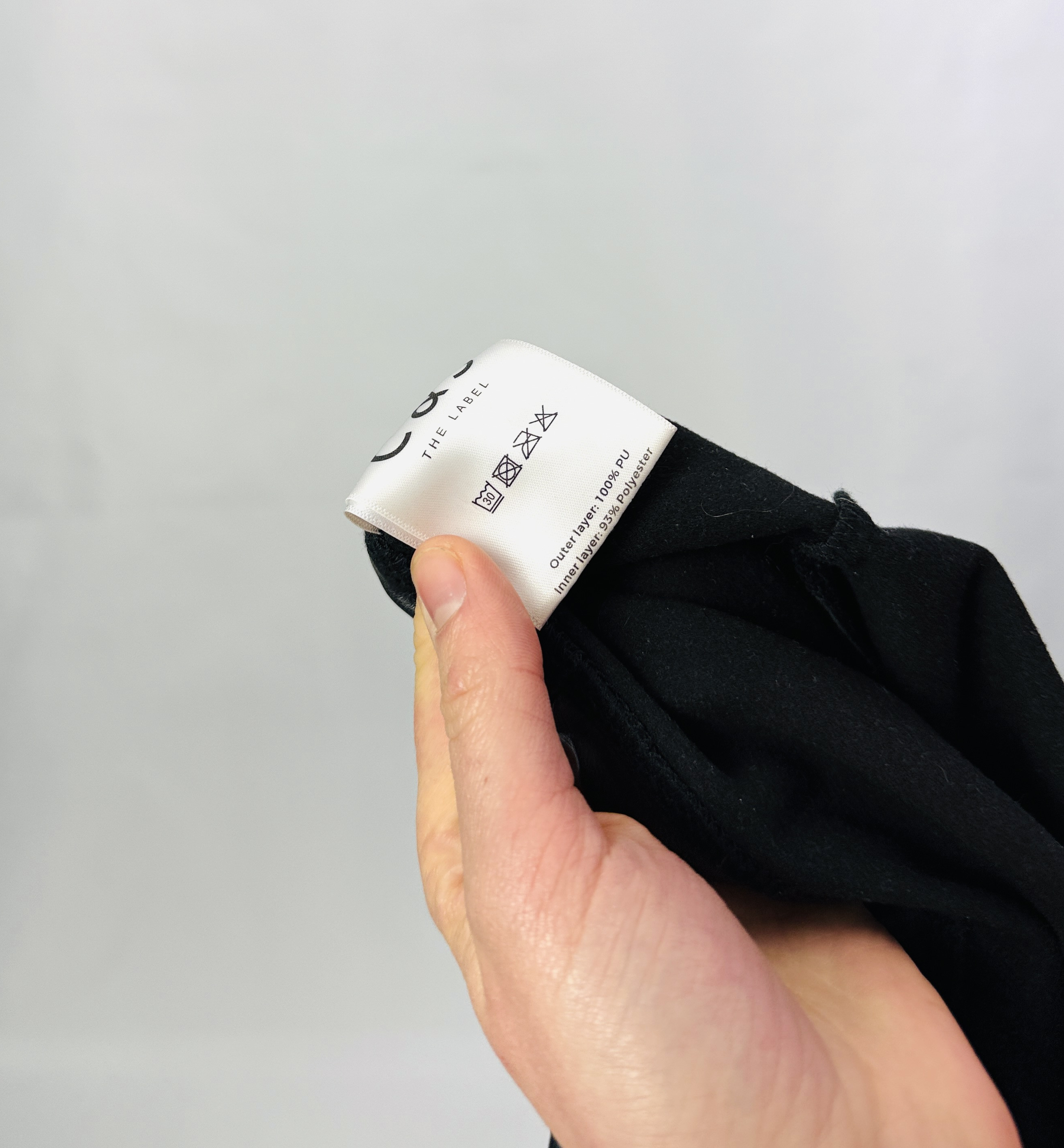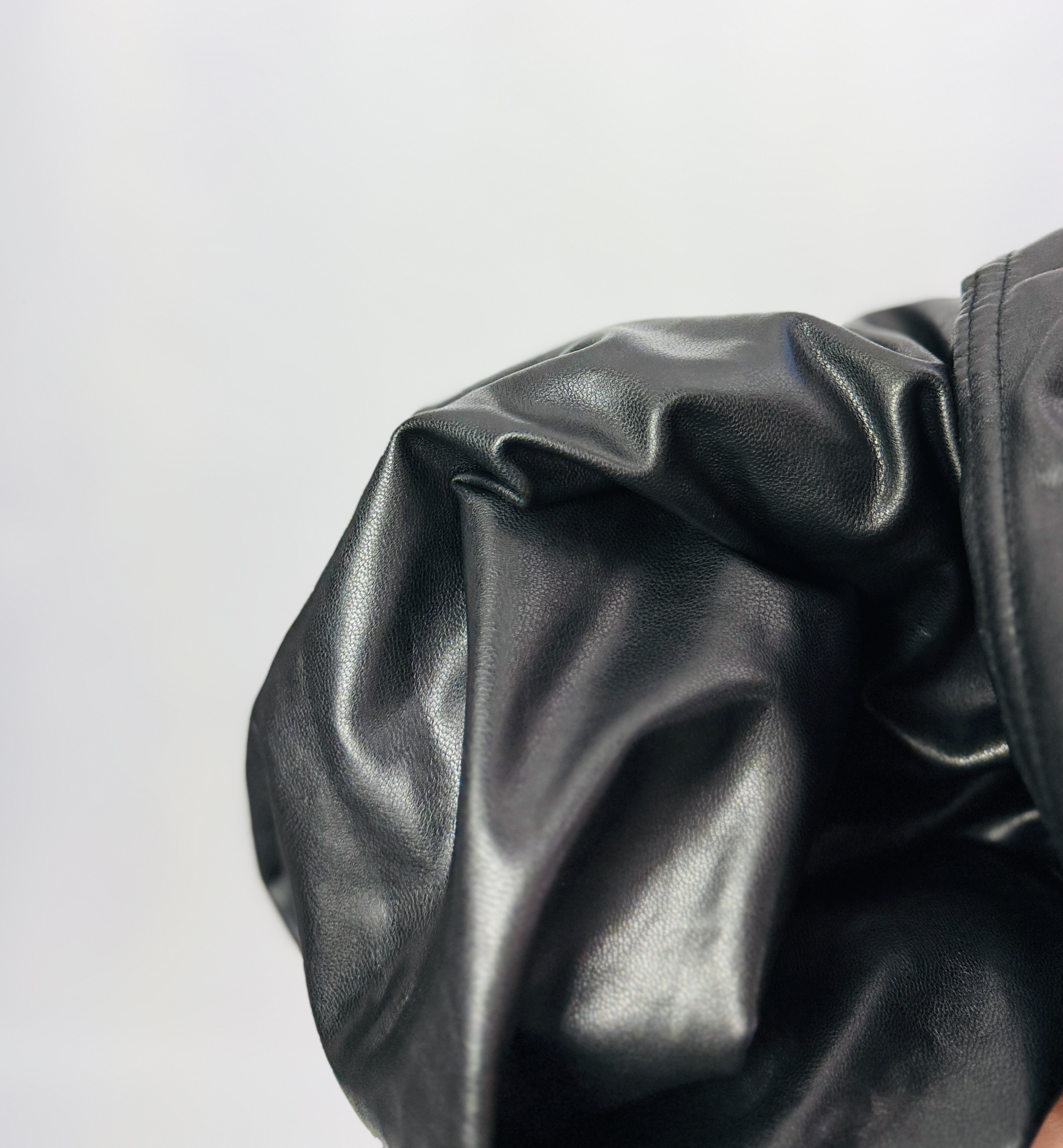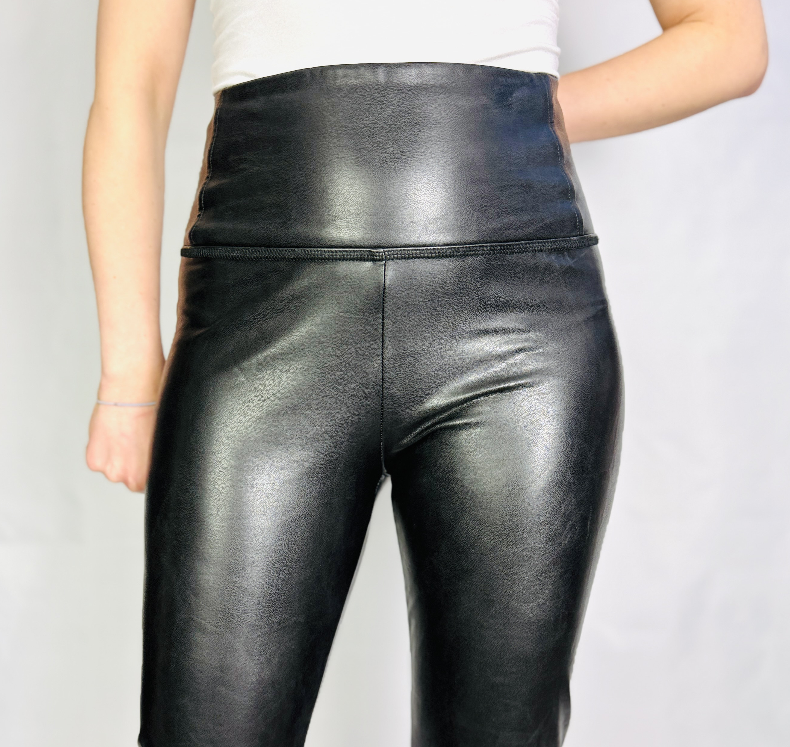Materiał prezentuje się jako gładszy, delikatnie połyskujący, o eleganckim, skórzanym efekcie — trzyma formę i lekko modeluje sylwetkę, jednocześnie nie tworząc nadmiernie sztywnej bryły. Taka faktura optycznie wysmukla nogi i ładnie podkreśla linię bioder, nadając sylwetce bardziej rzeźbiony wyraz; wysoki stan dodatkowo modeluje talię, co wpływa na harmonijne proporcje sylwetki. Spodnie dopasowują się do kształtów, akcentując naturalne łuki ciała i subtelnie podkreślając kobiece kontury.