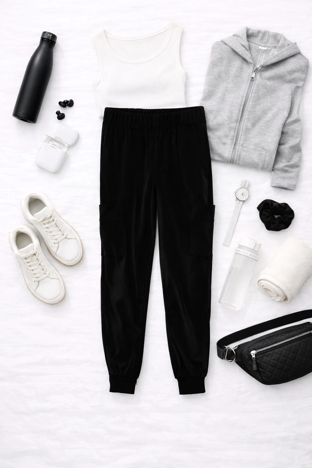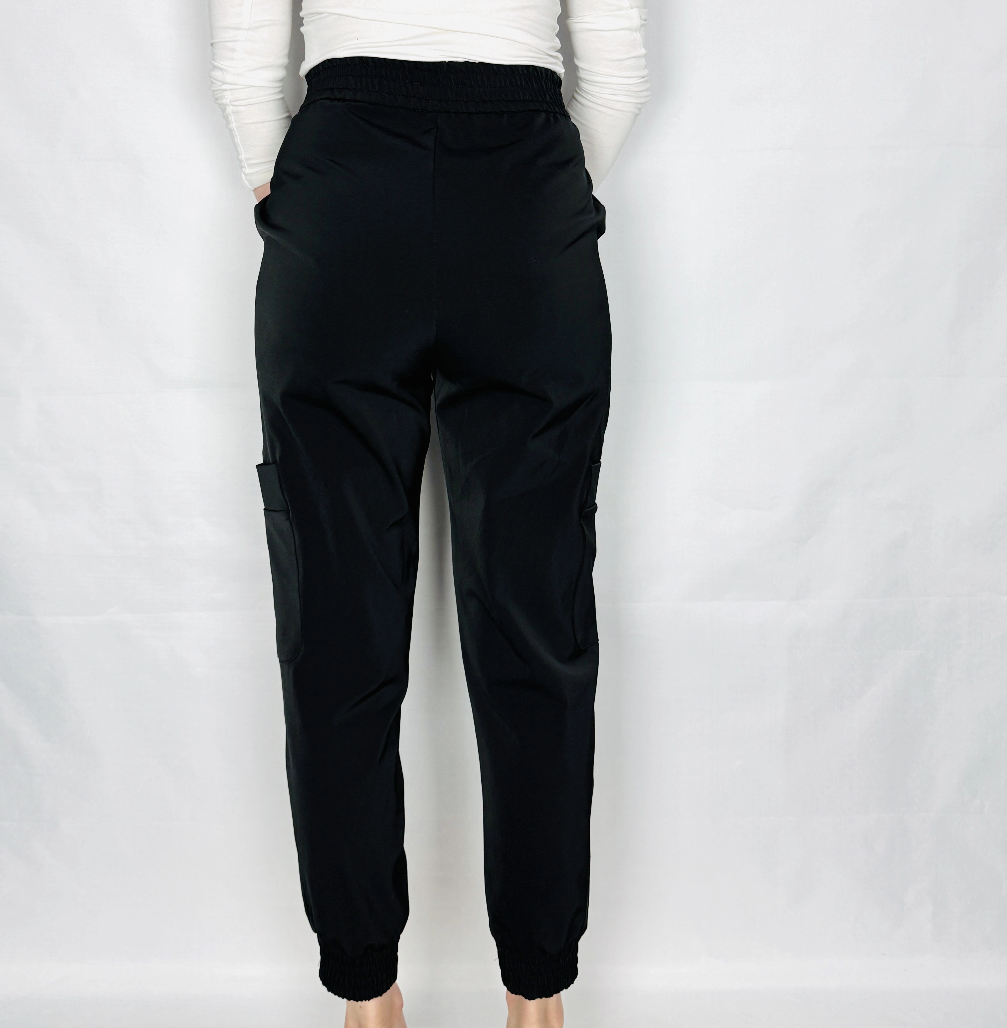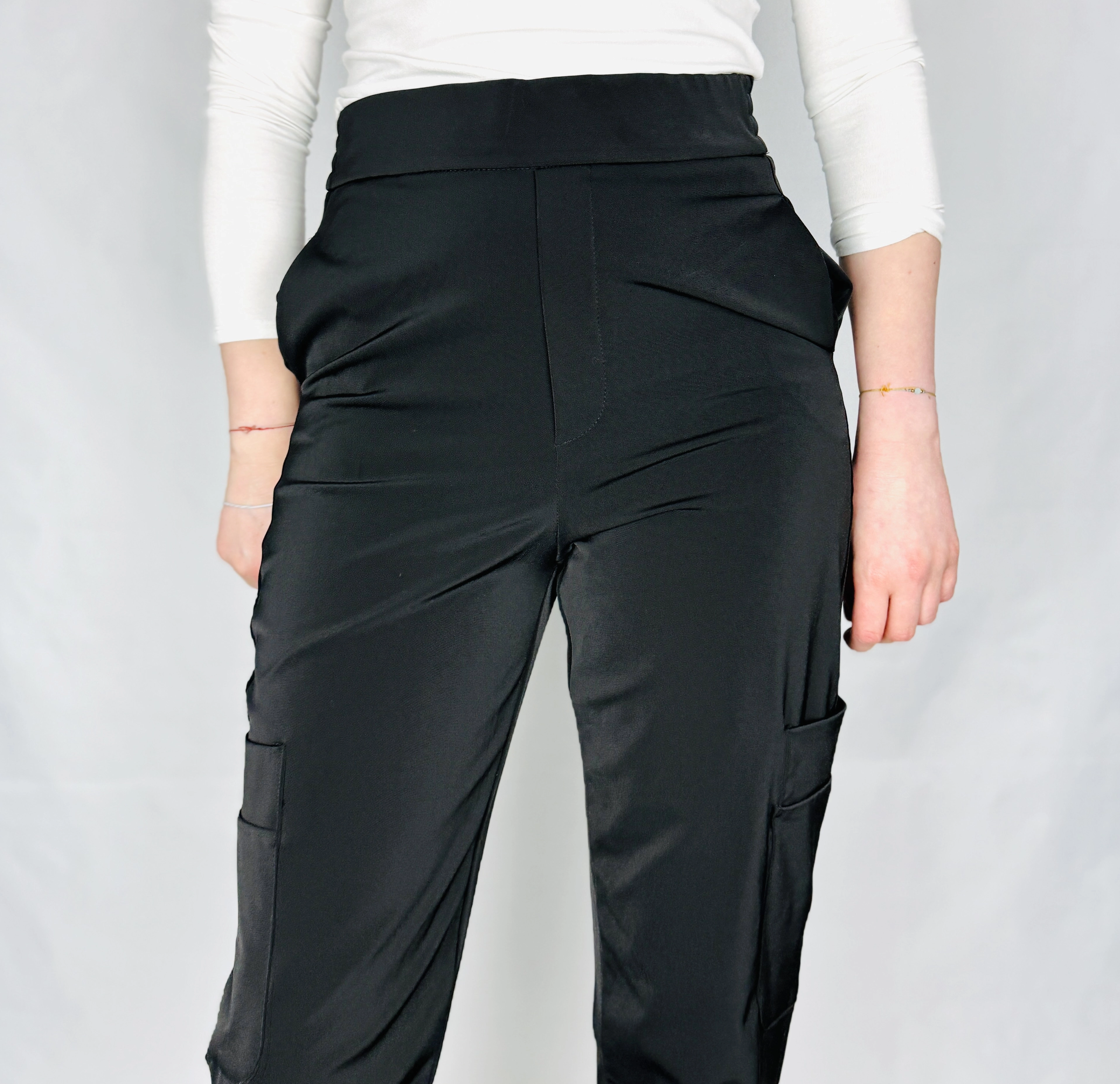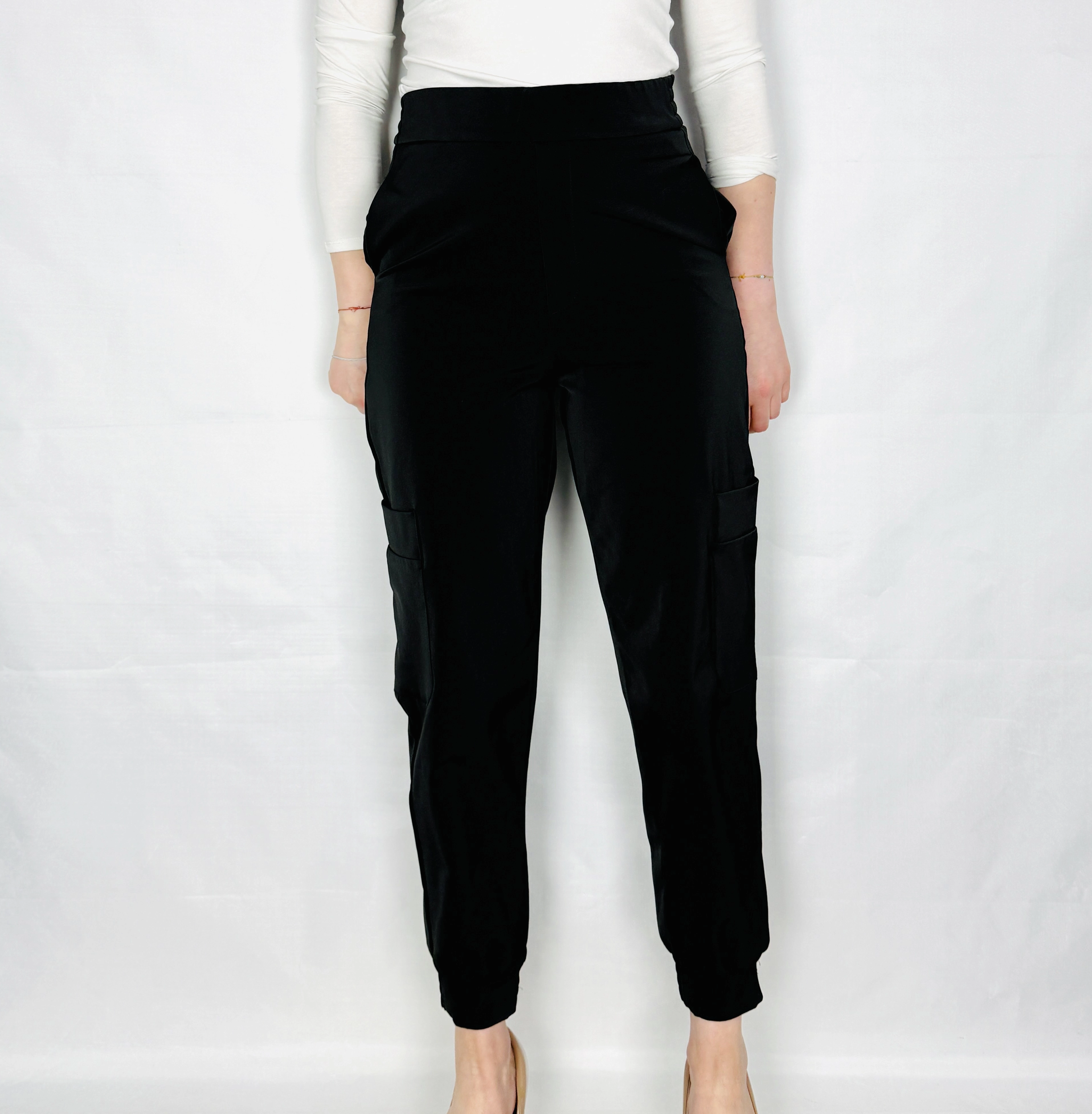Fason oparty jest na wysokim stanie, który pięknie podkreśla talię i nadaje sylwetce proporcji. Górna część jest gładka i dobrze dopasowana, co tworzy estetyczną, uporządkowaną linię. Nogawki mają luźniejszy krój, który lekko zwęża się ku dołowi, zakończony ściągaczami przy kostkach. Dzięki temu spodnie zyskują sportowy, dynamiczny charakter, jednocześnie zachowując kobiecą lekkość. Po bokach widoczne są naszywane kieszenie cargo, które dodają całości charakterystycznego, użytkowego stylu i przełamują klasyczną formę.