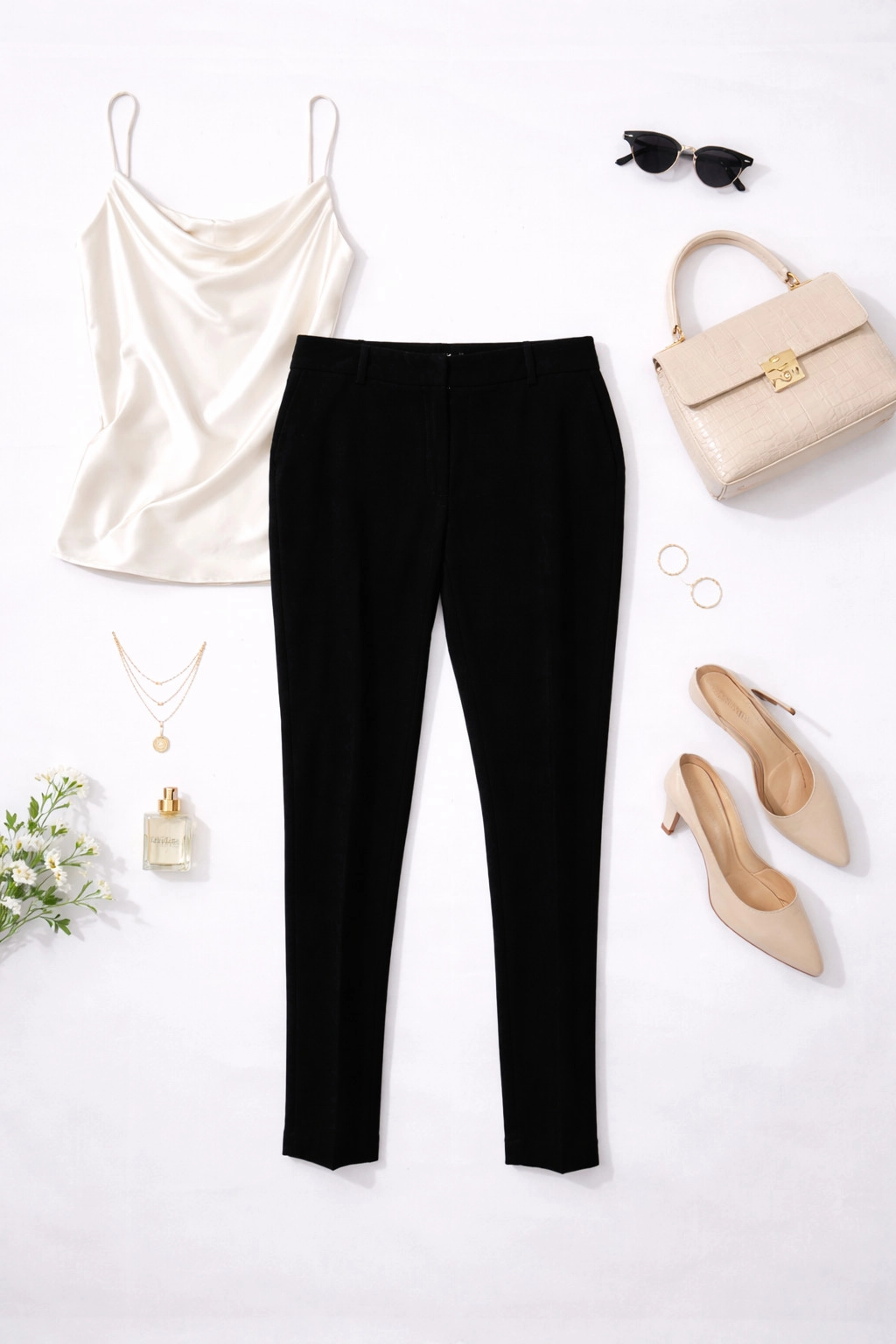 Fason o dopasowanej linii subtelnie podkreśla sylwetkę, modelując ją i nadając jej smukłego wyglądu. Wysoki stan akcentuje talię, dzięki czemu proporcje ciała są bardziej harmonijne, a nogi wydają się optycznie dłuższe. Nogawki są wąskie i stopniowo zwężają się ku dołowi, tworząc elegancką, uporządkowaną linię.