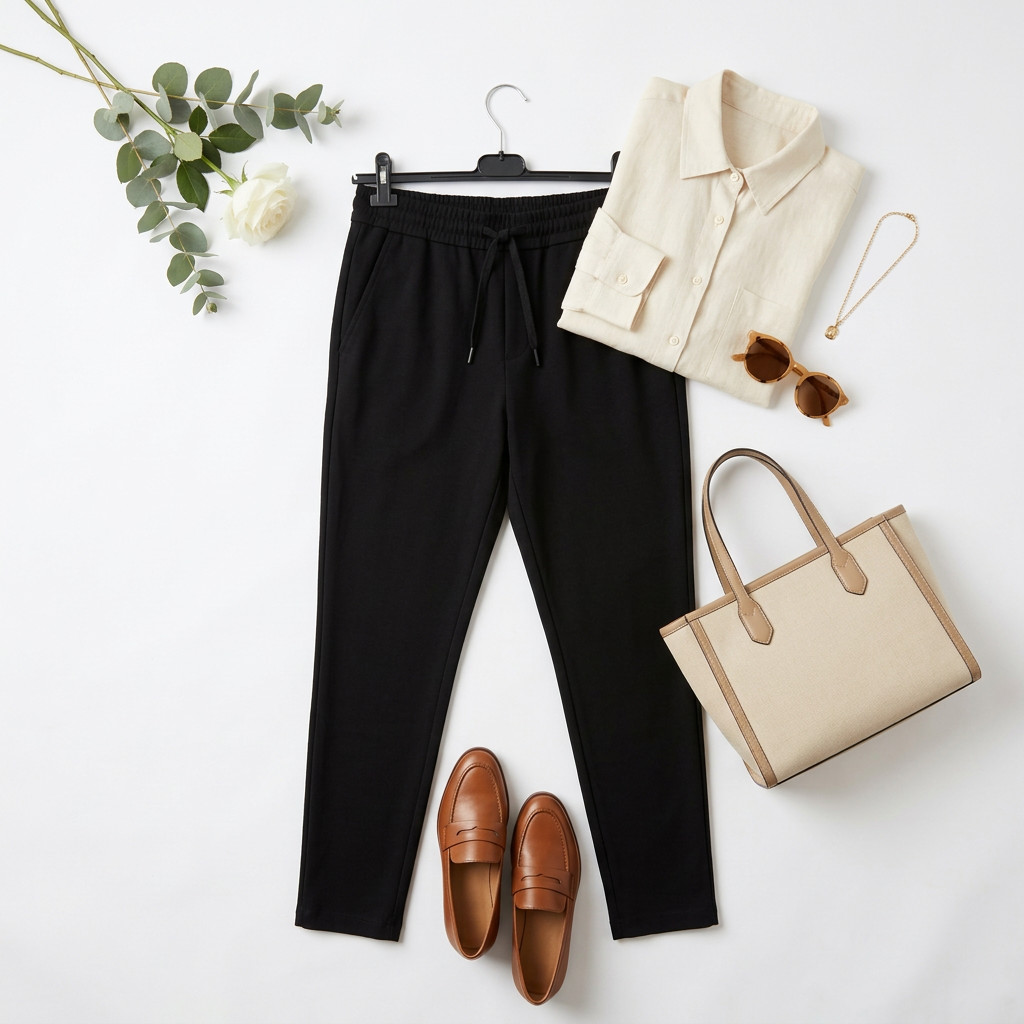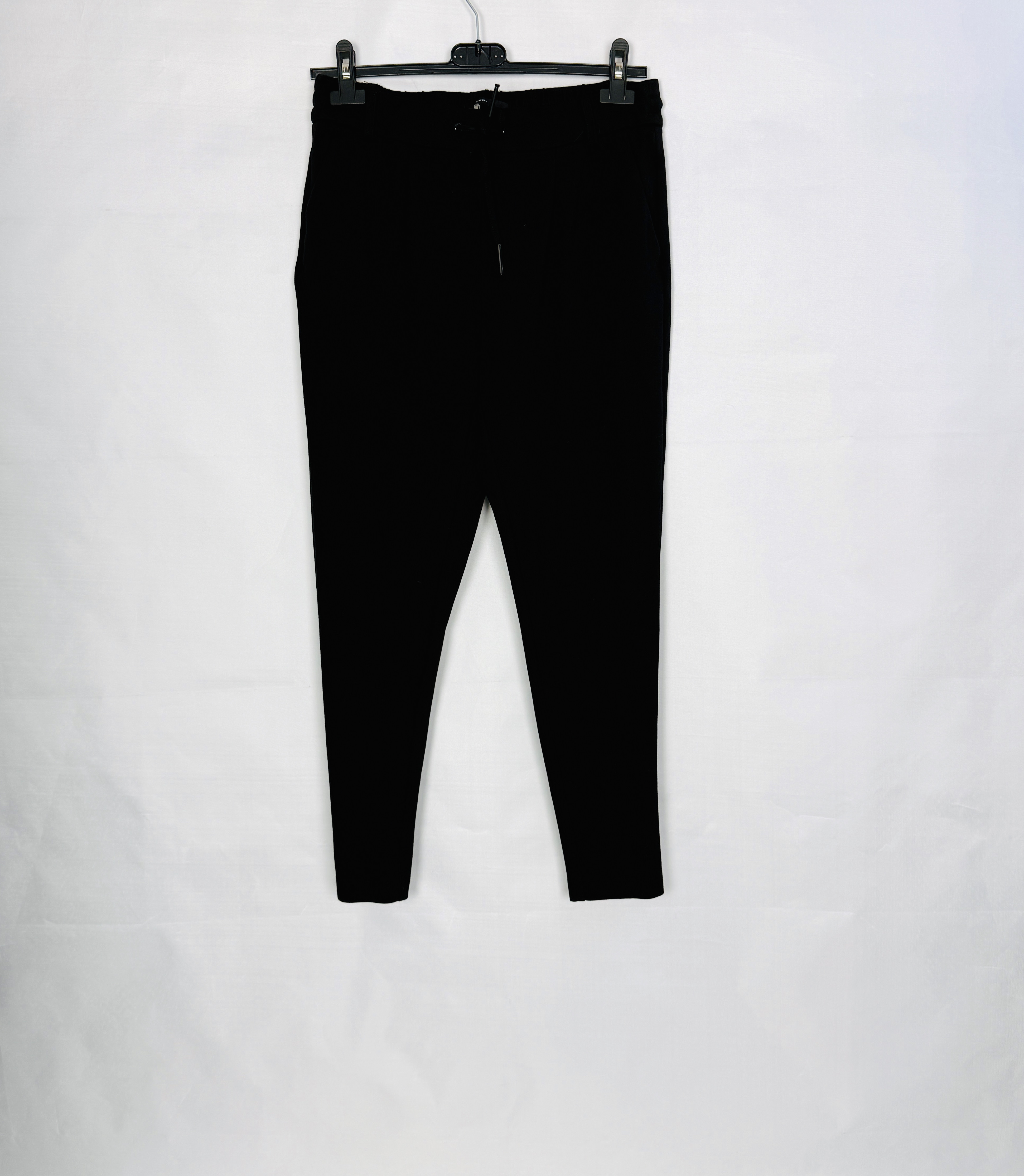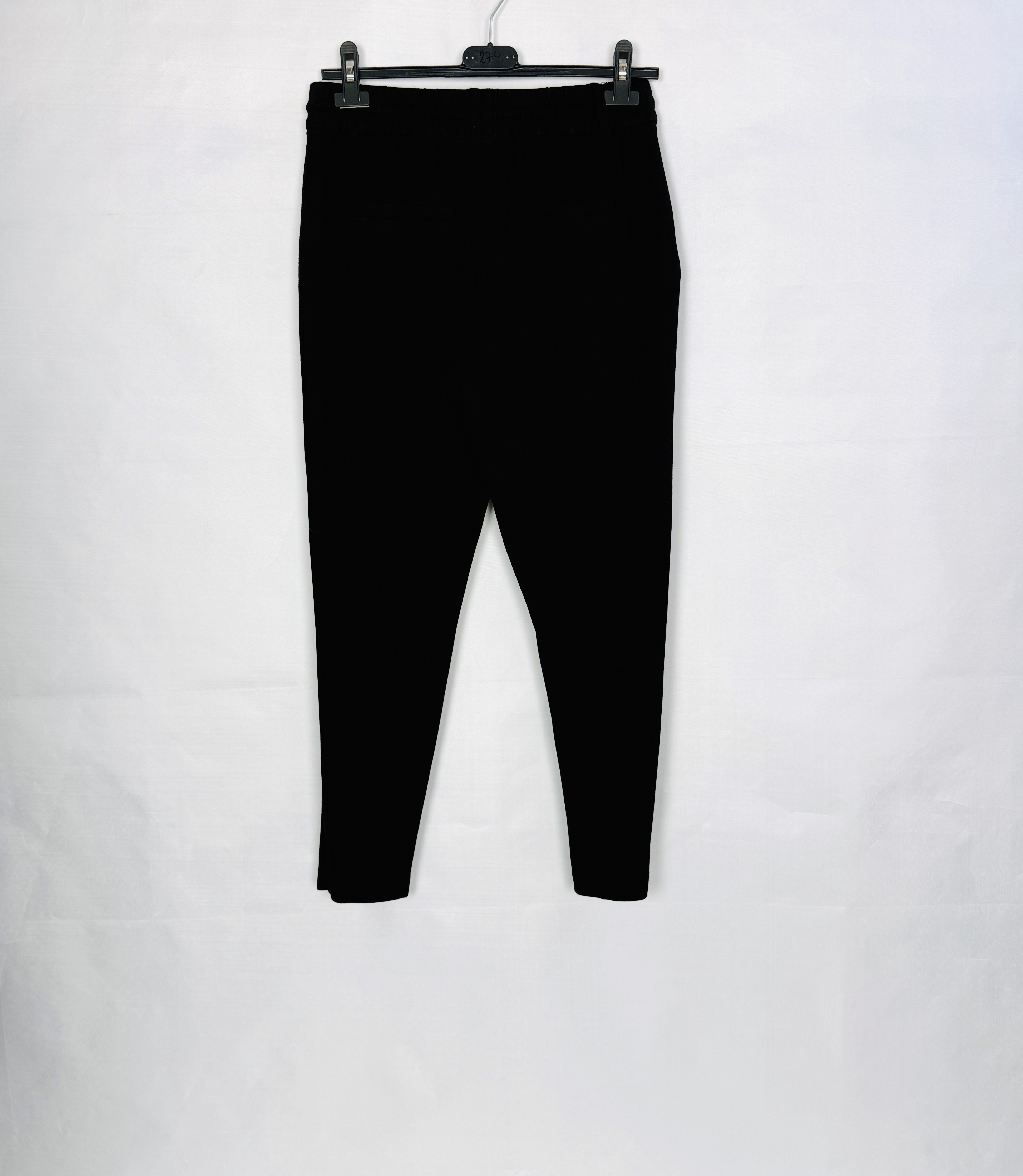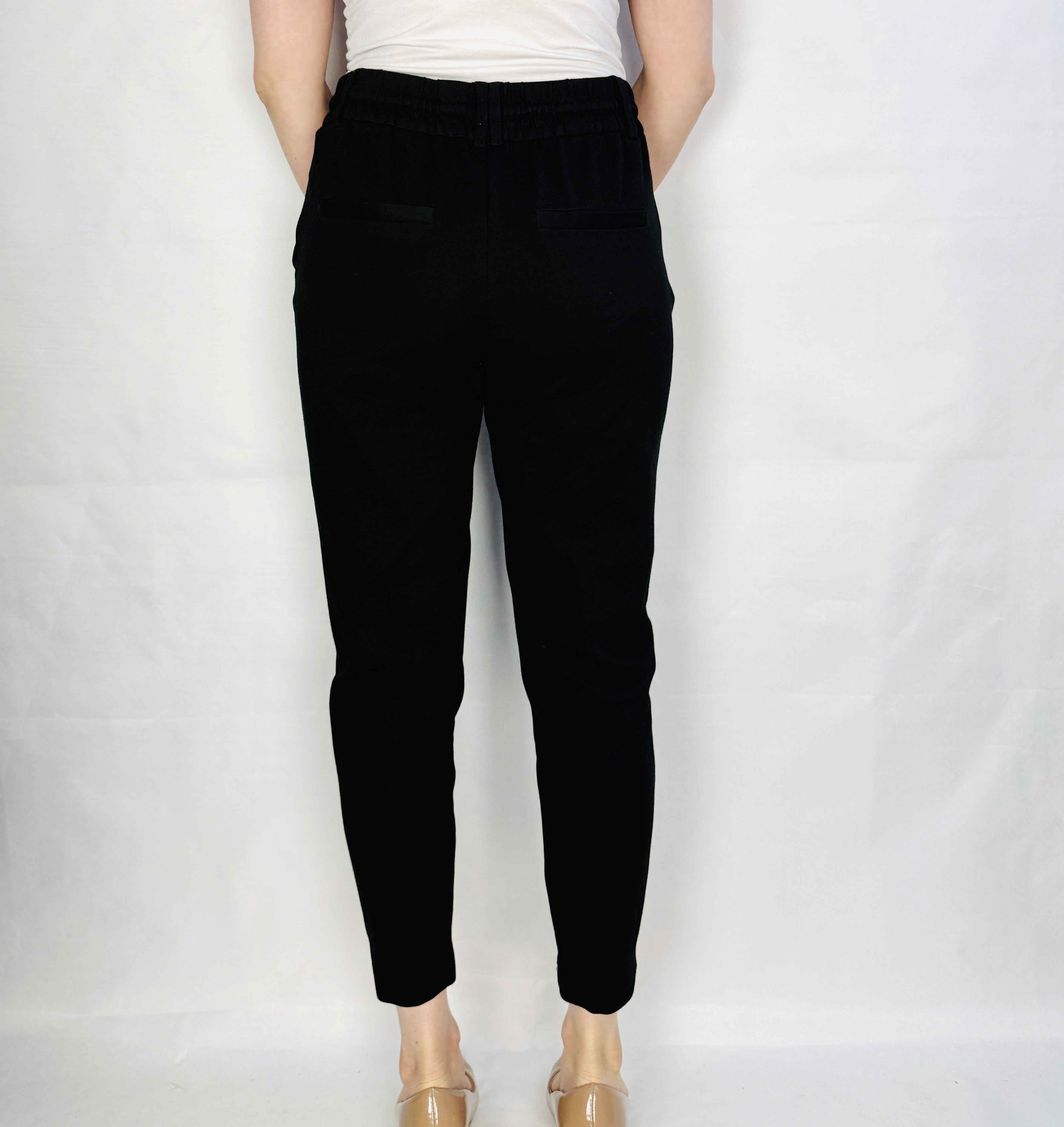 Te spodnie łączą sportowy luz z kobiecą elegancją — głęboka czerń i uporządkowana sylwetka nadają im jednocześnie wyrafinowanego i swobodnego charakteru. Fason jest stonowany, harmonijny i nowoczesny; to para, która daje uczucie dopracowania bez nadmiernej formalności, idealna dla osoby, która ceni komfort i dobrą prezencję w jednym. Troczek w talii dodaje subtelnego, casualowego akcentu, który łagodzi klasyczną linię spodni.