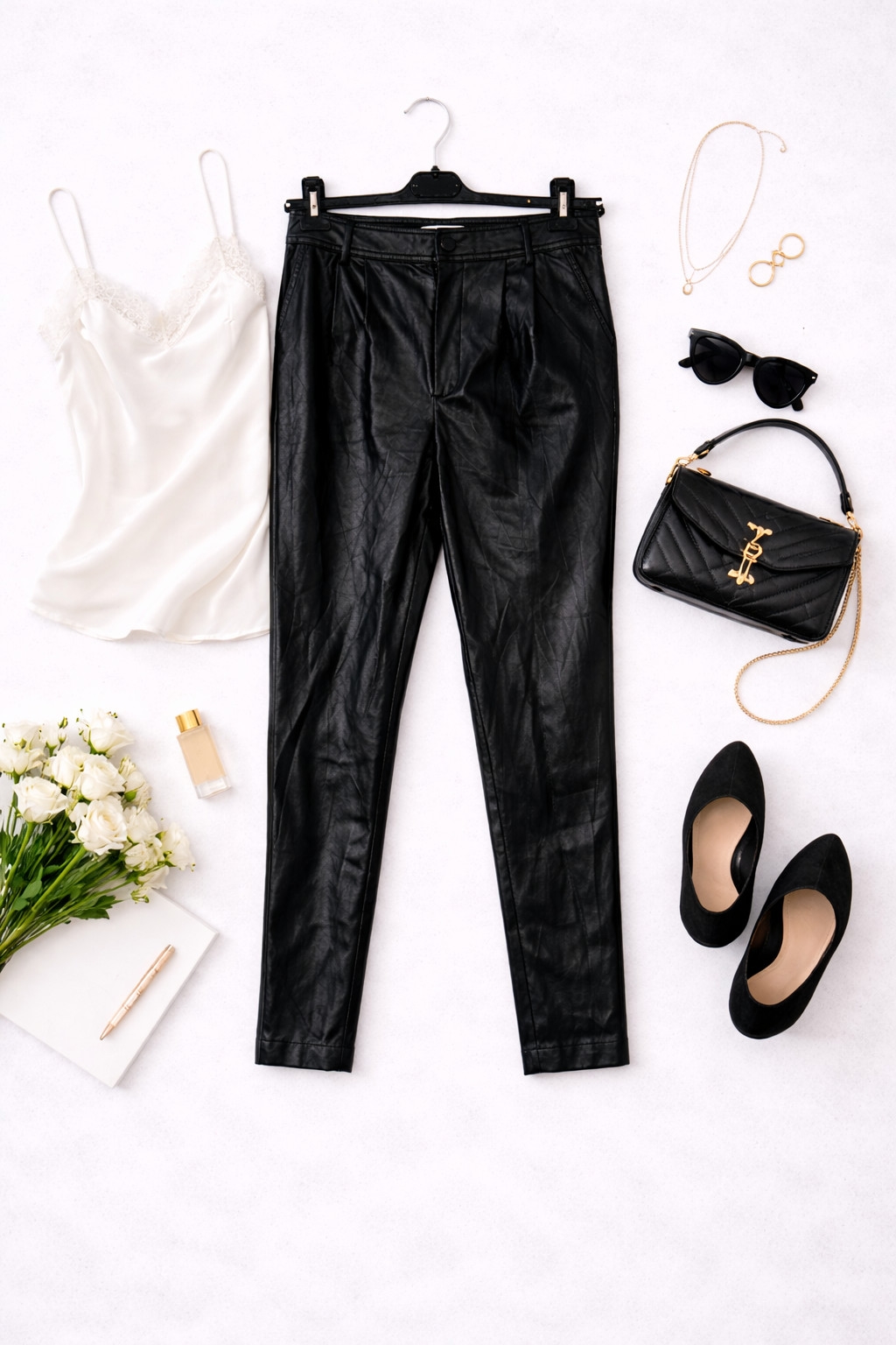 W stylizacjach spodnie oferują szerokie możliwości — w codziennym wydaniu zestaw z prostym topem i botkami na niskim obcasie dla miejskiego, ale dopracowanego looku; do pracy świetnie skomponują się z gładką koszulą lub cienkim swetrem i eleganckimi loafersami, nadając formalnemu strojowi modowego charakteru; na wieczór połącz z połyskującym topem lub dopasowaną marynarką i szpilkami dla bardziej wyrazistego efektu. Czerń harmonizuje z bielą i kremem widocznym w stylizacji, a także z akcentami w kolorze bordo, butelkowej zieleni czy metalicznymi dodatkami, co pozwala tworzyć zarówno stonowane, jak i bardziej efektowne, kobiece zestawy.