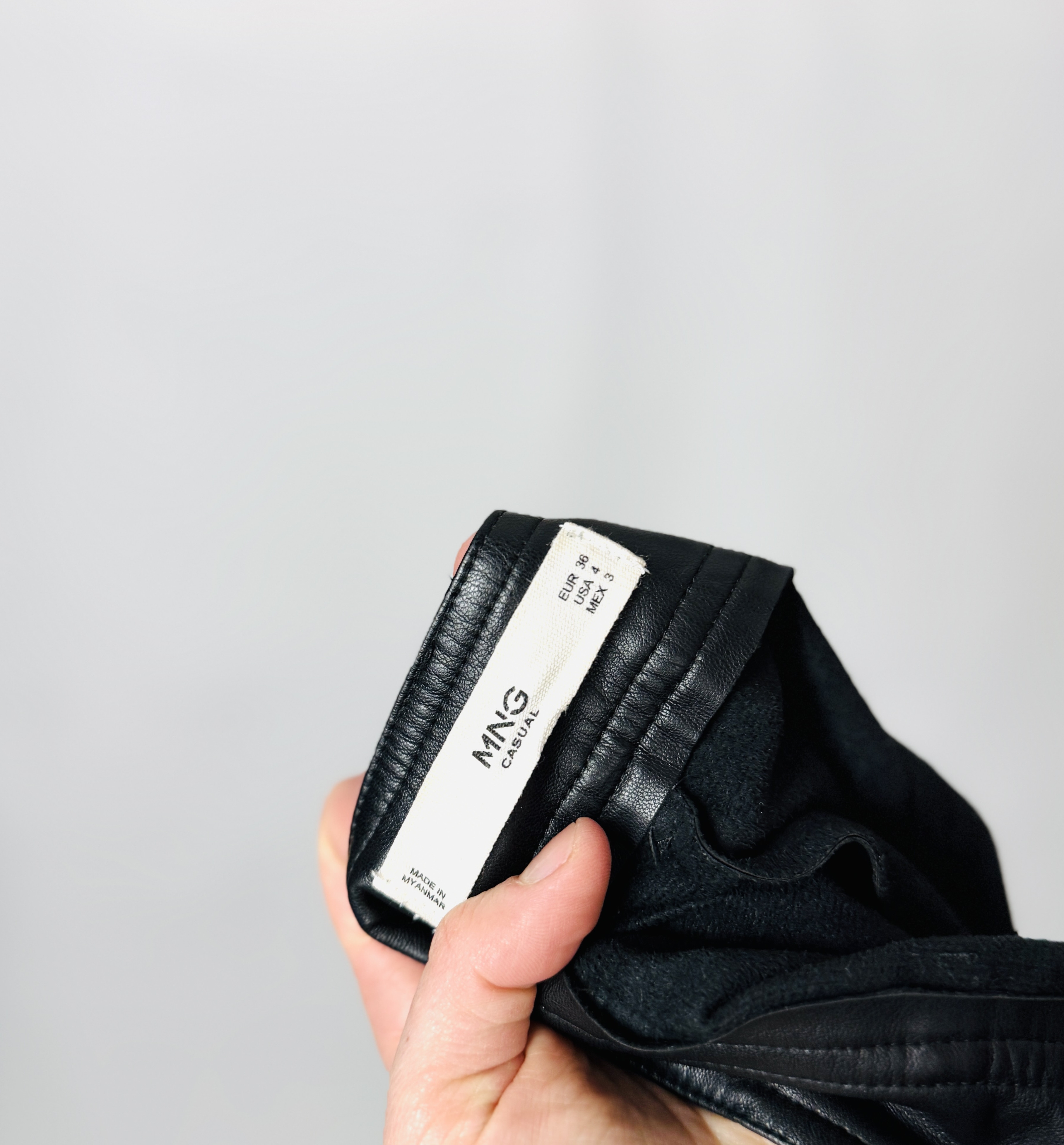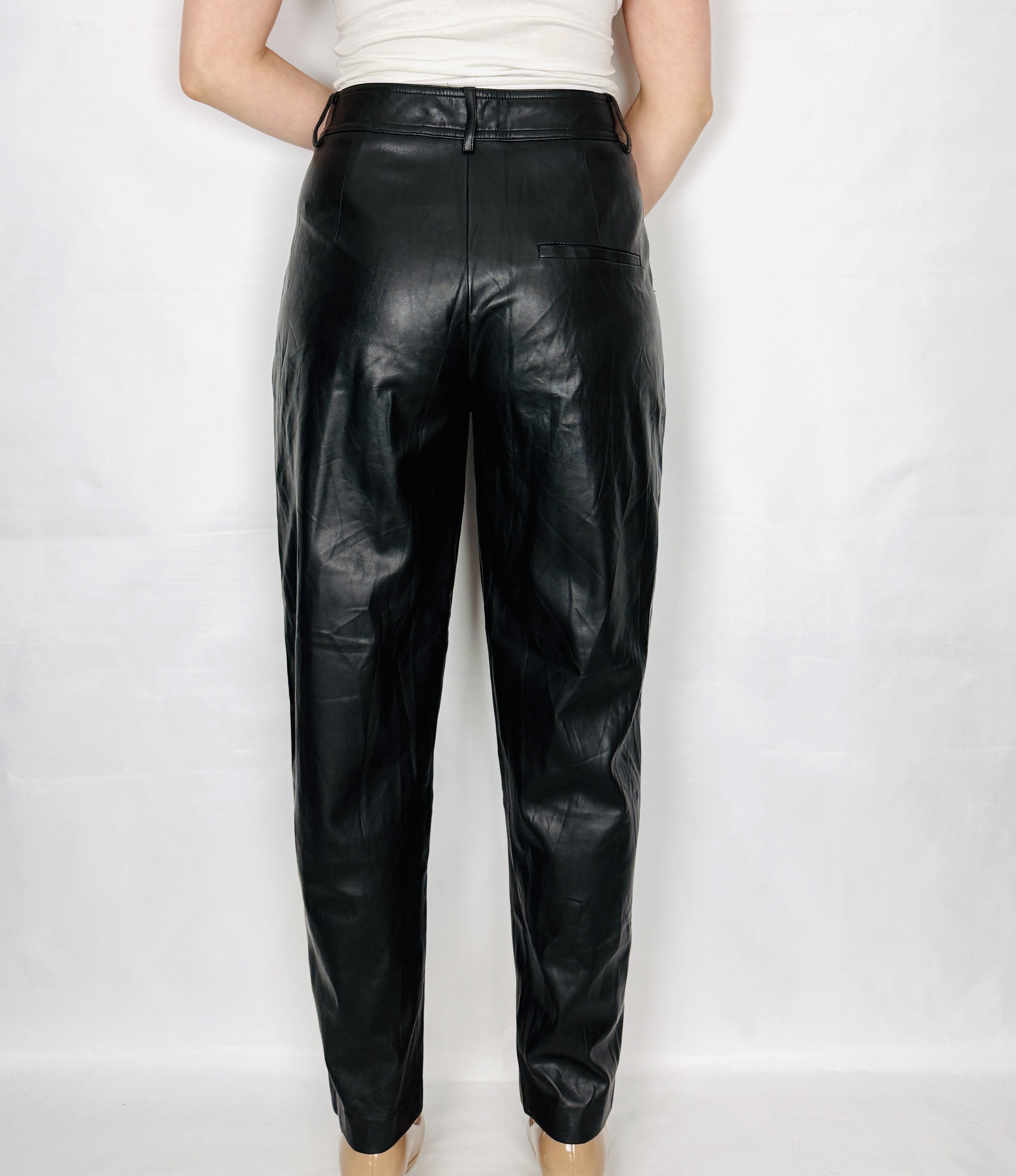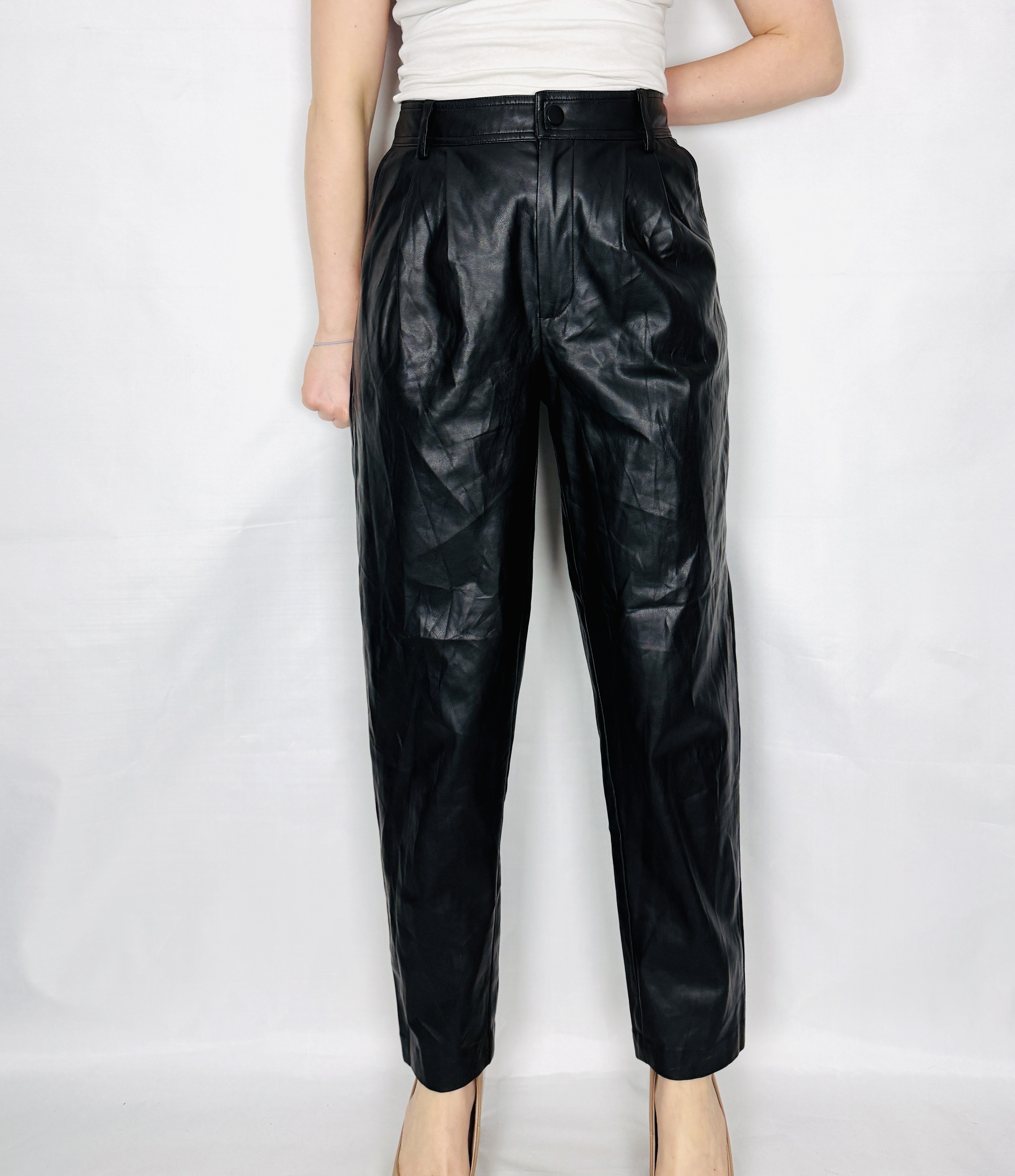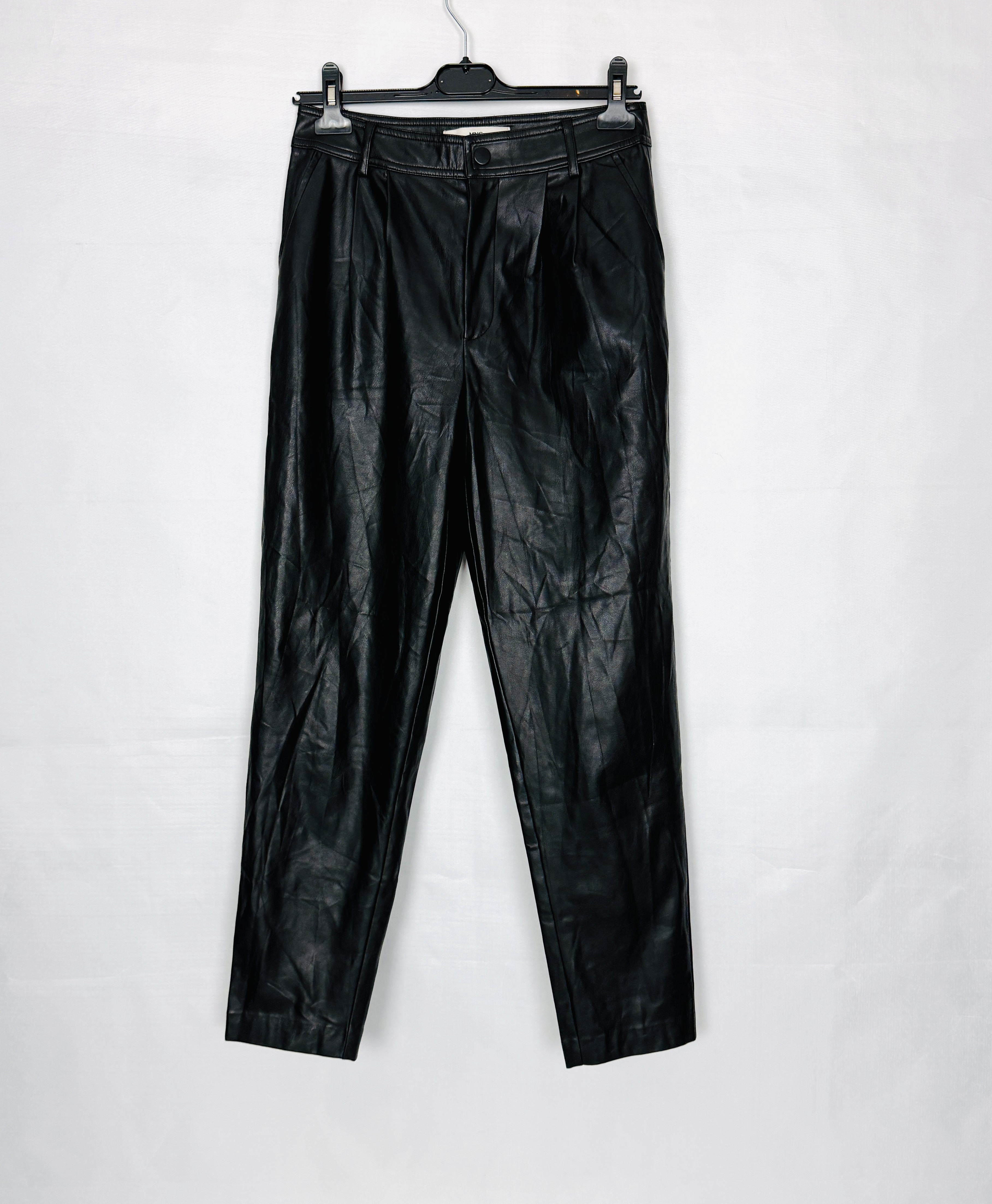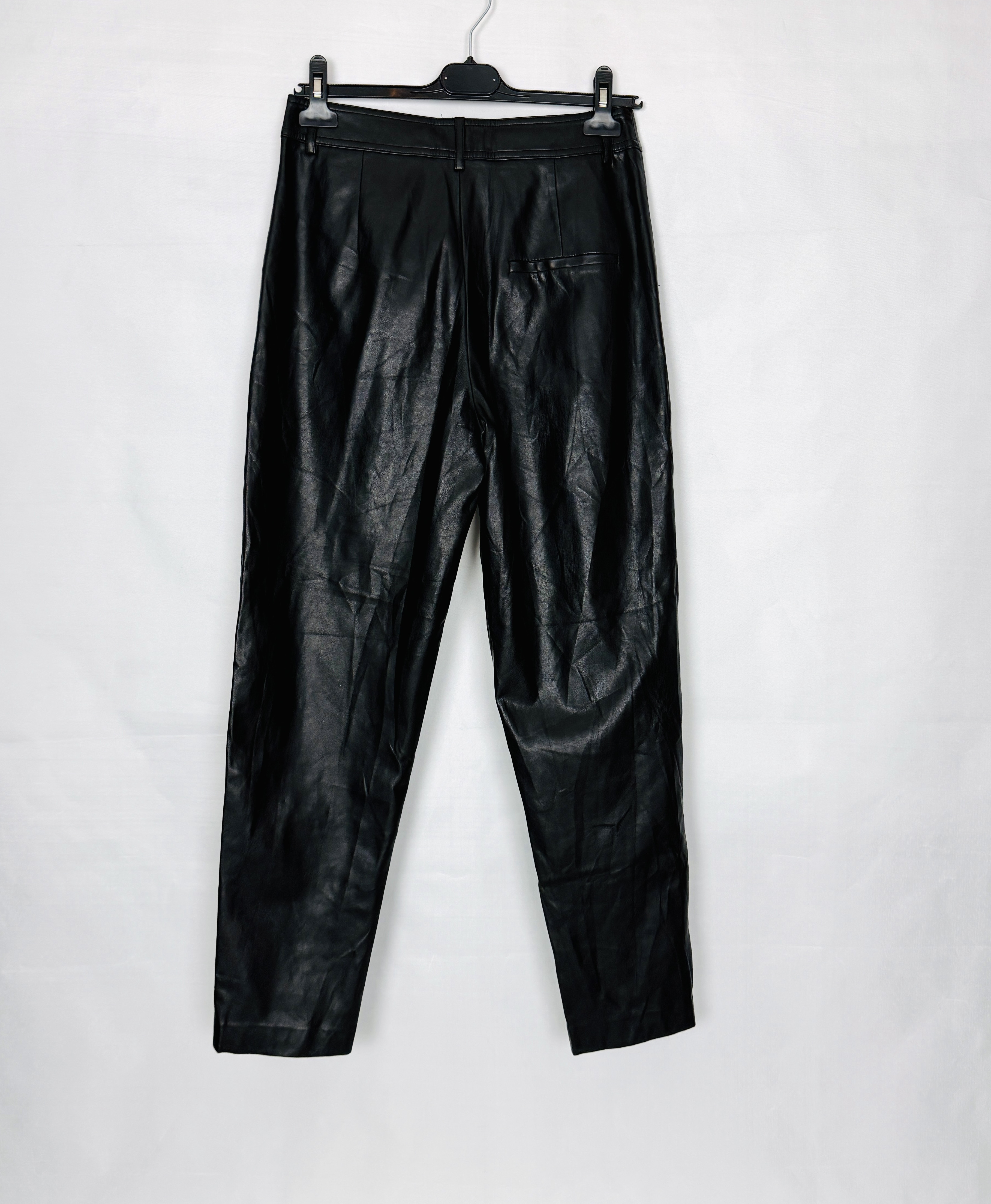 To zestawienie wyrafinowanej elegancji i swobodnej odwagi — głęboka czerń o subtelnym połysku nadaje spodniom szykownego, a jednocześnie wyrazistego charakteru. Fason łączy klasyczne elementy krawieckie z nowoczesnym, nieco nonszalanckim wykończeniem; całość sprawia wrażenie dopracowanej formy, która potrafi zarówno podkreślić kobiecą sylwetkę, jak i wprowadzić do garderoby modowy akcent z pazurem.