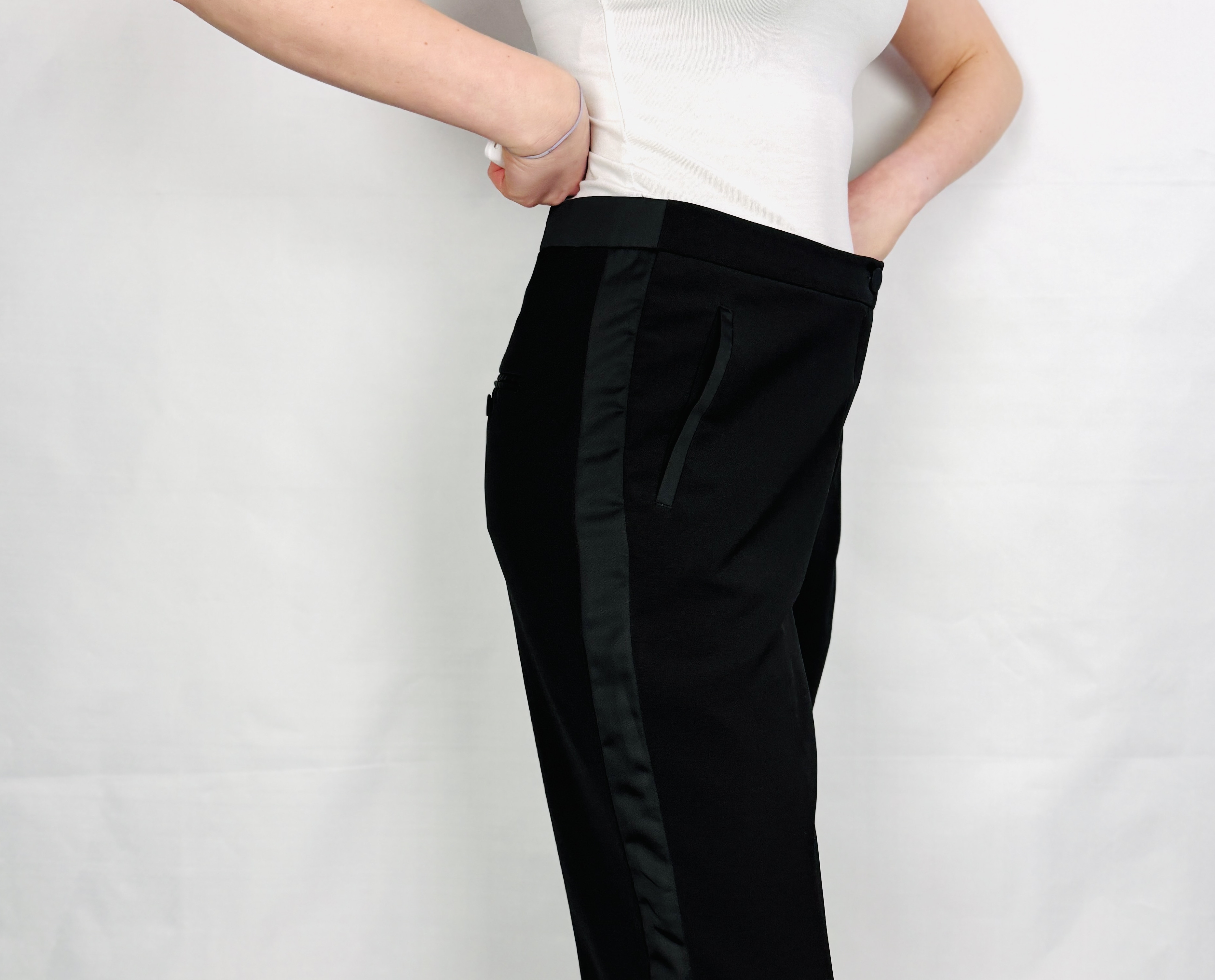 To elegancka i nowoczesna para, która łączy klasyczną dyscyplinę kroju z subtelnym, sportowym akcentem. Głęboka czerń nadaje spodniom wyrafinowanego charakteru, a wąski lampas po boku wprowadza świeży, zrównoważony kontrast — dzięki temu model ma w sobie zarówno formalną powagę, jak i nutę miejskiej lekkości. Całość sprawia wrażenie uporządkowanego szyku, który łatwo dopasować do różnych nastrojów i okazji.