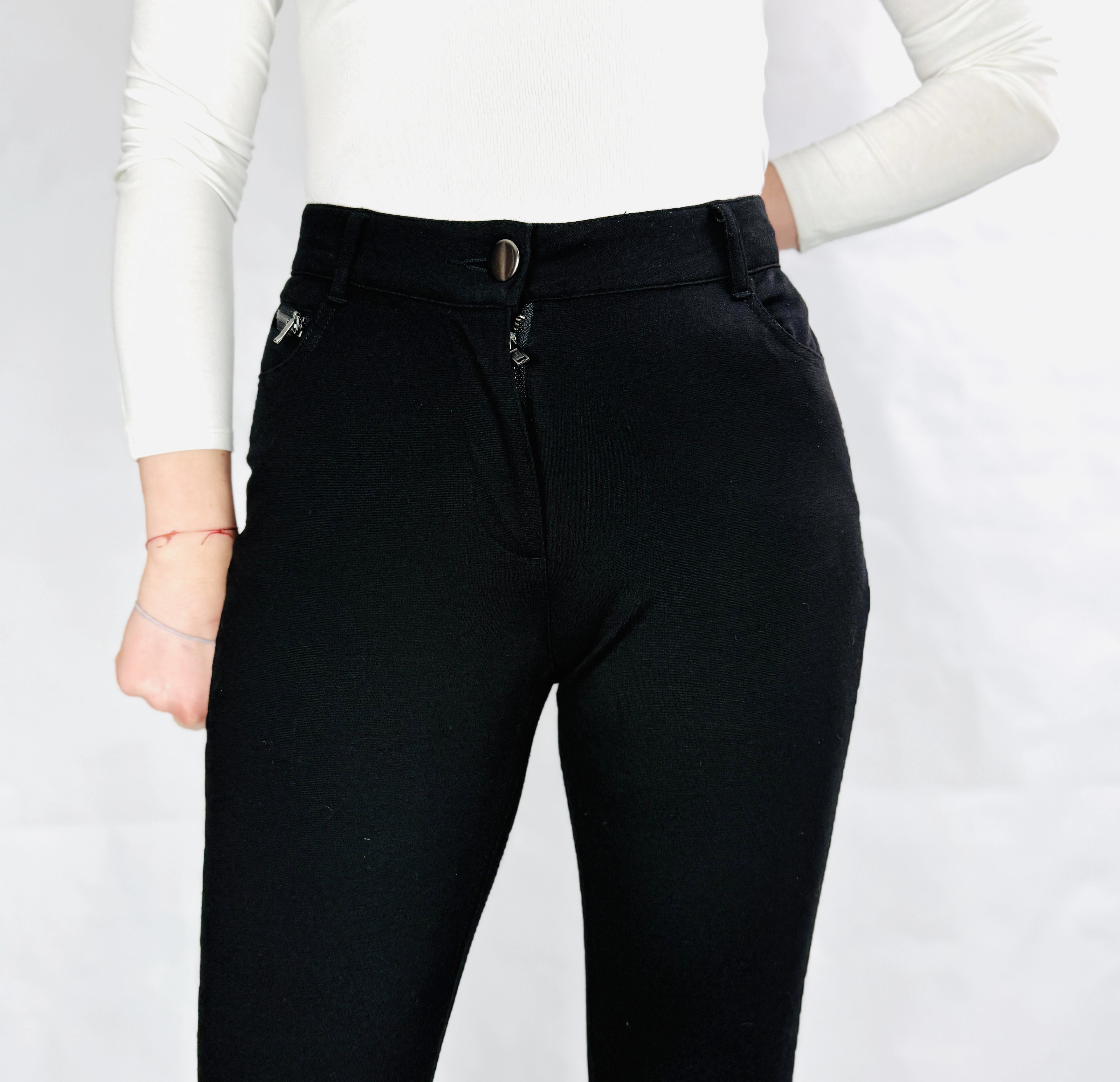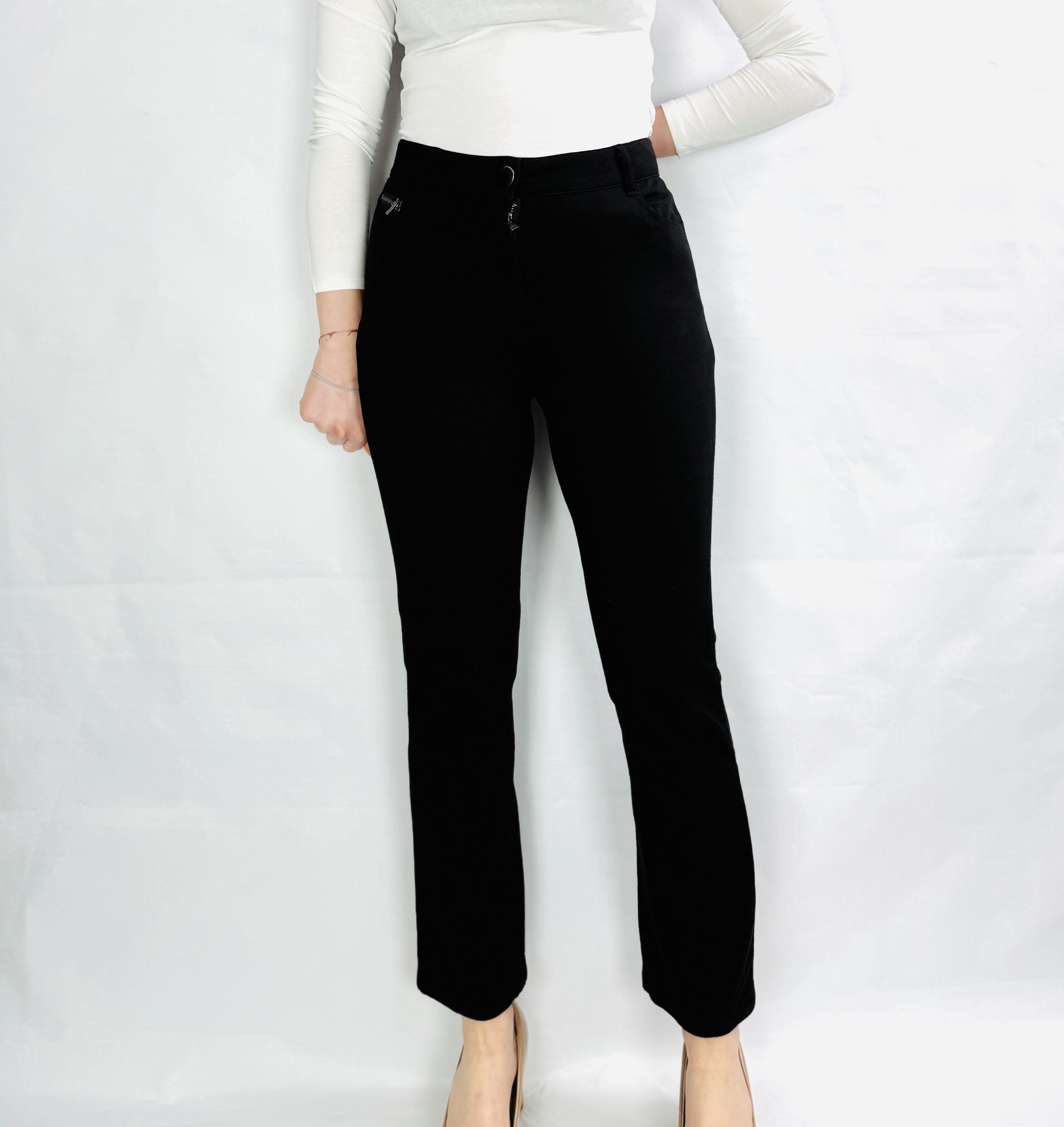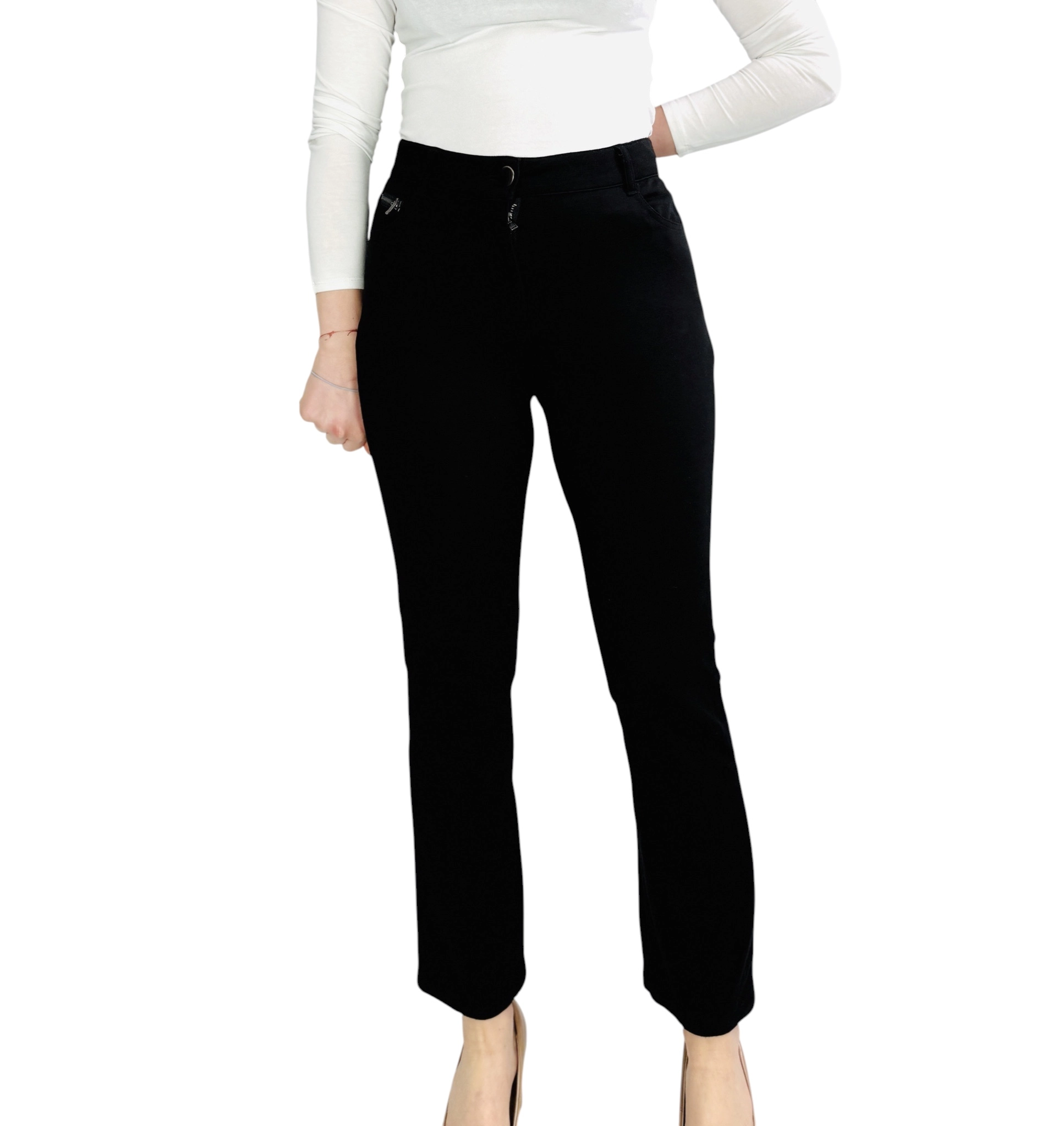 Fason spodni charakteryzuje się wysokim stanem, który perfekcyjnie zaznacza linię talii i optycznie wydłuża nogi, nadając całej sylwetce smukłości i harmonijnych proporcji. Dopasowana góra spodni miękko opina biodra, podkreślając kobiece kształty, a następnie przechodzi w prostą, lekko zwężającą się ku dołowi nogawkę, co tworzy bardzo nowoczesną i schludną linię. Klasyczny pas z zapięciem na guzik oraz subtelne detale w postaci delikatnych zamków przy kieszeniach dodają całości wyrafinowanego sznytu i biżuteryjnego akcentu. Długość nogawek sięgająca kostek pozwala na wyeksponowanie obuwia, co dodatkowo dodaje stylizacji lekkości i nowoczesnego wyrazu.