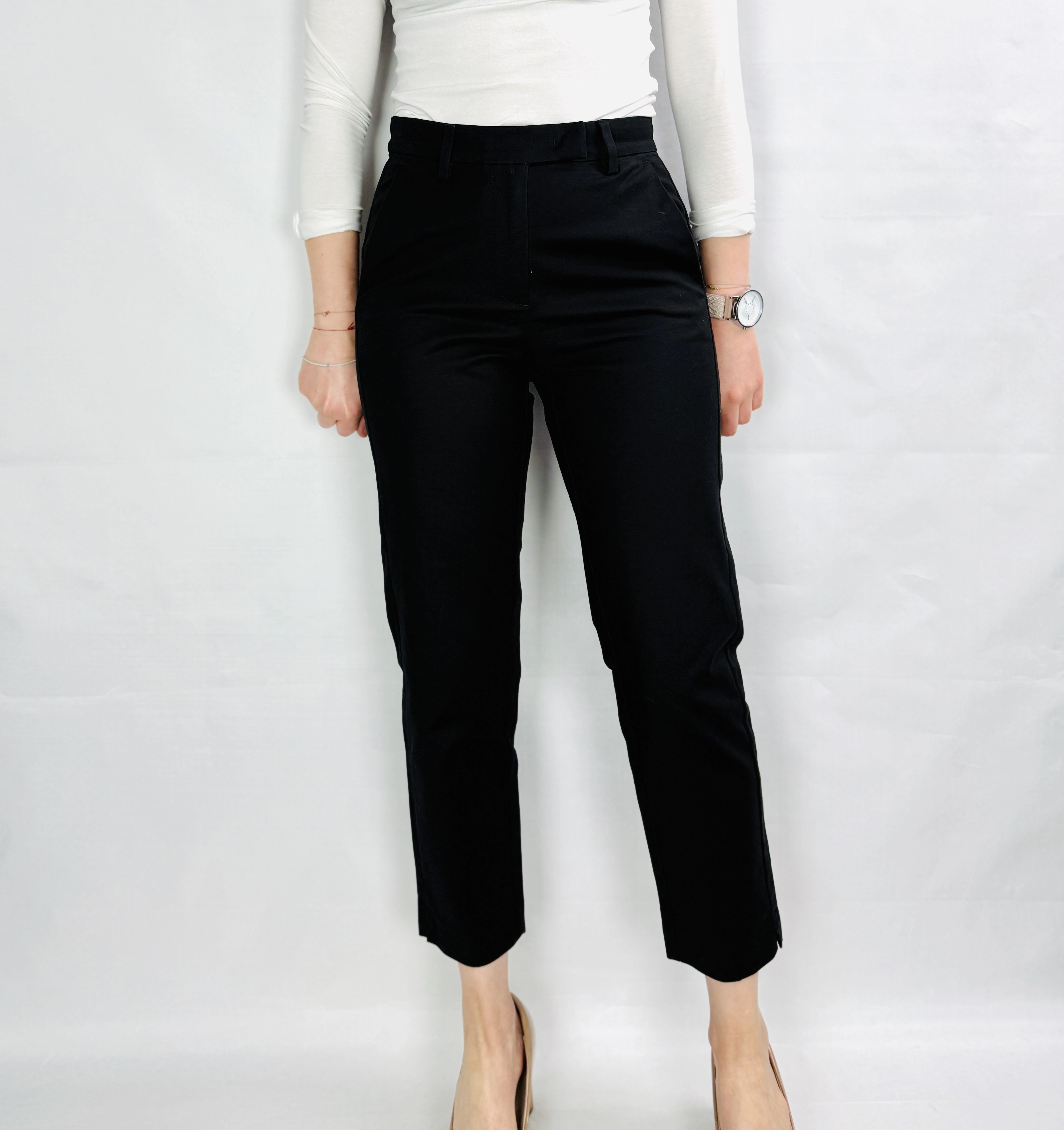 Fason spodni jest prosty, z wyraźnie zaznaczonym wysokim stanem, który modeluje talię i optycznie wydłuża nogi, nadając sylwetce harmonijnych proporcji. Materiał prezentuje się jako gładki, lekko matowy, o średniej grubości, co zapewnia komfort noszenia i swobodę ruchów przez cały dzień. Nogawki są proste, lekko zwężane ku dołowi, a długość sięga tuż nad kostkę, co pozwala na efektowne wyeksponowanie obuwia i dodaje całości nowoczesnego charakteru.