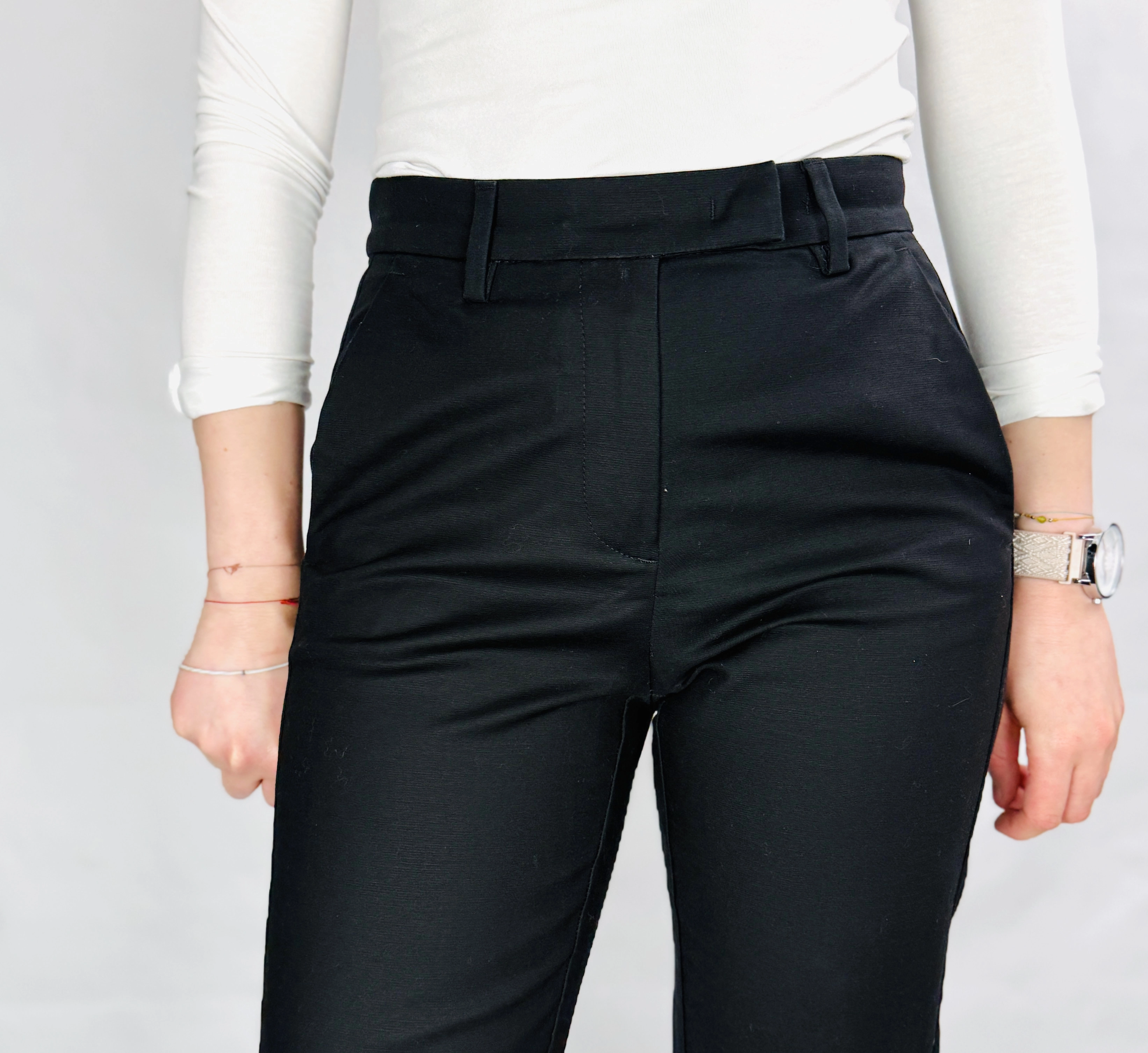 Wysoki stan spodni podkreśla talię, co sprzyja wysmukleniu sylwetki i zbalansowaniu proporcji, szczególnie u kobiet o figurze klepsydry i prostokąta. Prosty krój nogawek nie dodaje objętości, dzięki czemu spodnie subtelnie modelują nogi, zachowując przy tym naturalną linię sylwetki. To fason, który łączy w sobie elegancję i funkcjonalność, idealny dla kobiet ceniących klasykę z nutą nowoczesności.