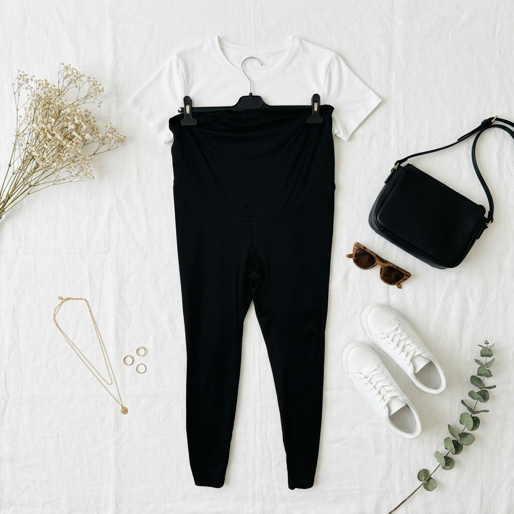 W stylizacjach sprawdzą się świetnie w codziennych i aktywnych zestawach: połączysz je z jasnym topem lub miękkim T‑shirtem i sportowym biustonoszem, na spacer z puchową kurtką i sneakersami, a w domu z dłuższym kardiganem dla komfortowego, domowego looku. Czerń pięknie współgra z bielą i kremem widocznymi na górze, a także z głębszymi tonami — bordo, granat czy oliwkowa zieleń nadadzą stylizacji dodatkowej głębi. To para stworzona z myślą o codziennym komforcie przyszłej mamy, która nie rezygnuje z estetyki.