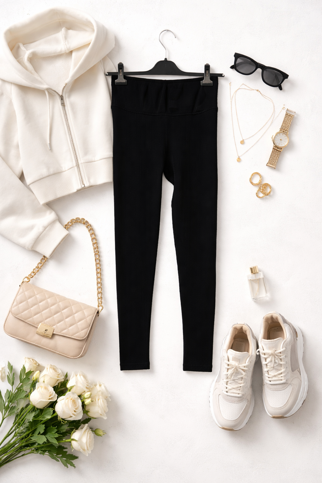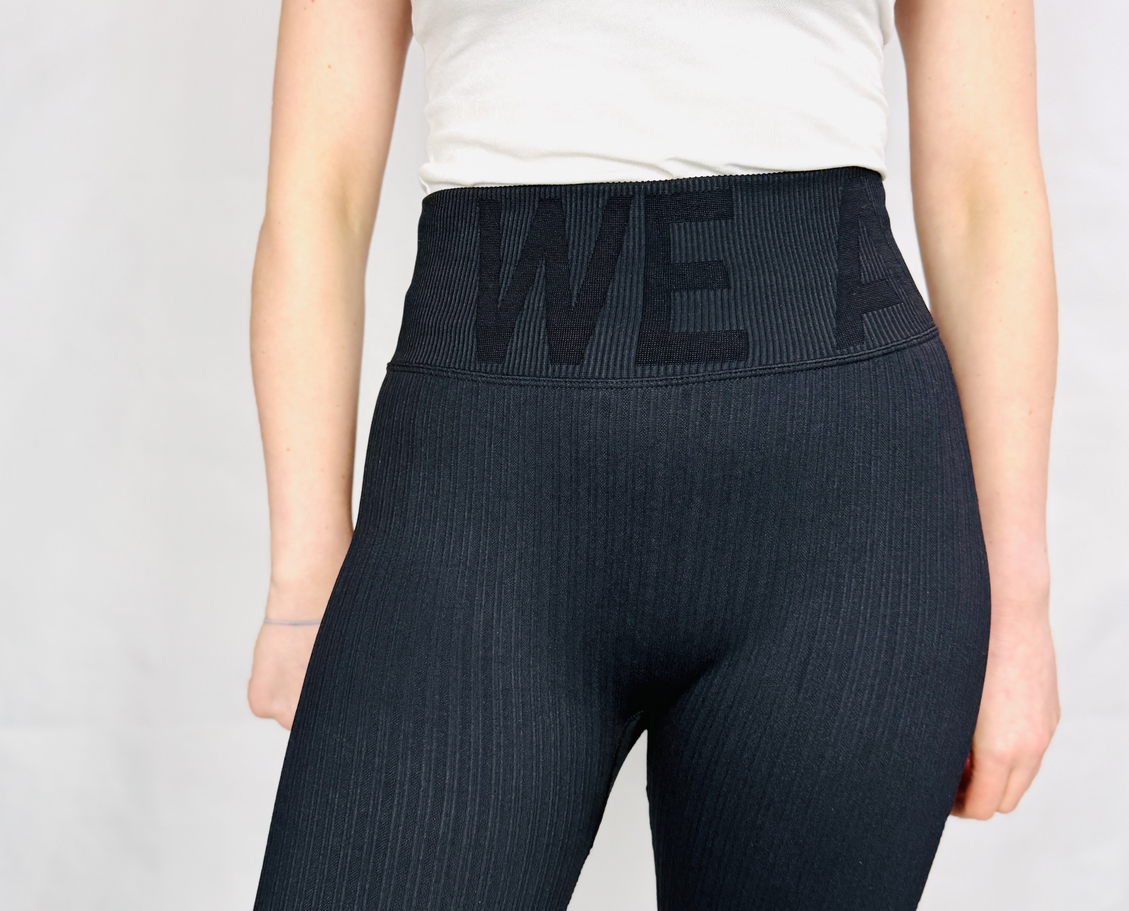 Materiał prezentuje się jako elastyczny i gładki, lekko przylegający do ciała i miękko układający się w ruchu. Tkanina ma sprężystość pozwalającą na swobodę wykonywania dynamicznych ćwiczeń, jednocześnie oferując efekt delikatnego modelowania sylwetki. Prążkowana faktura dodaje całości subtelnej głębi i dyskretnie maskuje drobne nierówności, dzięki czemu legginsy wyglądają zadbanie i schludnie przez cały dzień.