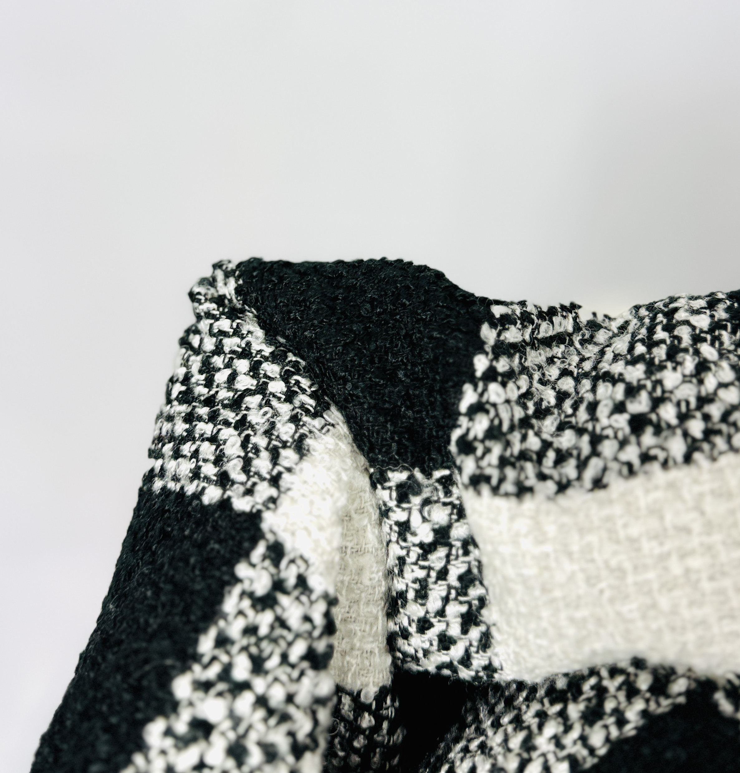 Wzór to wyraźne, równe pola kratki w dwóch kontrastujących barwach, ustawione symetrycznie w całej powierzchni spódnicy; takie zestawienie optycznie porządkuje sylwetkę i nadaje tkaninie graficznego rytmu. Materiał prezentuje się jako strukturalny i nieco grubszy, o mięsistej, lekko pętelkowej fakturze, która dodaje całości przytulnego, sezonowego charakteru. Powierzchnia tkaniny zdaje się mieć subtelną głębię i trzyma formę, co podkreśla rzemieślnicze wykończenie i nadaje spódnicy eleganckiego wyrazu.