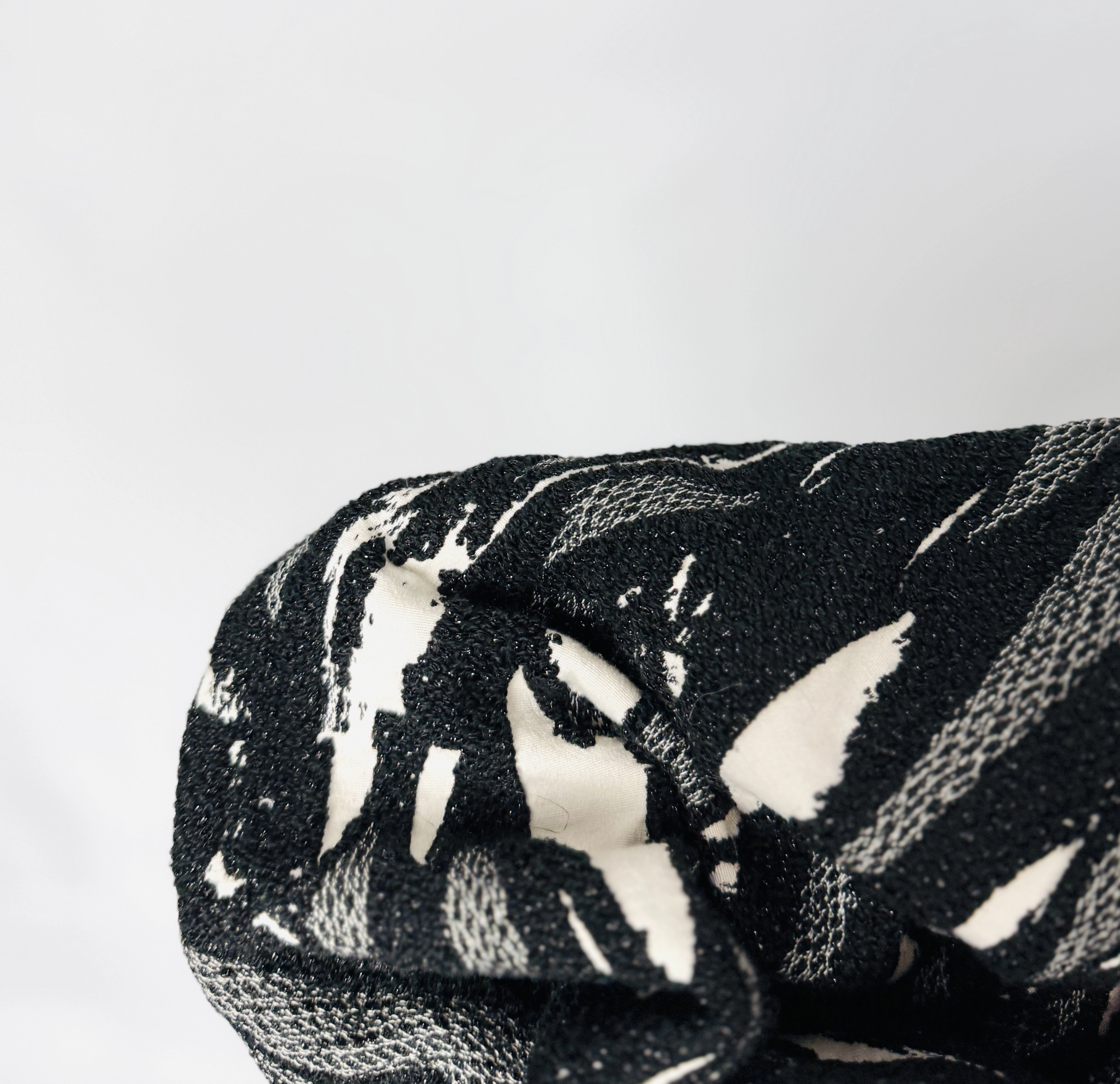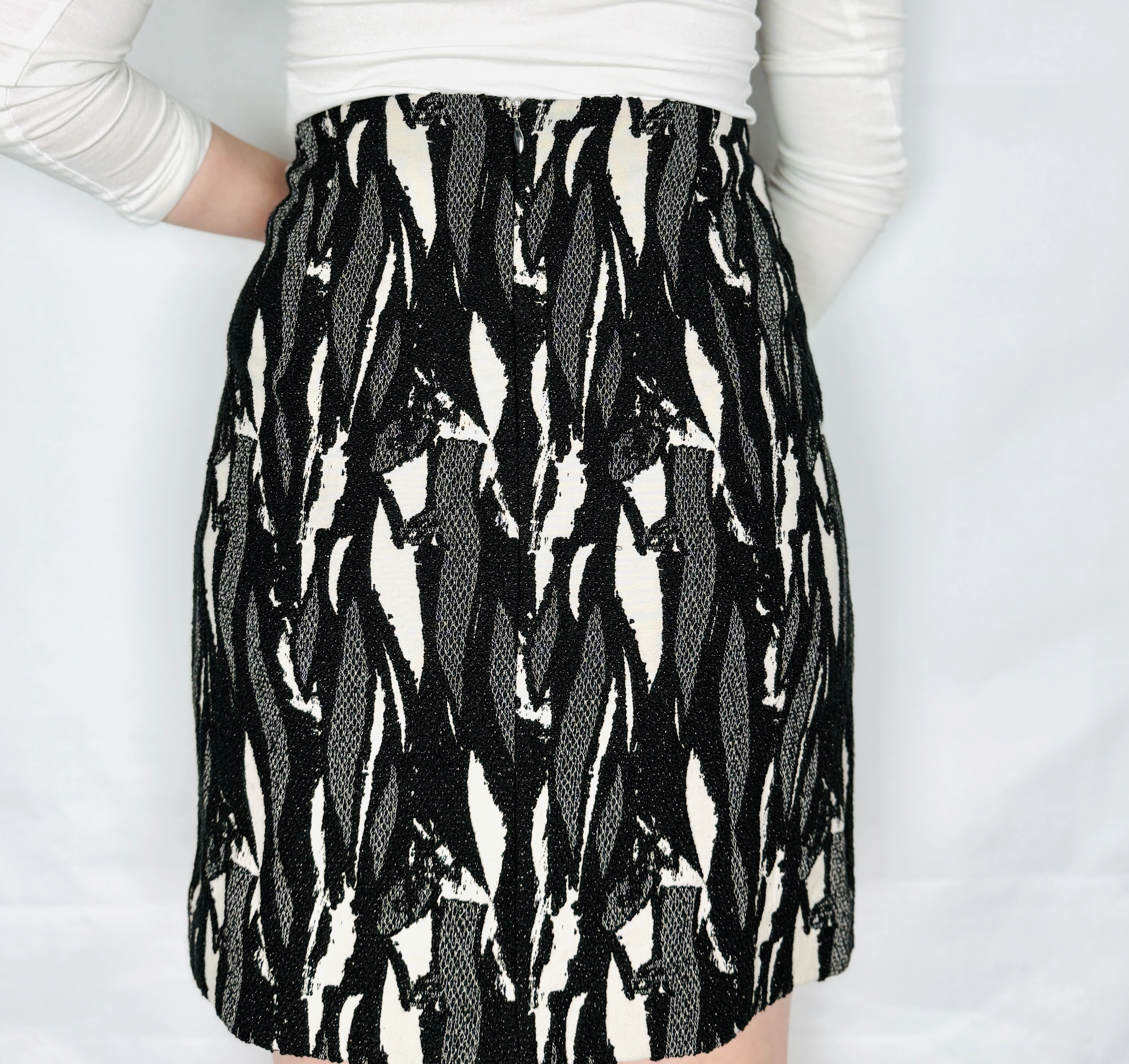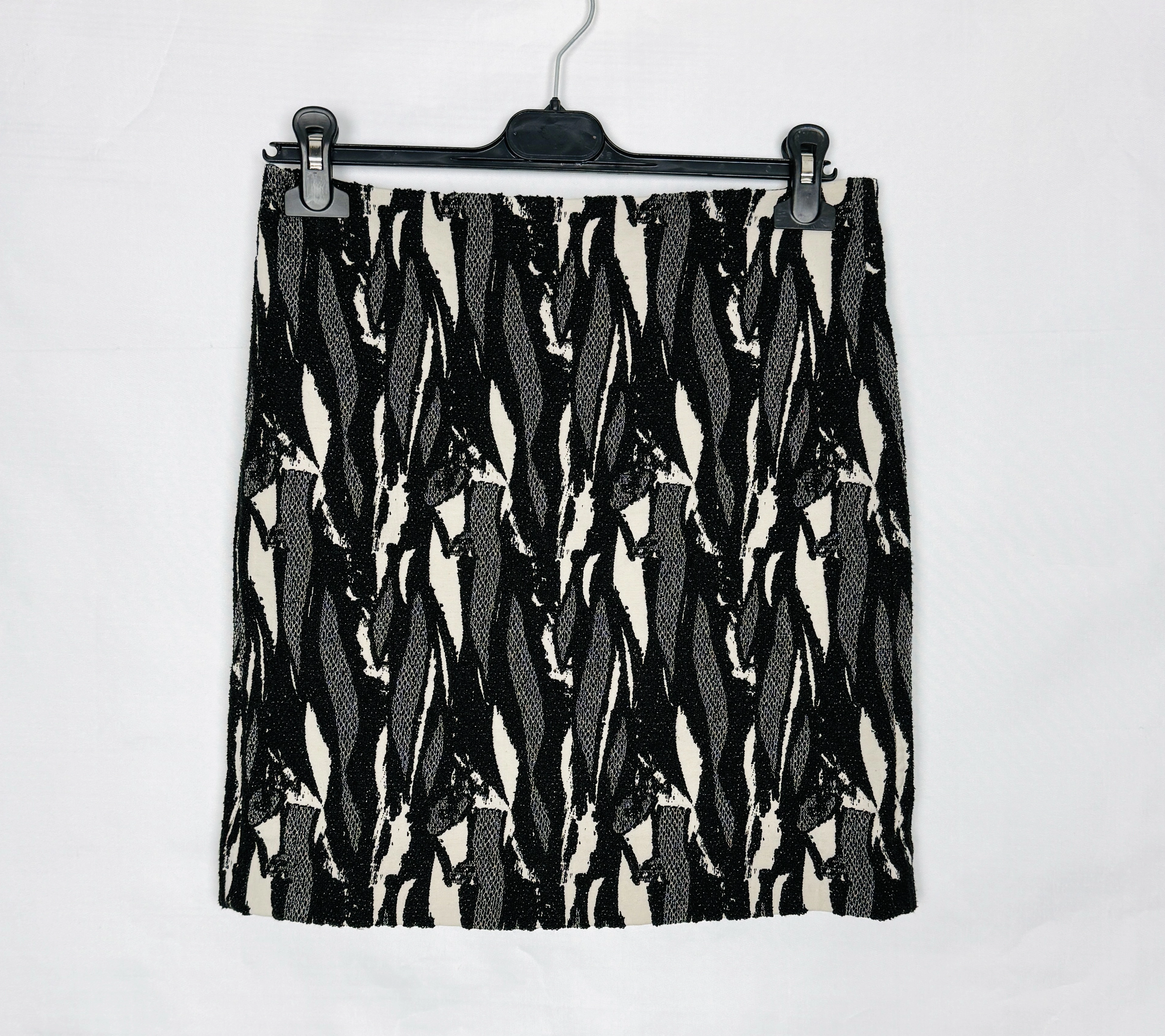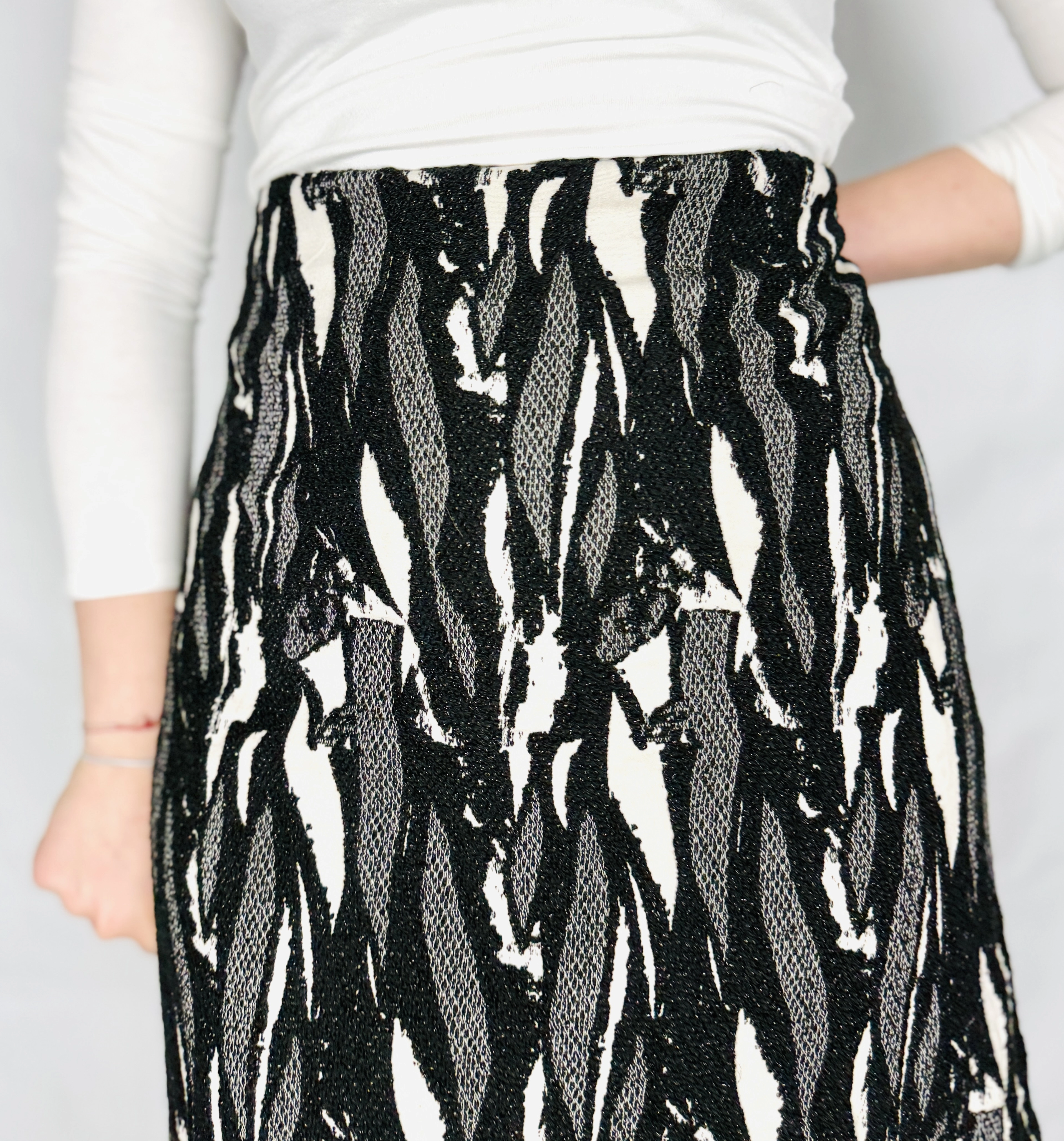 Ta spódnica to fascynujące połączenie nowoczesnej energii i wyrafinowanego stylu, który natychmiast przyciąga wzrok swoim natchnionym, dynamicznym wzorem. Kontrastowe zestawienie głębokiej czerni z ciepłym, kremowym beżem tworzy kompozycję pełną nastrojowej głębi, która radosnie wpisuje się w najnowsze trendy miejskiej elegancji. To projekt, który emanuje pewnością siebie i radosnym podejściem do mody, nienagannie łącząc artystyczny nieład desenia z uporządkowaną, klasyczną formą, co czyni go nastrojową bazą dla kobiet poszukujących ubrań z radosną duszą.
