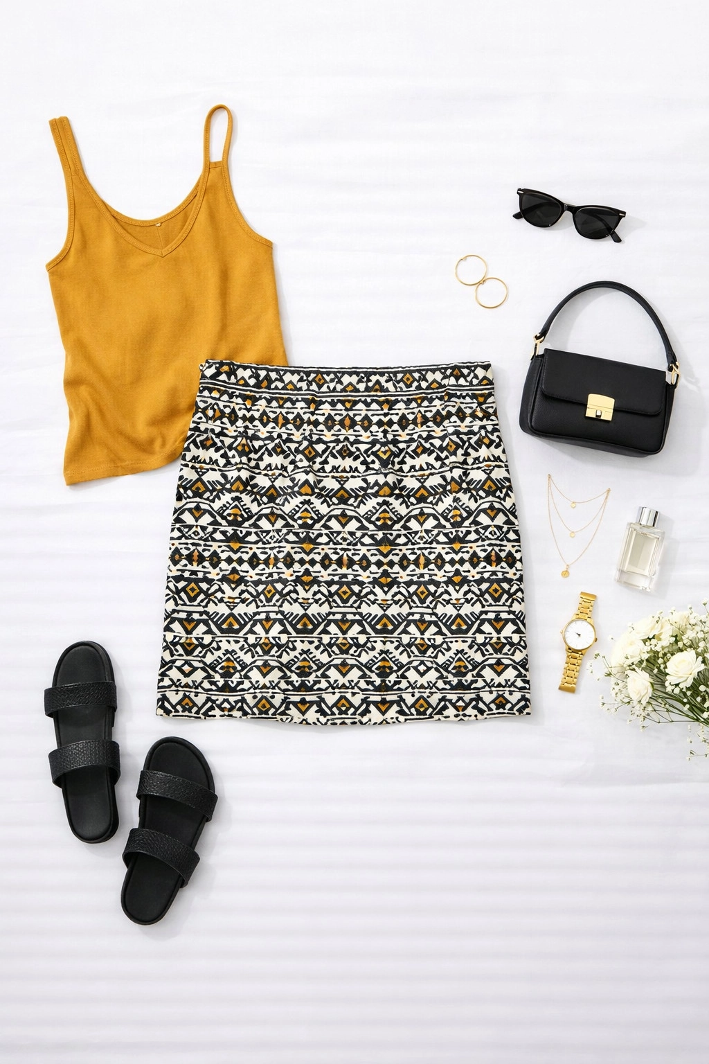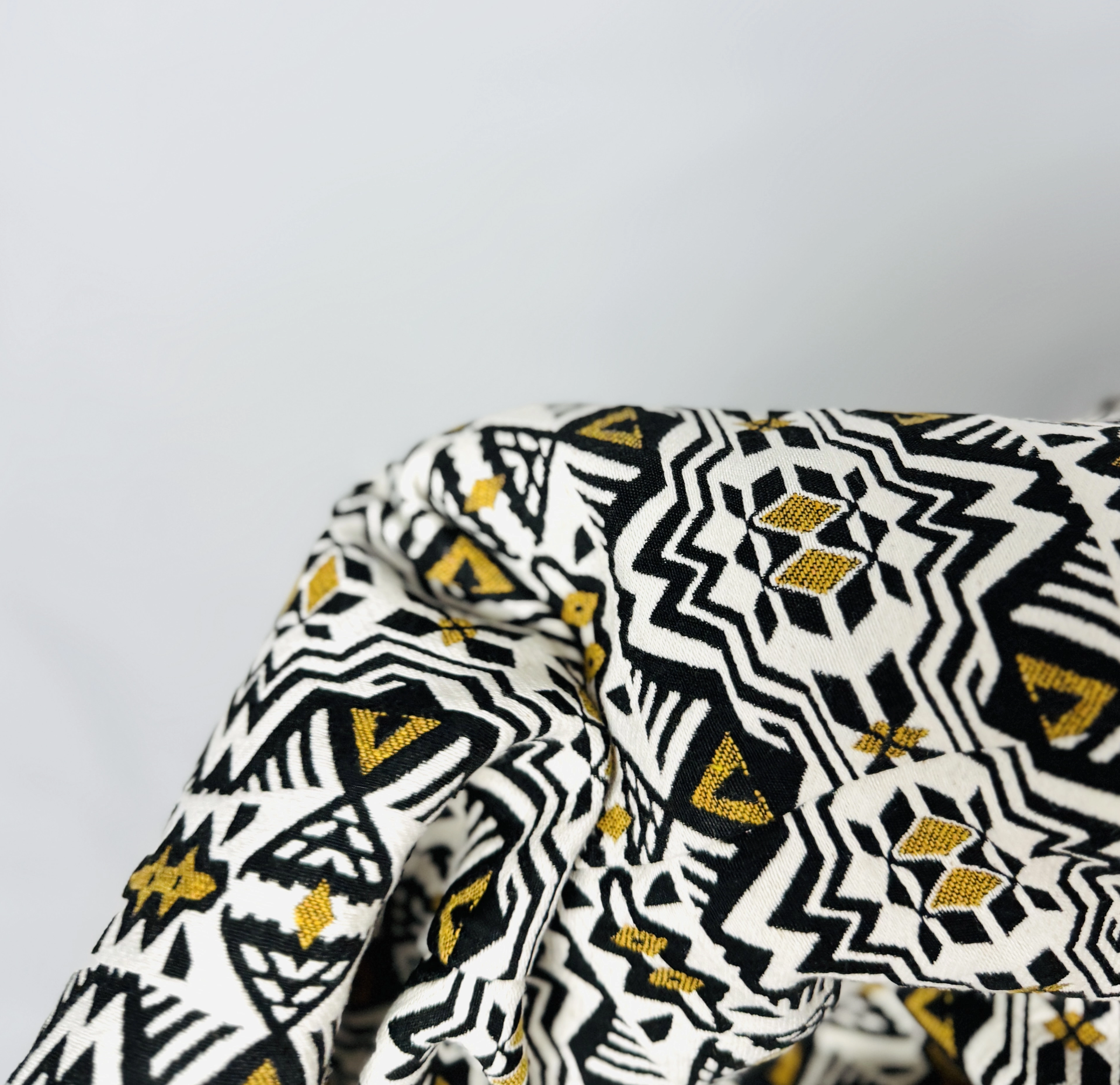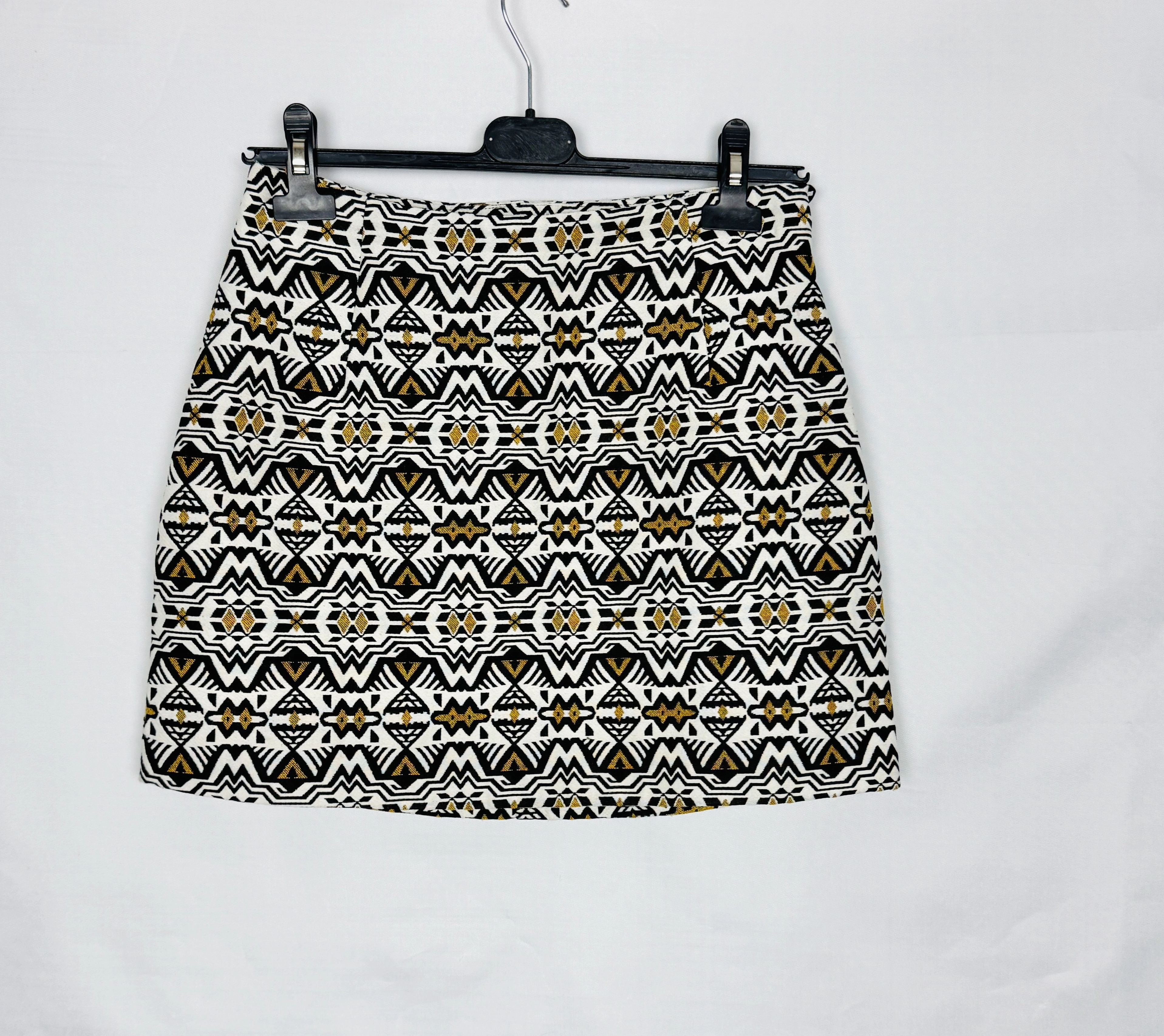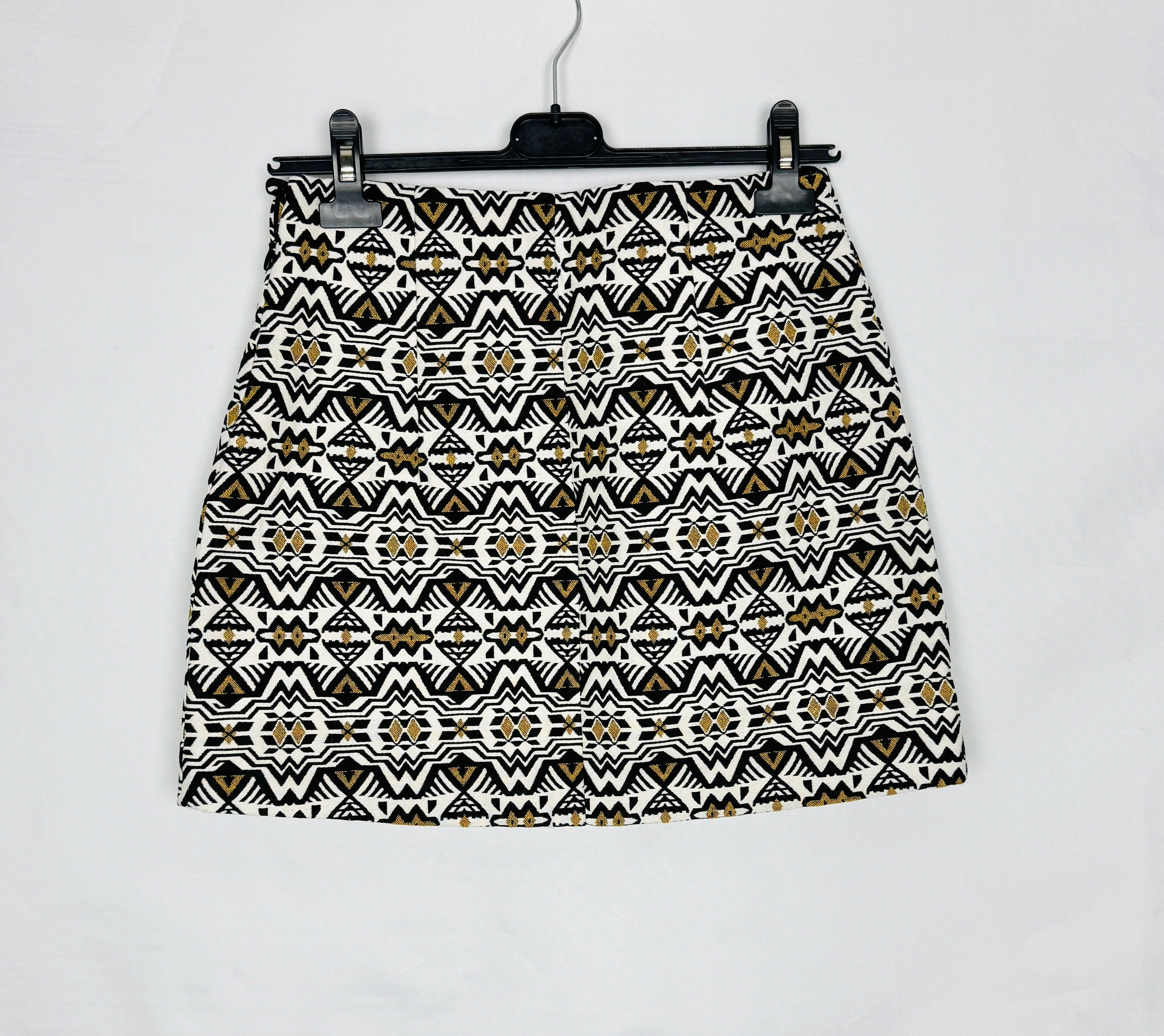Ta spódnica zachwyca wyrazistym, geometrycznym wzorem, który nadaje stylizacji charakteru i nowoczesnej energii. Kontrast czerni i jasnego beżu tworzy mocny, ale jednocześnie elegancki efekt, przywodzący na myśl styl inspirowany etnicznymi motywami w bardziej uporządkowanej, miejskiej odsłonie. To model, który od razu przyciąga uwagę i stanowi wyrazisty element każdej stylizacji, jednocześnie pozostając bardzo stylowym i kobiecym.