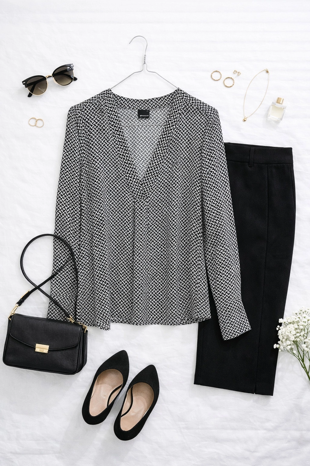 Długość całkowita bluzki sięga do linii bioder, co daje szerokie pole do stylizacyjnych eksperymentów. Prezentuje się nienagannie wpuszczona w klasyczne, czarne spodnie rurki lub eleganckie cygaretki, co tworzy spójny, wysmuklający efekt wizualny idealny do pracy. Równie efektownie będzie wyglądać w zestawieniu ze spódnicą ołówkową i czółenkami na wysokim obcasie, tworząc zestaw pełen klasy na wieczorne wyjście. Geometryczny, czarno-biały wzór świetnie komponuje się z minimalistyczną złotą lub srebrną biżuterią, która podkreśli nowoczesny charakter całości. Jest to produkt stworzony dla kobiet szukających balansu między modową odwagą a ponadczasową elegancją, gwarantujący poczucie pewności siebie w każdej sytuacji.